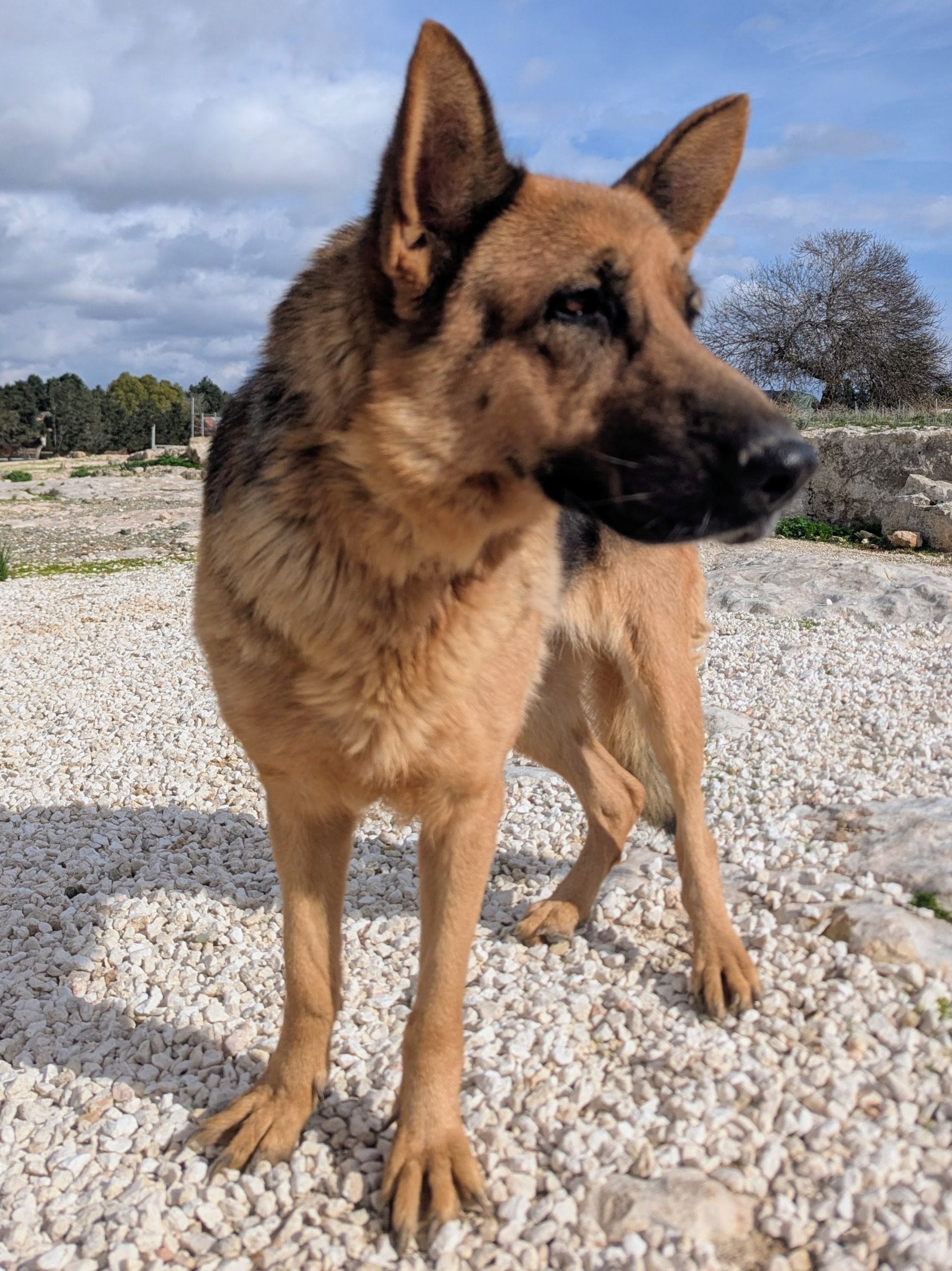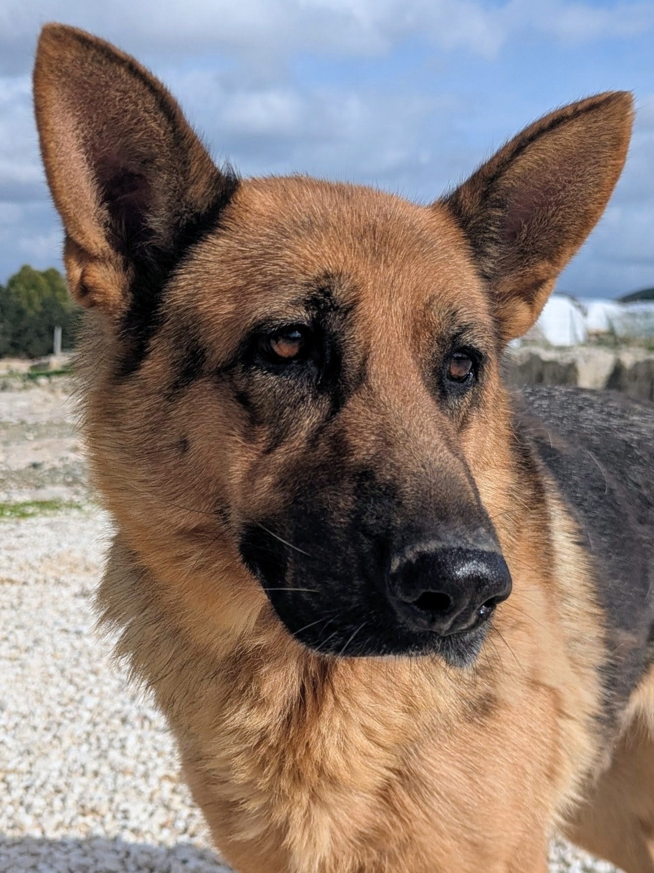 Big-sized mid-aged German shepherd female, classic brown and black coat. Calm, super friendly, and affectionate. Cats tolerable