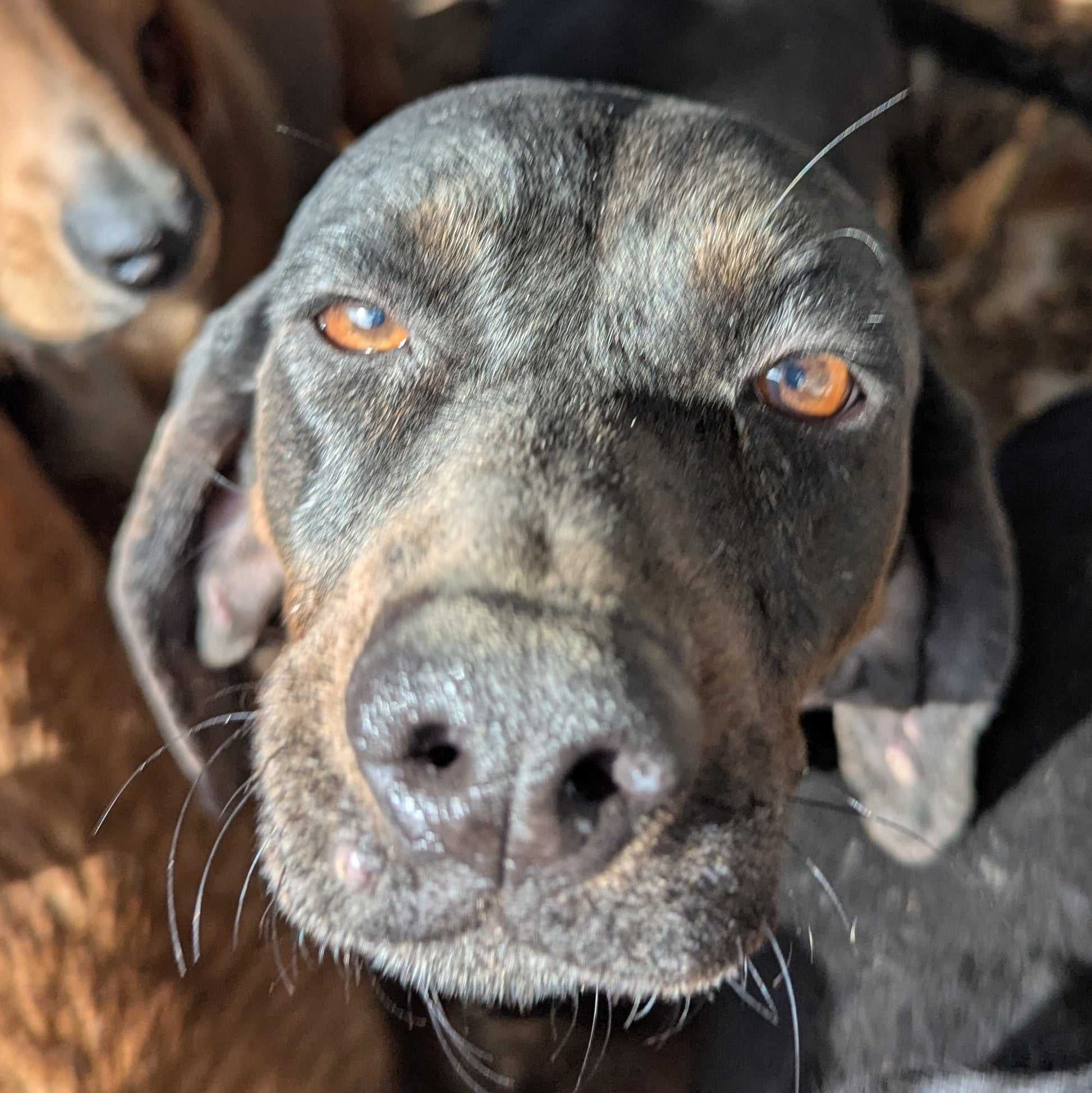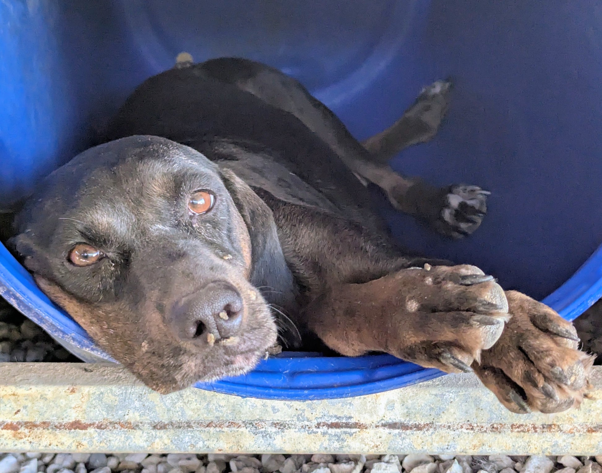 Среднего размера собака в возрасте. Далекий метис питбуля, темно-серого цвета. Имеет немного лишнего веса. Любит прятаться в укрытии. Дружелюбна к человеку