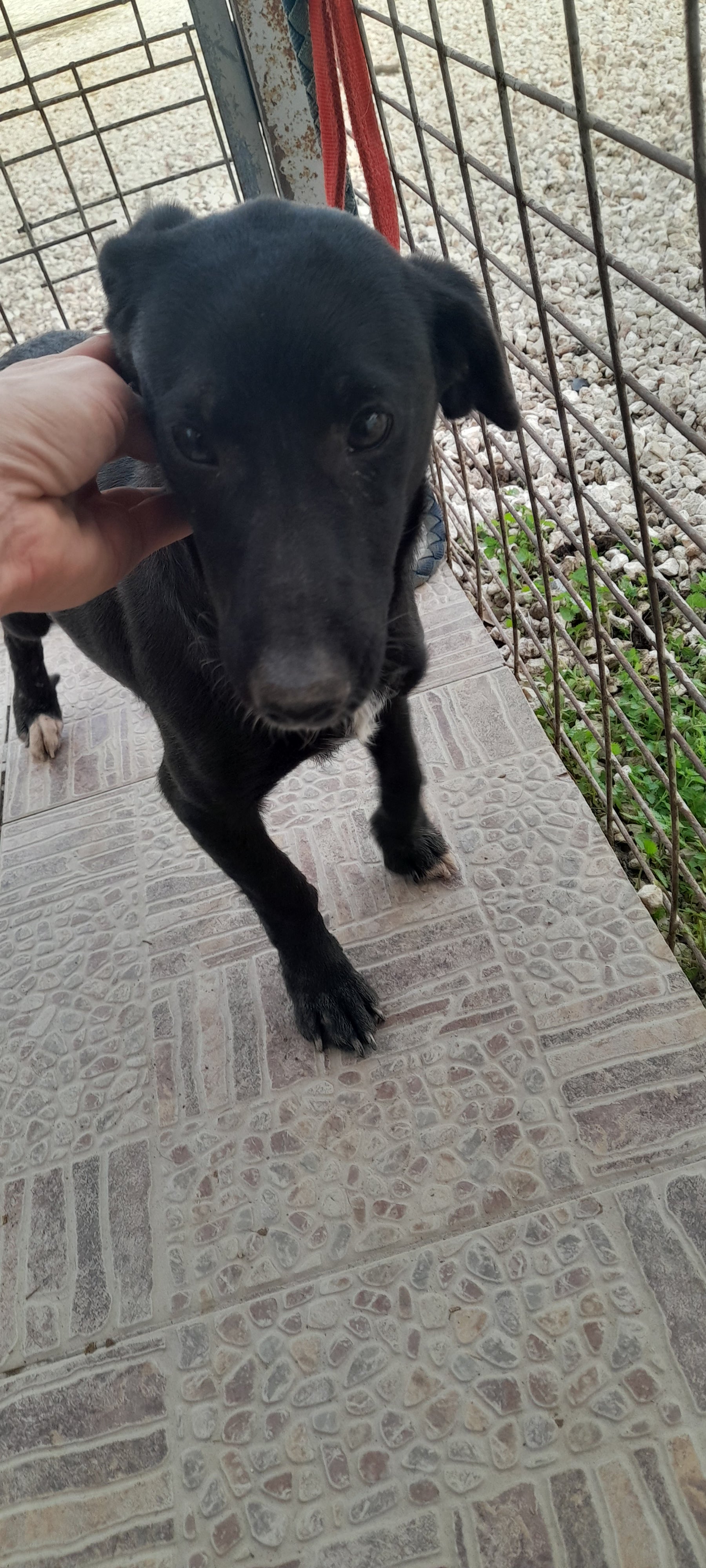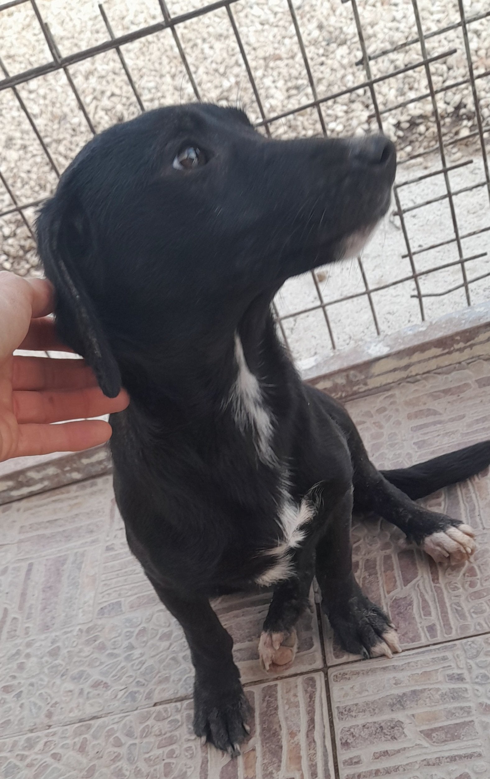Sweet character, playful, friendly. Small-sized pretty girl, black with little white chest and all toes except right front are white.