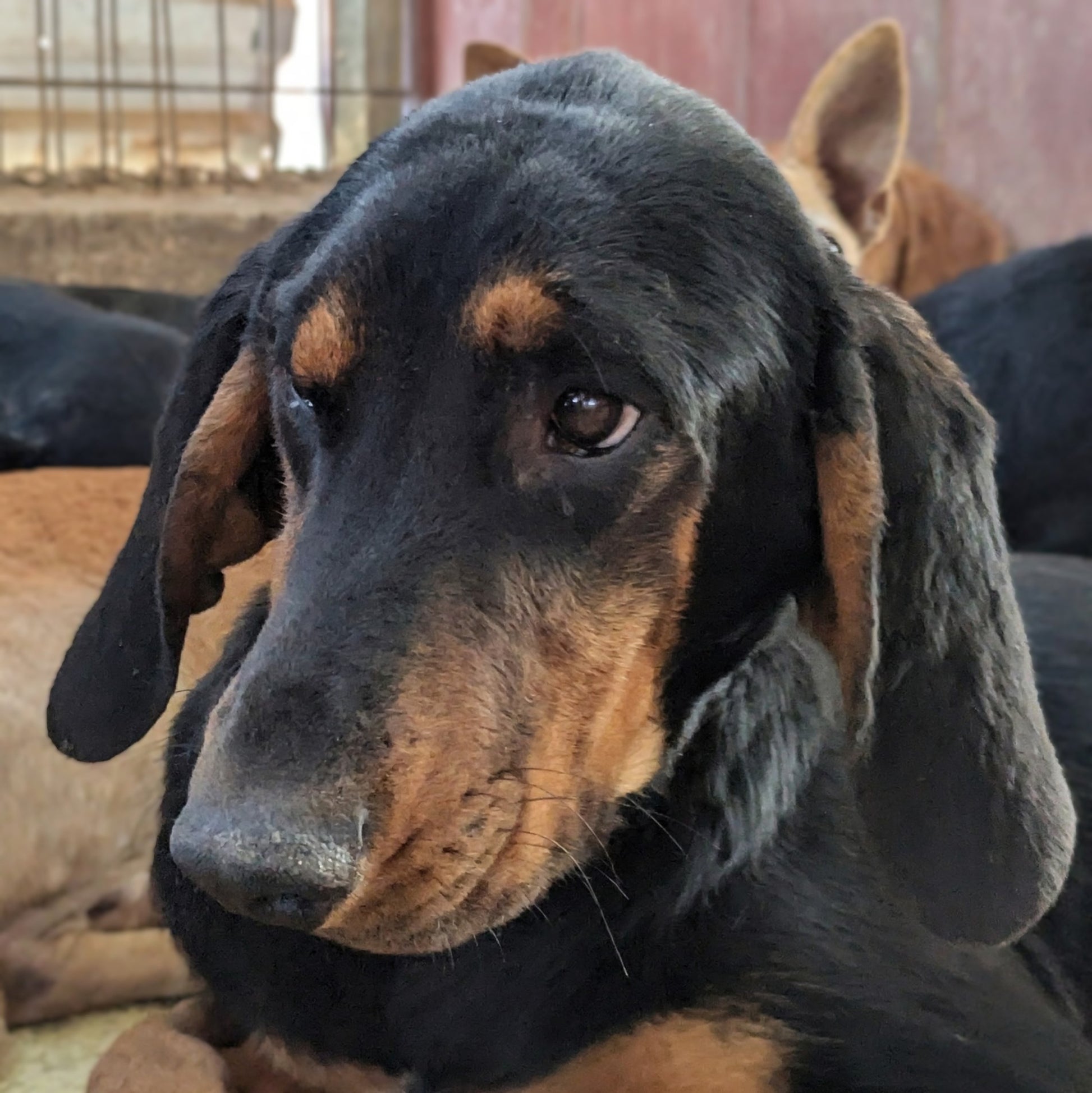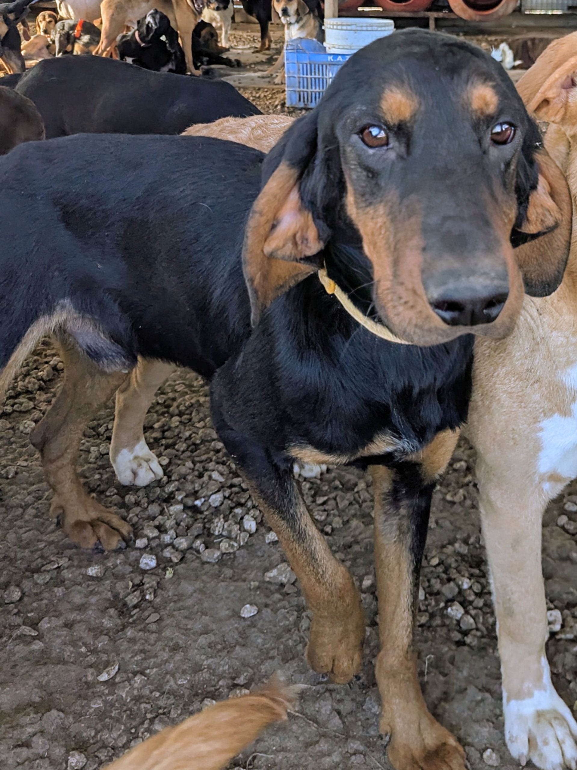 Medium-sized young hunter cross male, black and tan
