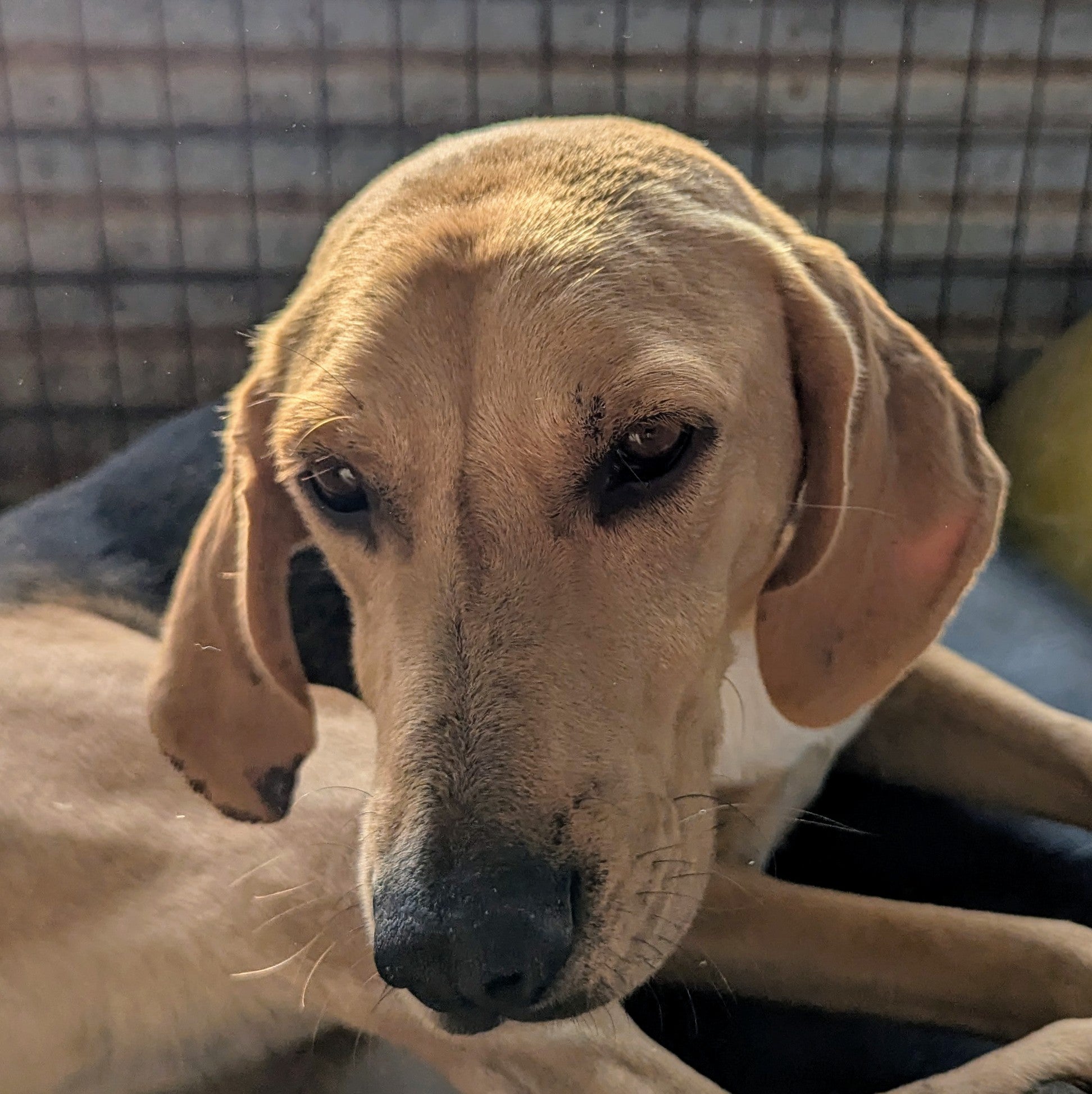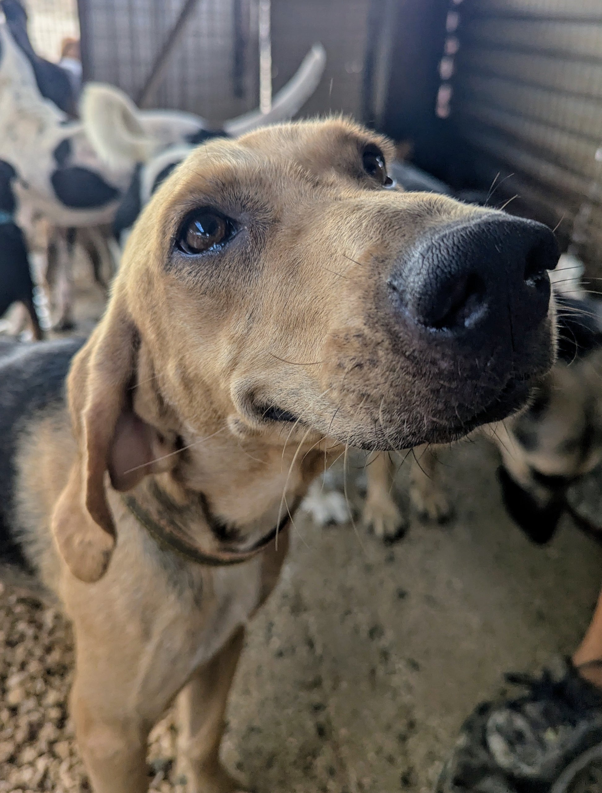 Среднего размера мальчик метис охотничей породы. Окрас светло-коричневый, серый с белым. Бывает задирист