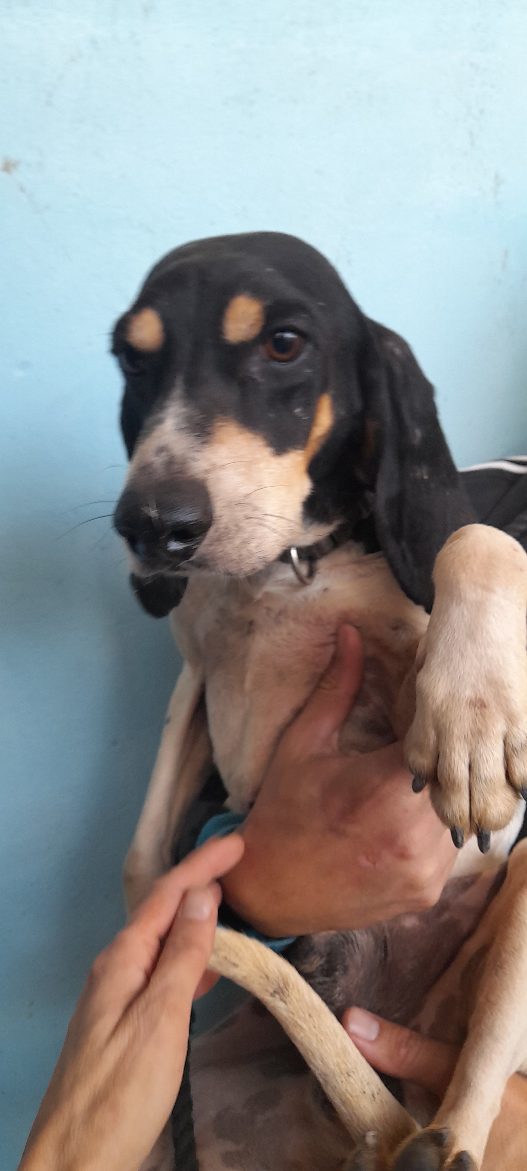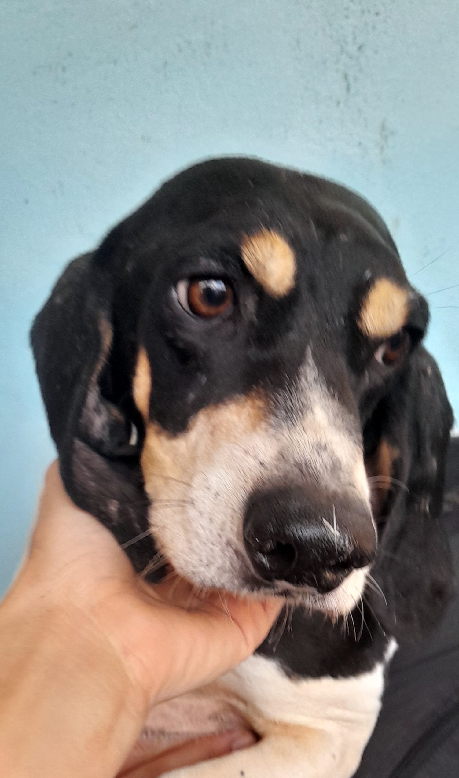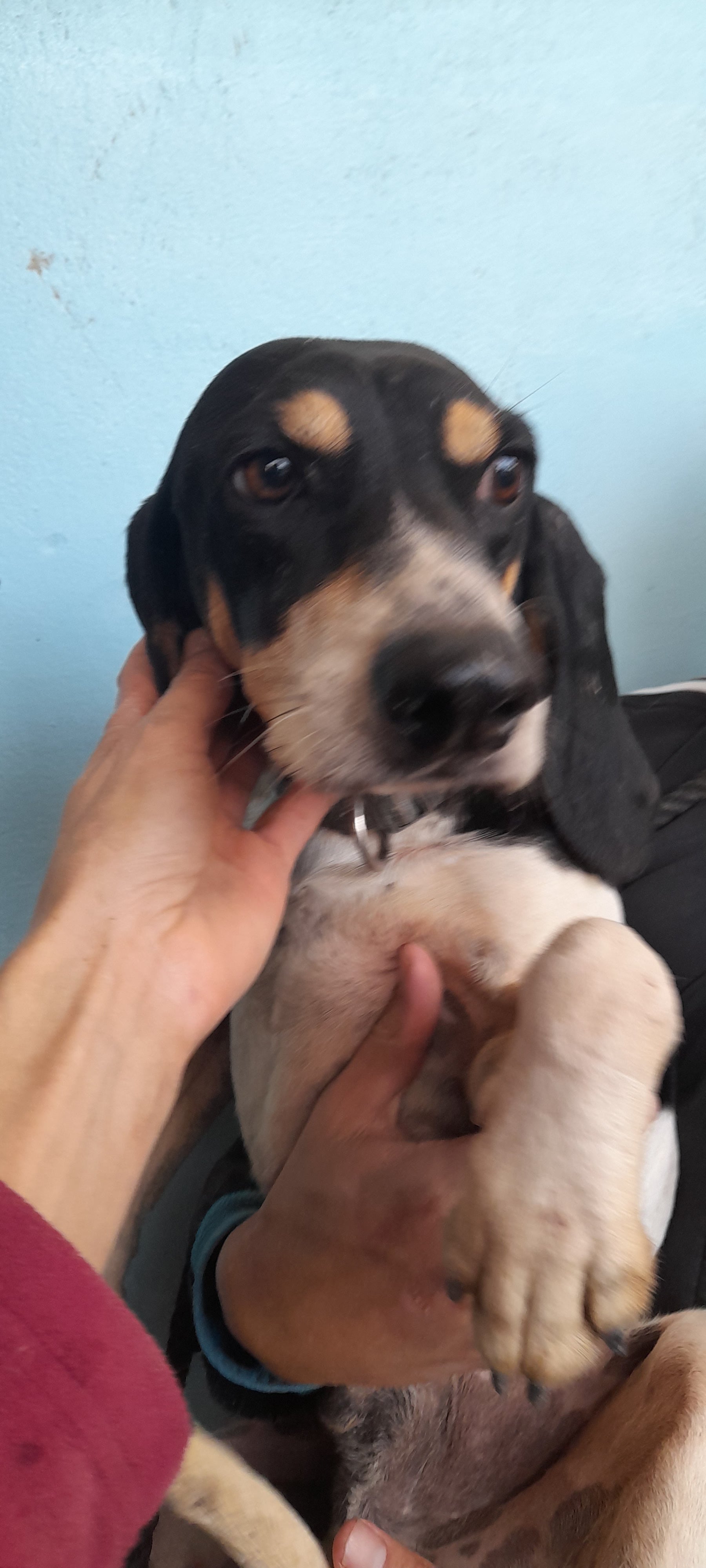 Small, handsome tri-coloured hunter boy who craves to be with people. Very active, will do everything to go out for a walk or to play. Very affectionate boy.