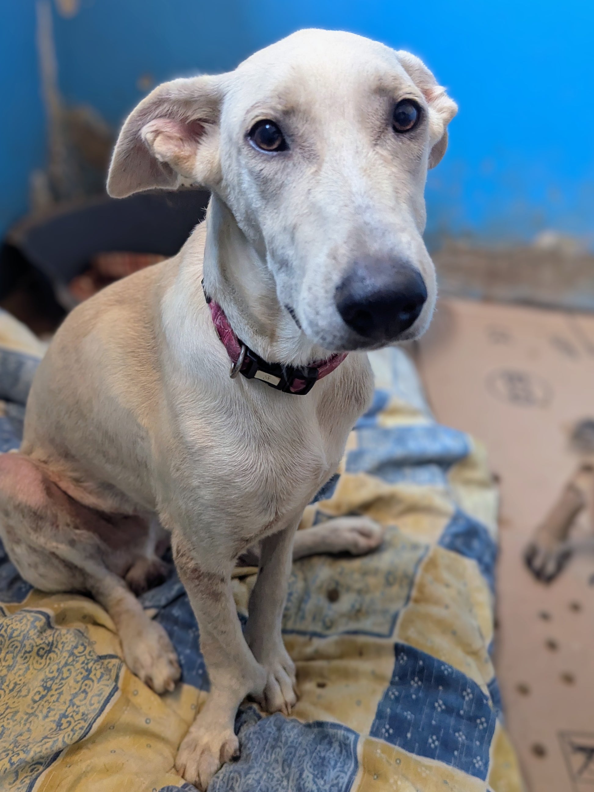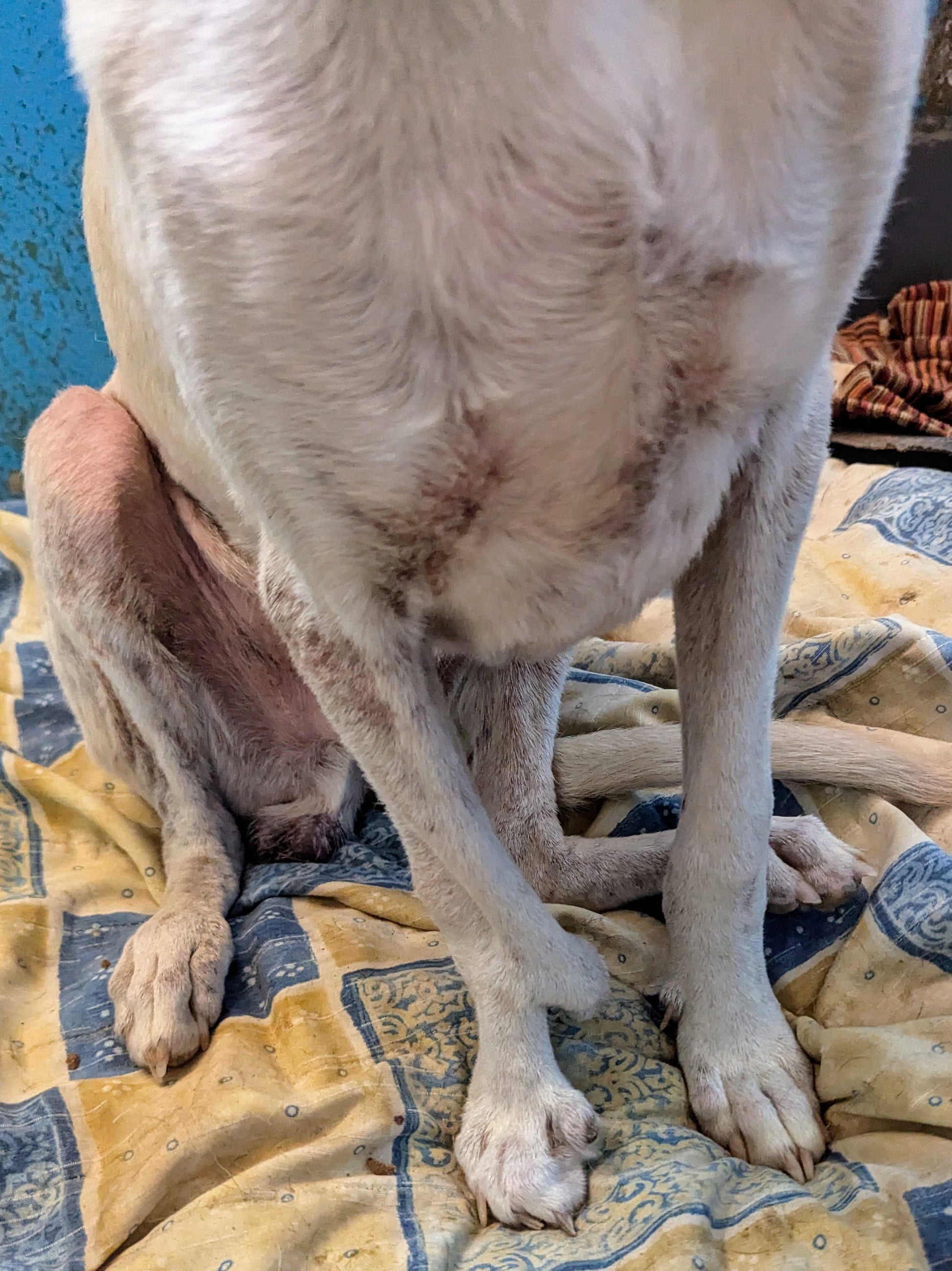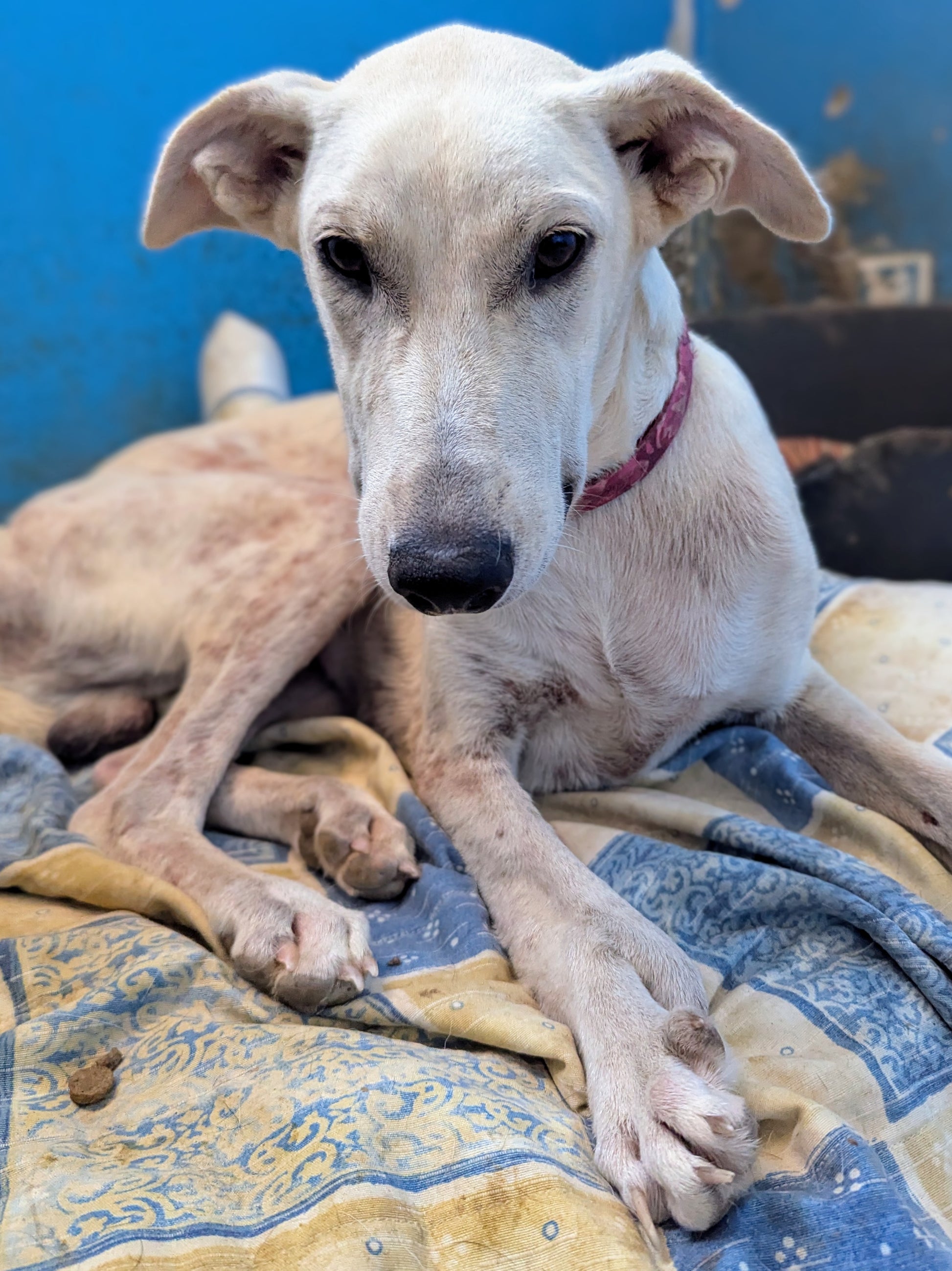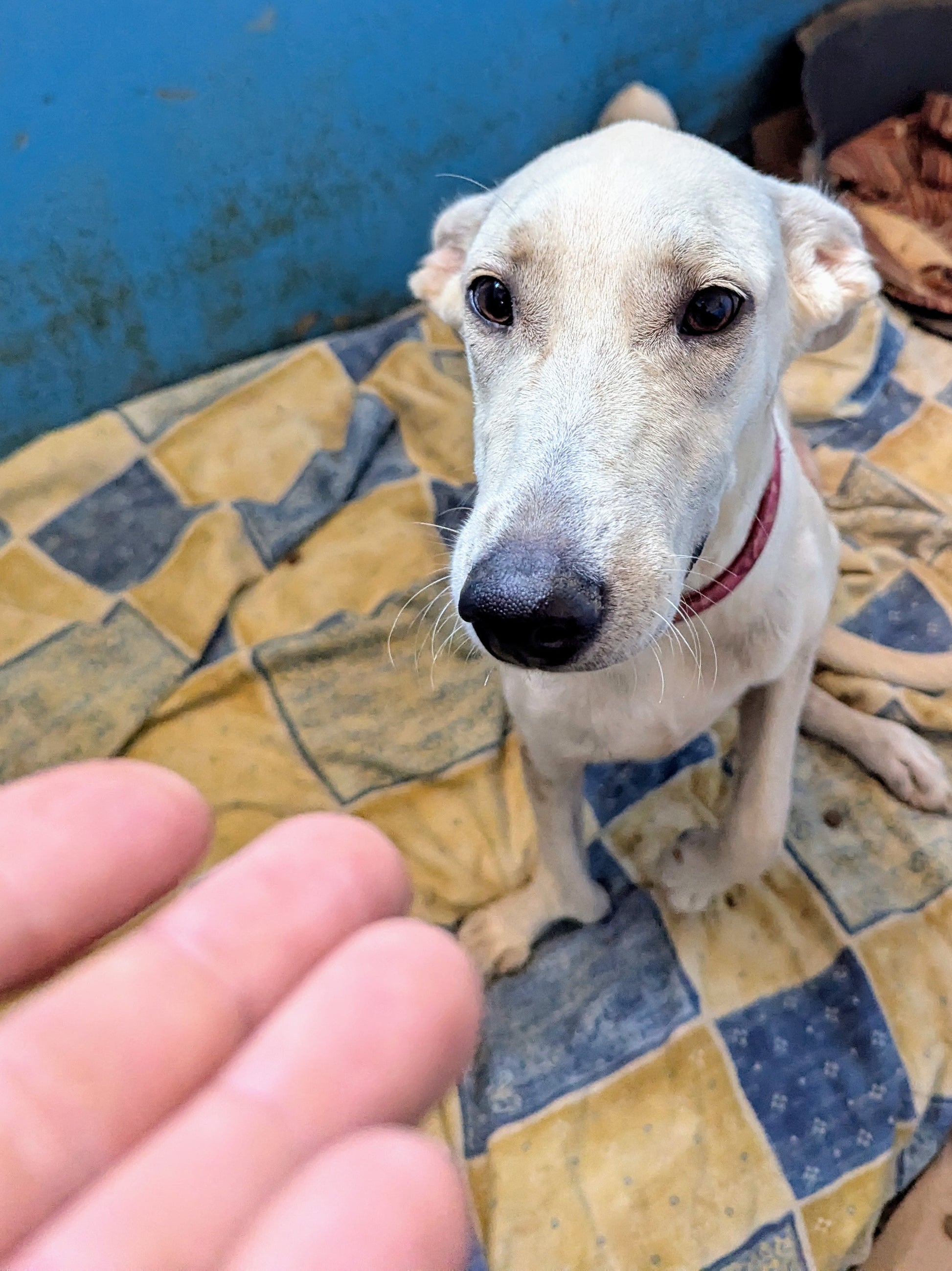 Medium-sized young male with a white coat and his own little twist – his front leg healed in a quirky way after a break. Cute, gentle and friendly