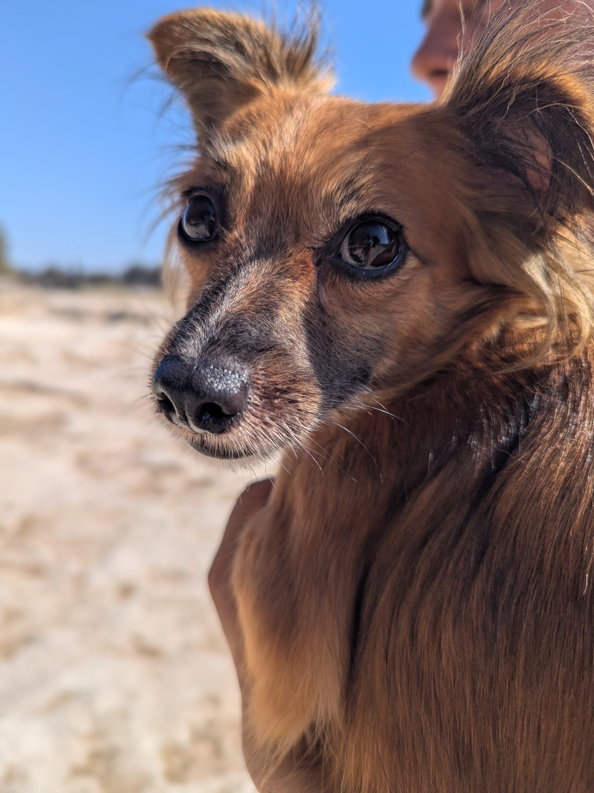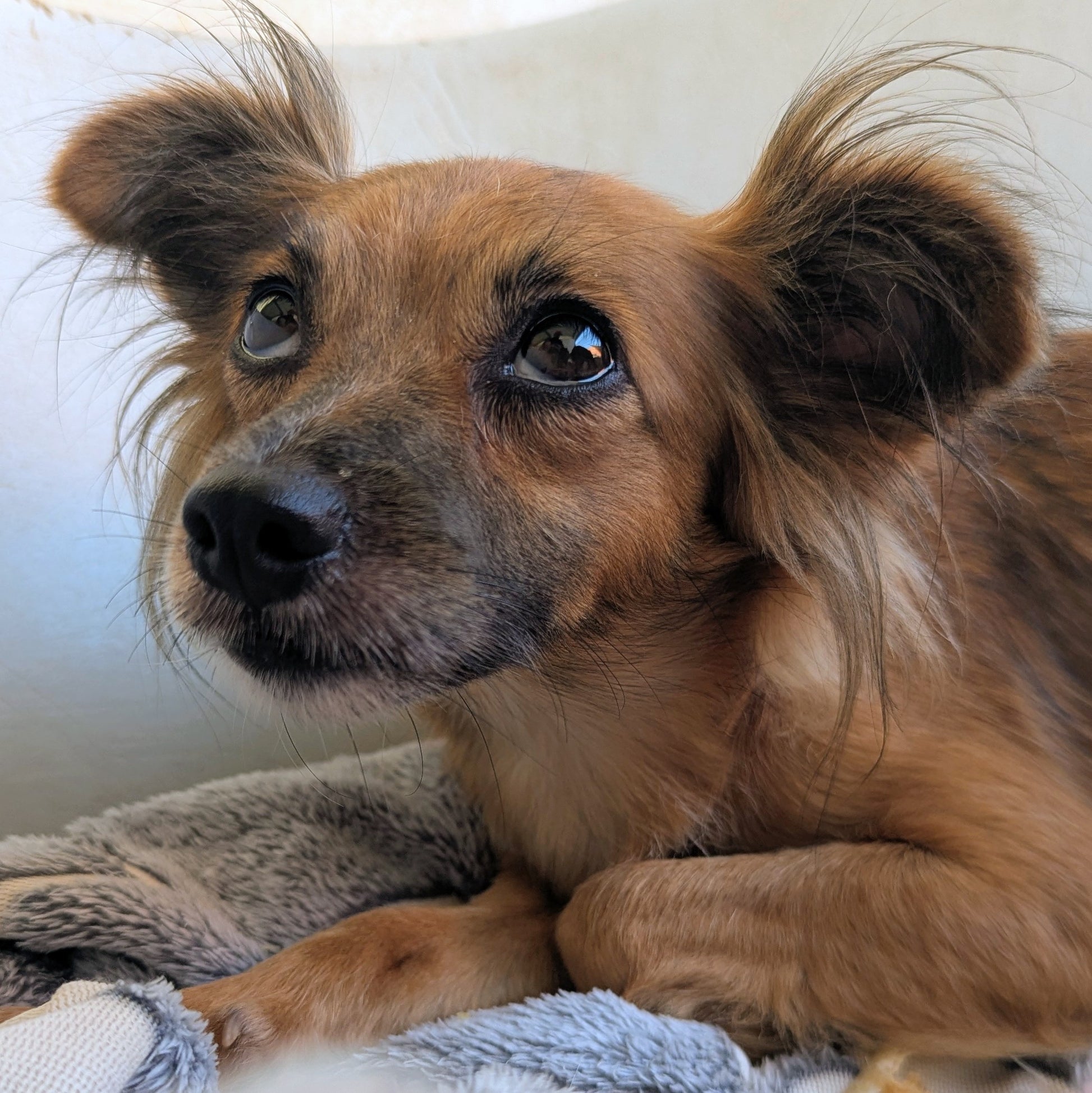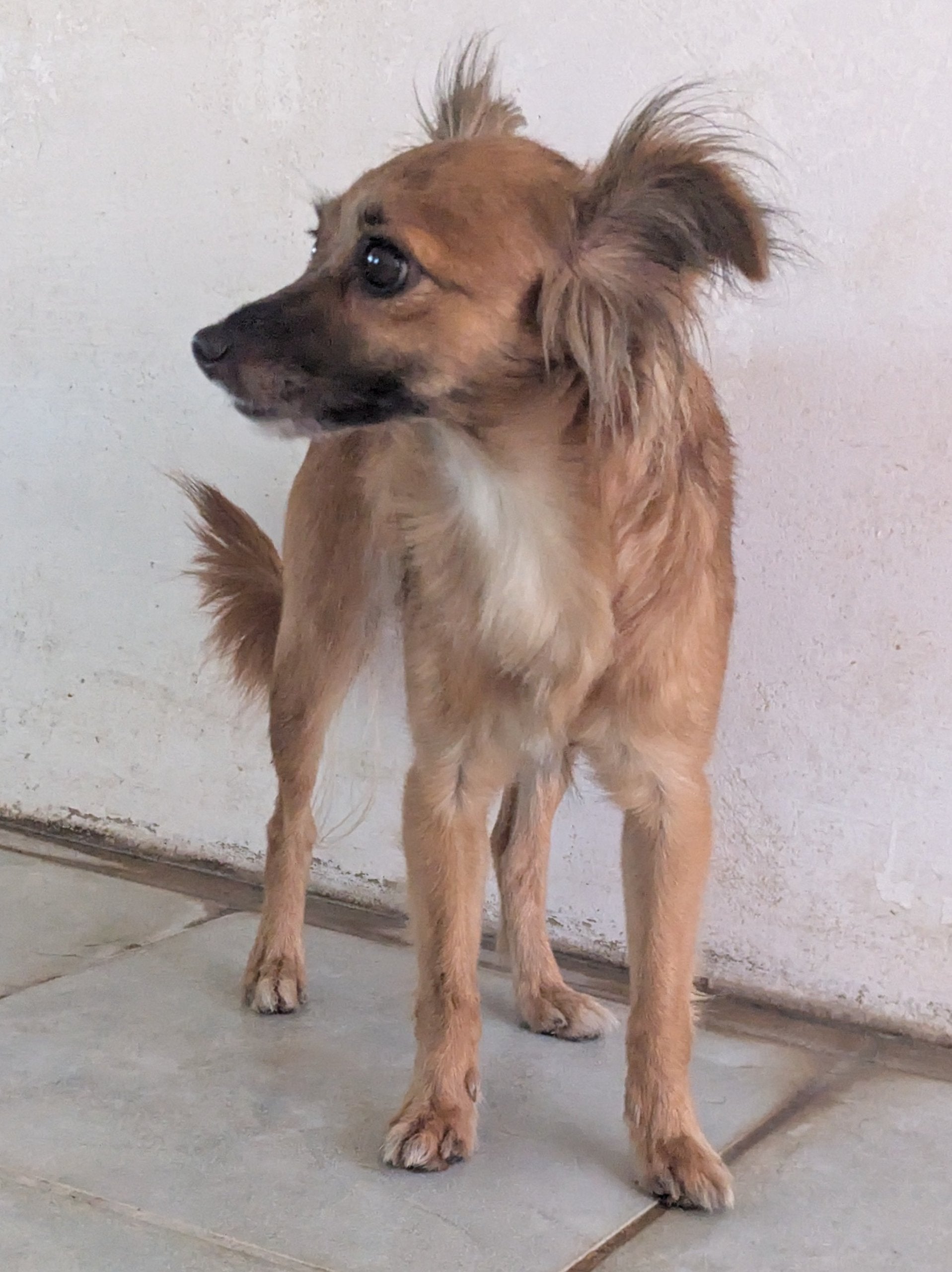 Adorable tiny girl, long red coat, fluffy ears — like a Russian Toy Terrier, waiting to charm her new family