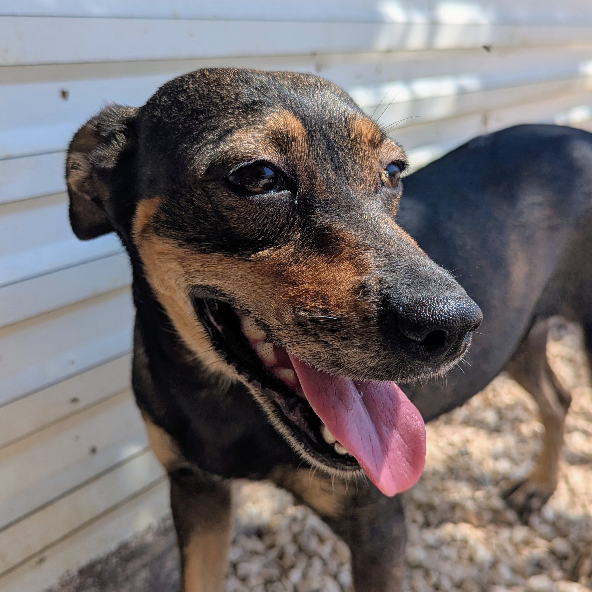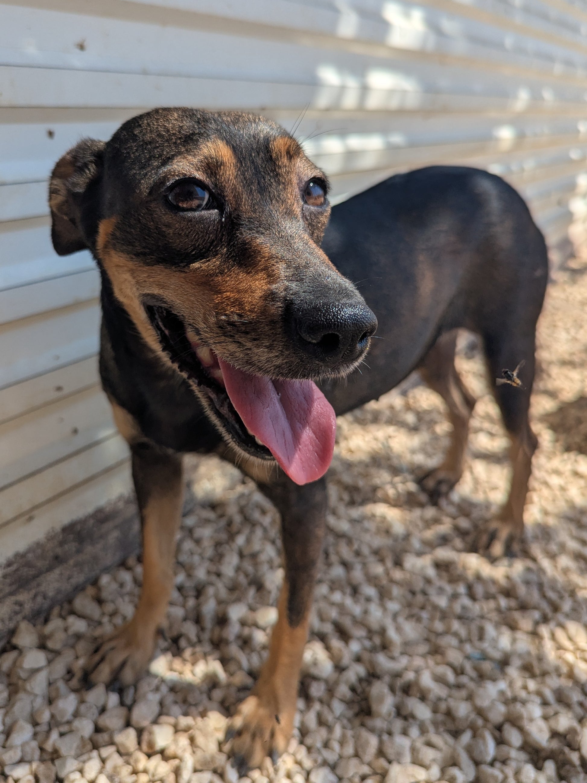 Небольшого размера девочка темно-коричневого окраса с рыжим пятнами. Кроткая, застенчивая
