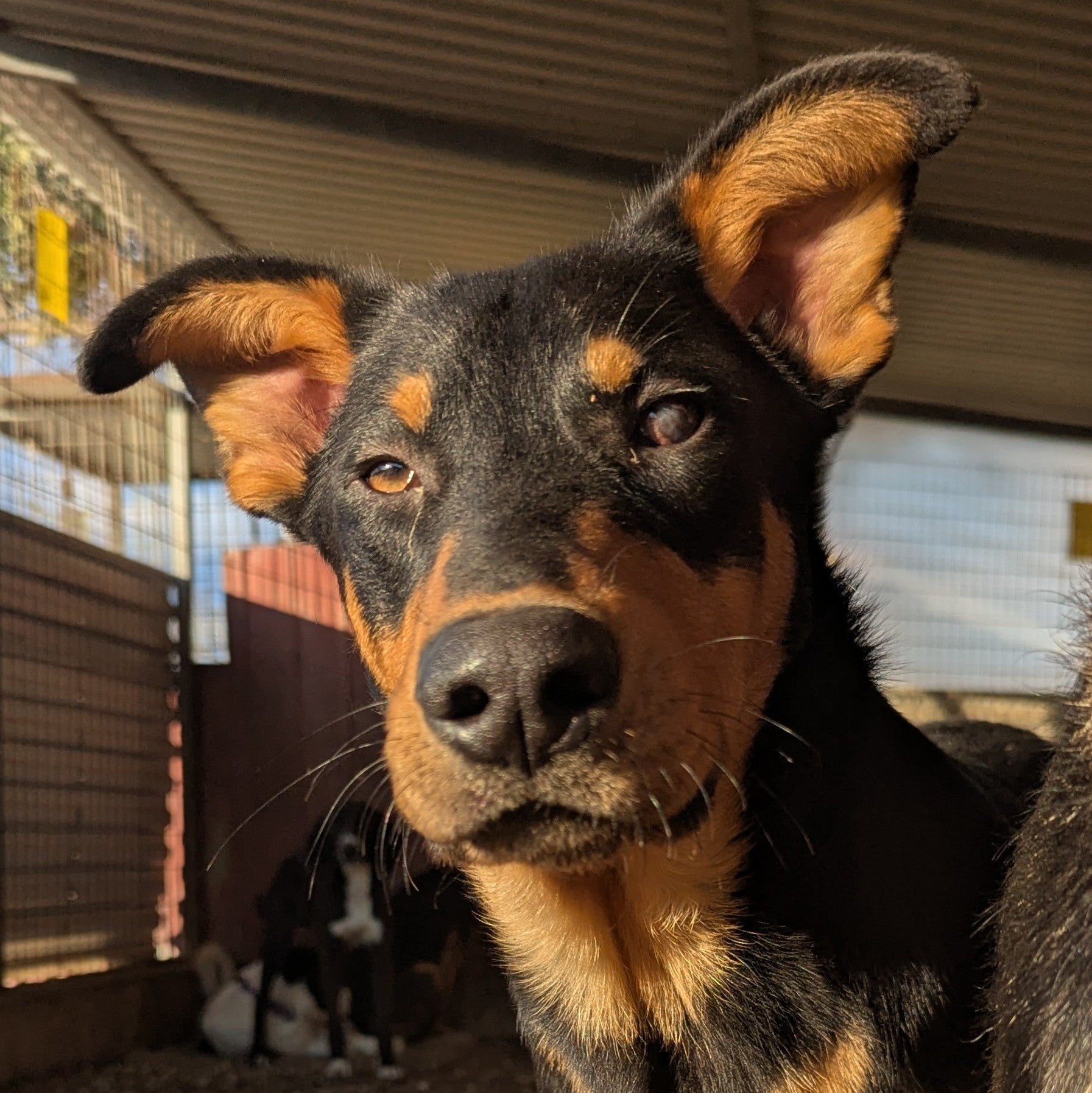 Крупный молодой мальчик, черный с коричневым и проседью на груди, животе и лапах. Слепой на один глаз. Очень дружелюбный и привязанный к человеку