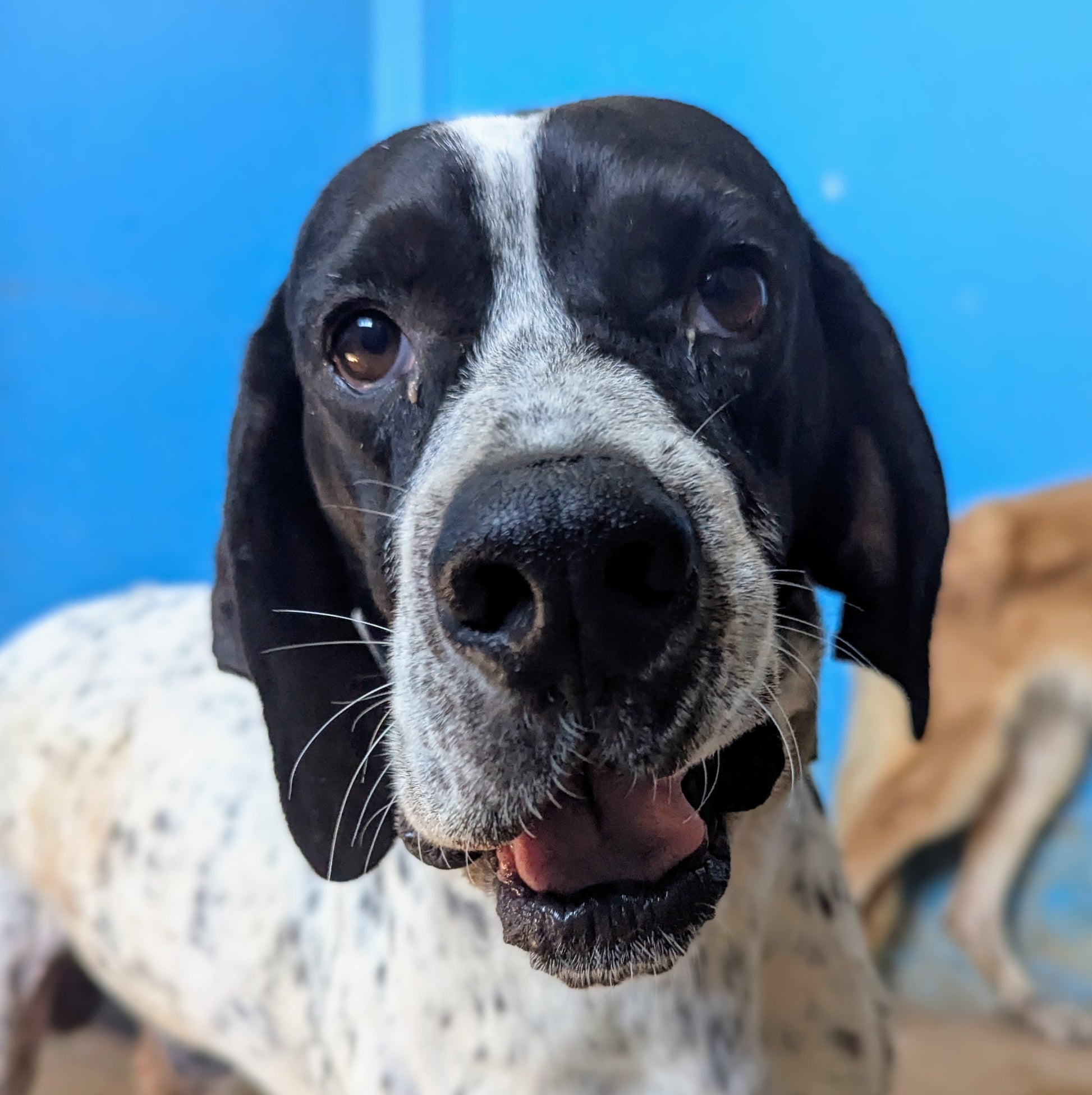 Среднего размера мальчик пойнтер. Окрас белый с чёрным и мелкими серыми пятнами
