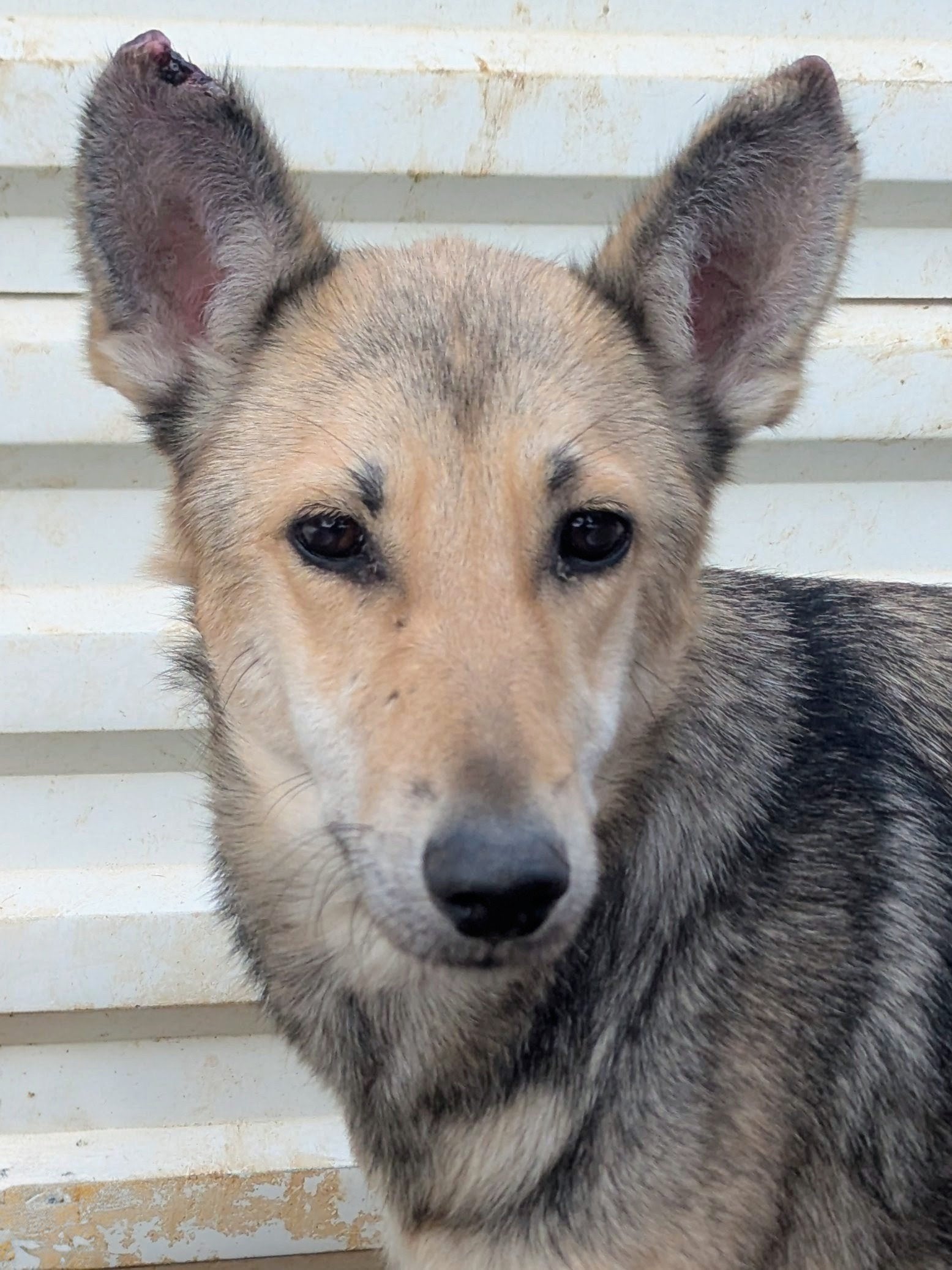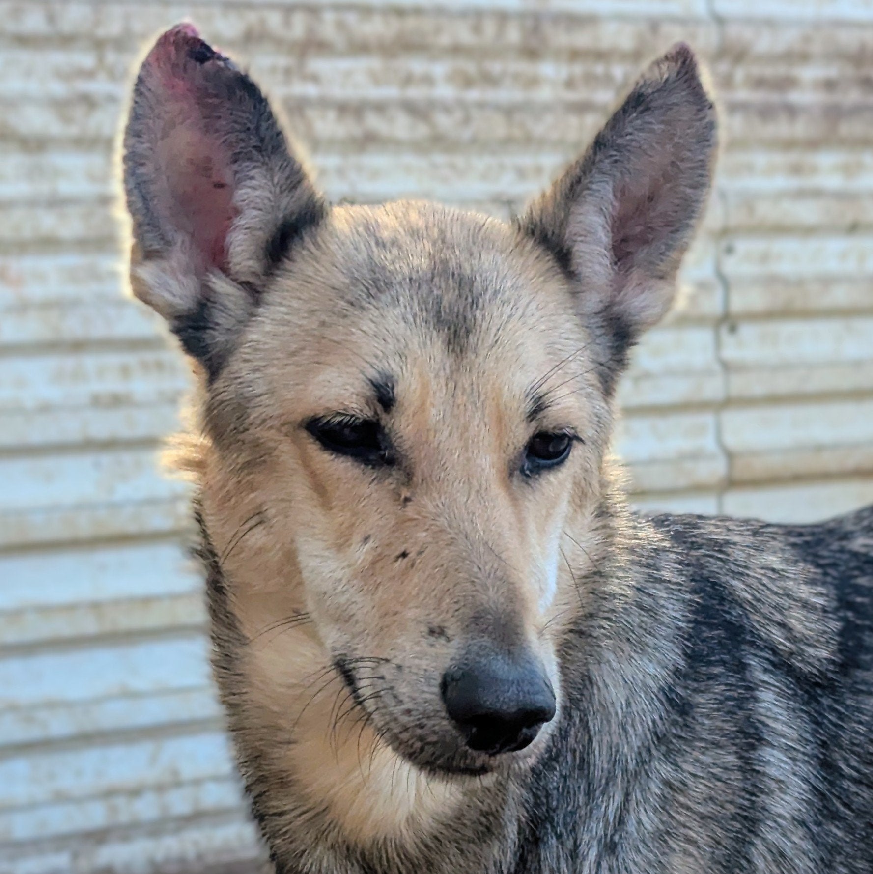 Medium-sized shepherd cross female with gray coat. Slim, tall, and elegant. Looks like a coyote