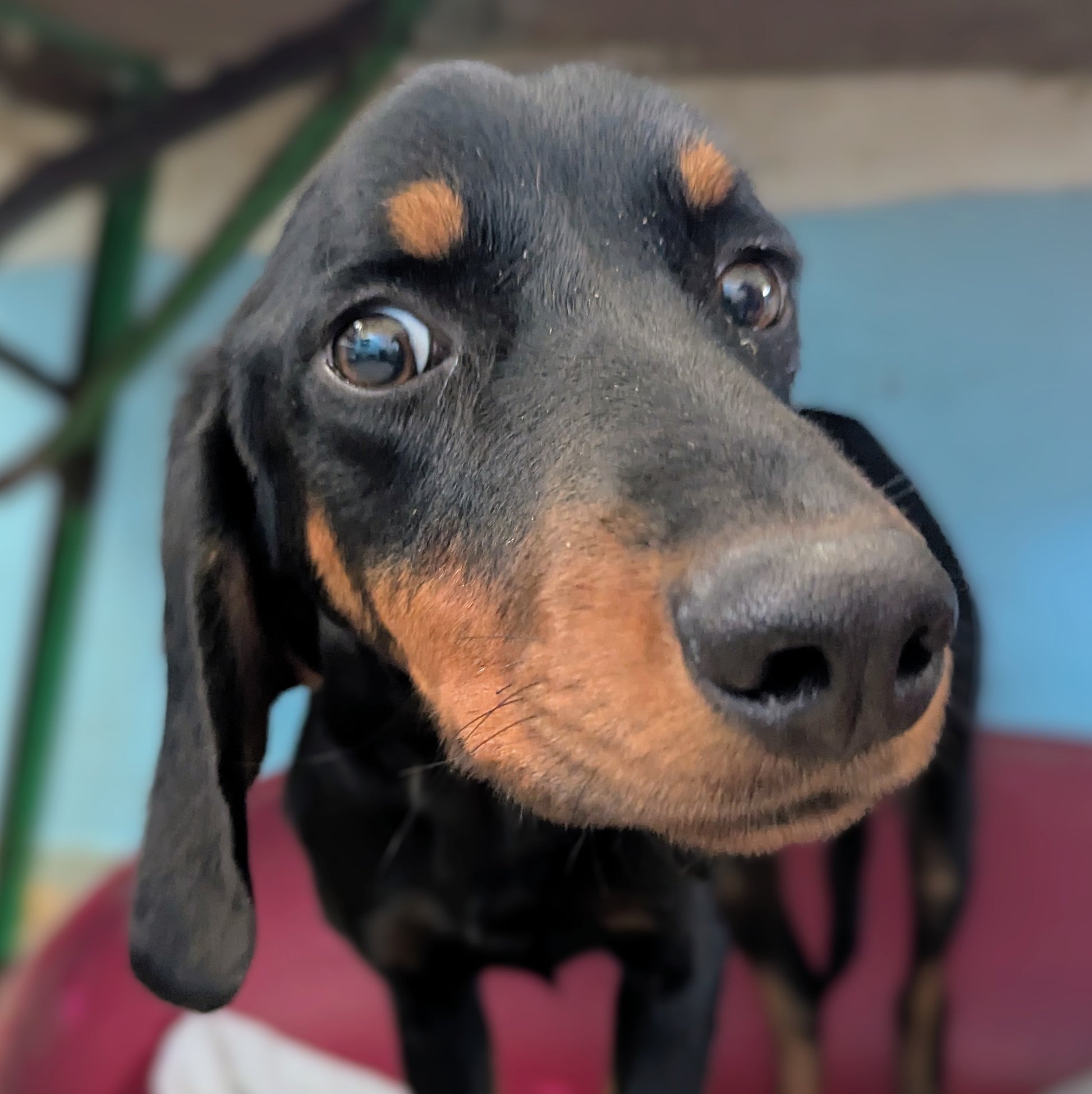 Среднего размера мальчик, с прикольными увеличенными лобными костями, придающими ему особую внешность. Окрас черный с коричневым. Очень застенчивый и ласковый