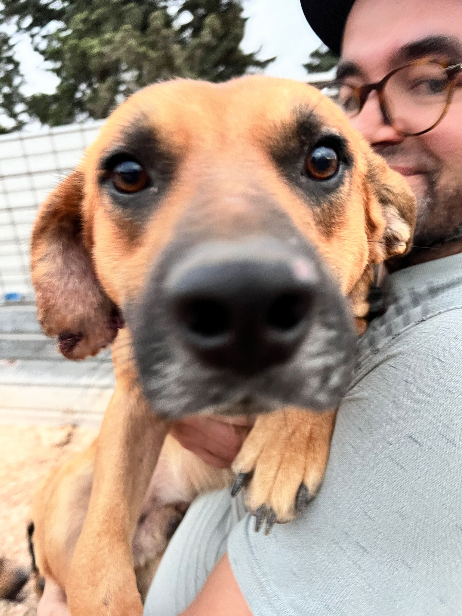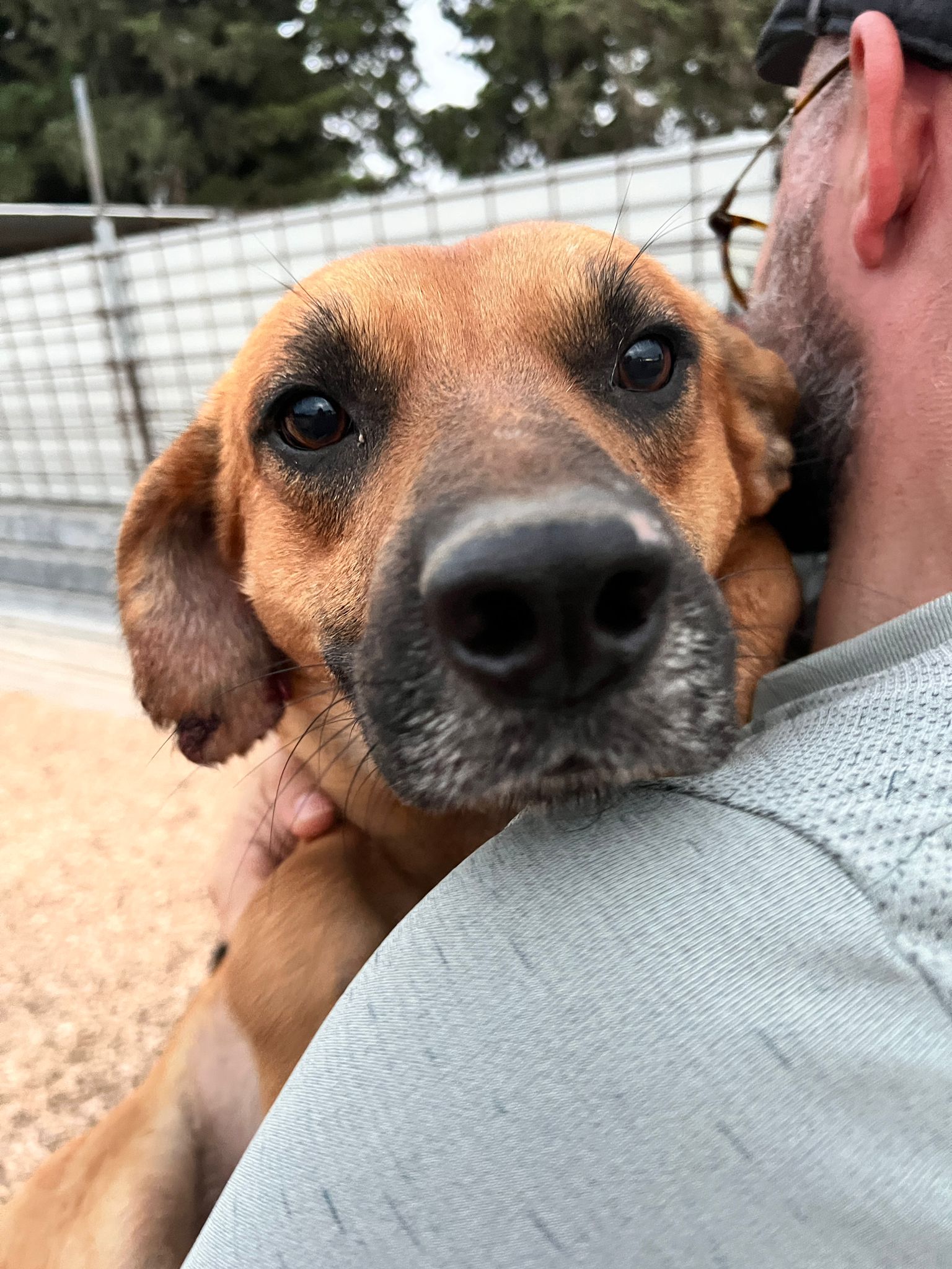 Sweet handsome and calm Shepherd cross, medium size. Ginger brown with black mouth and eyes. Very,affectionate, good on lead.