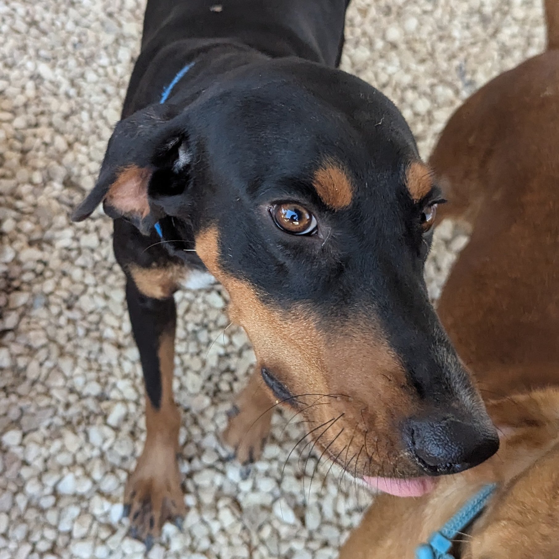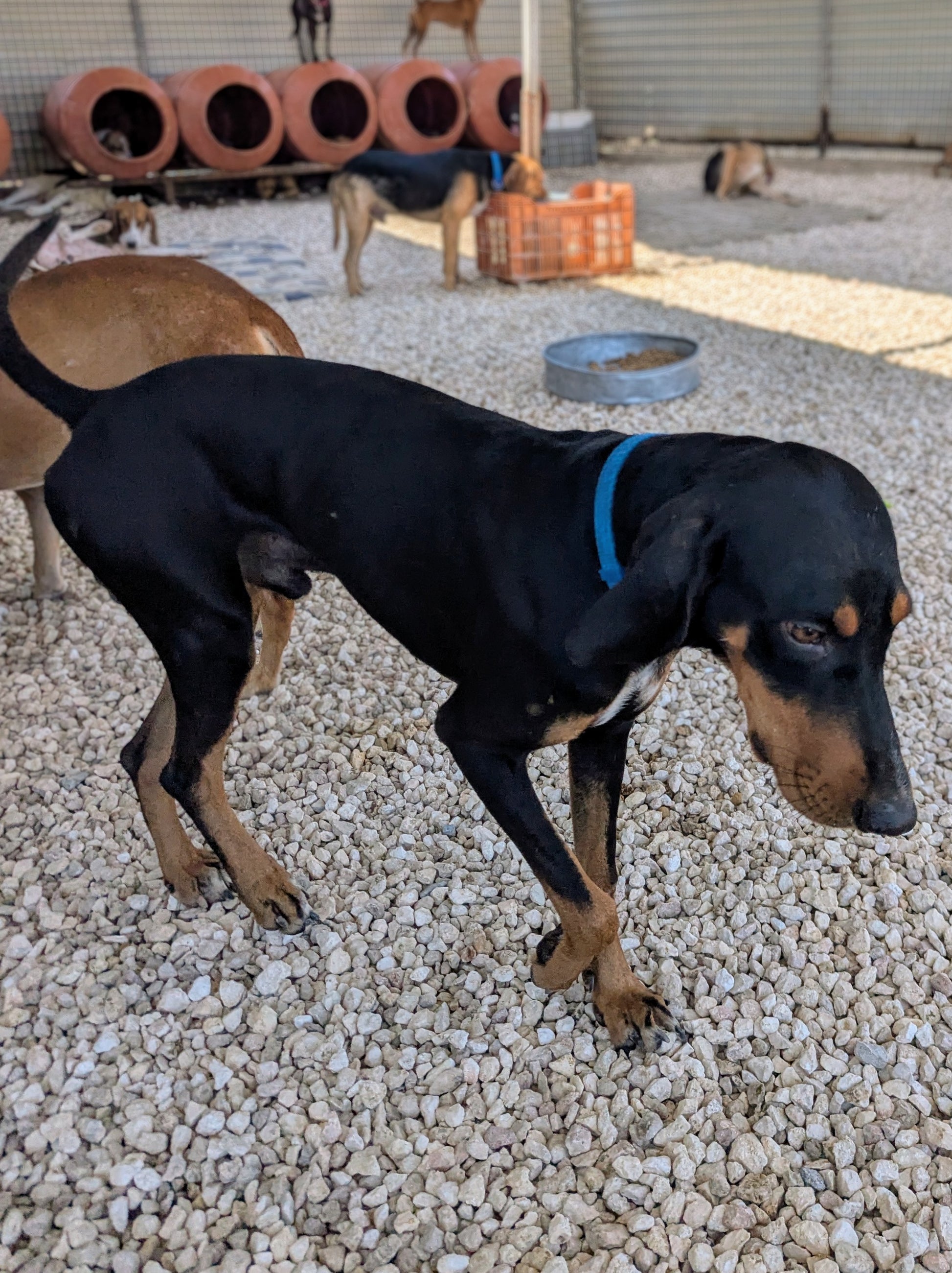 Среднего размера мальчик метис охотничей породы. Окрас чёрный с рыжим, с небольшим белым пятном на груди. Дружелюбный