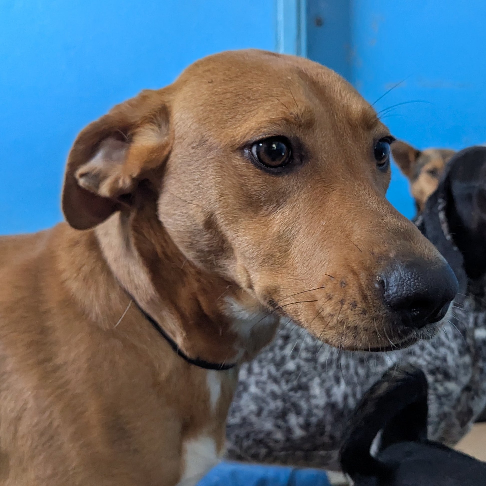 Среднего размера девочка. Окрас рыжий с белыми пятнами на груди. Спокойная, застенчивая