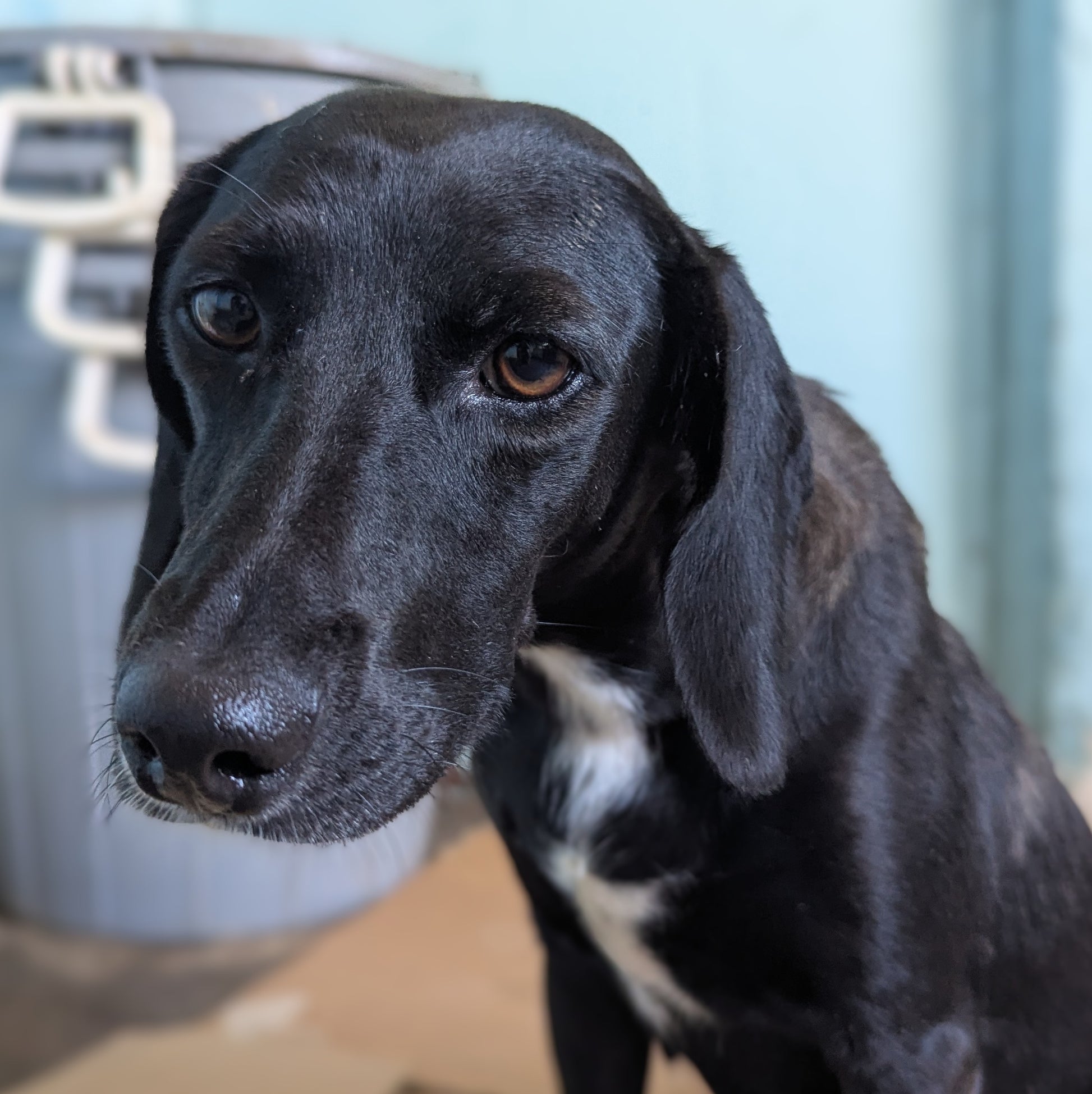 Среднего размера девочка чёрного окраса с белыми пятнами на груди