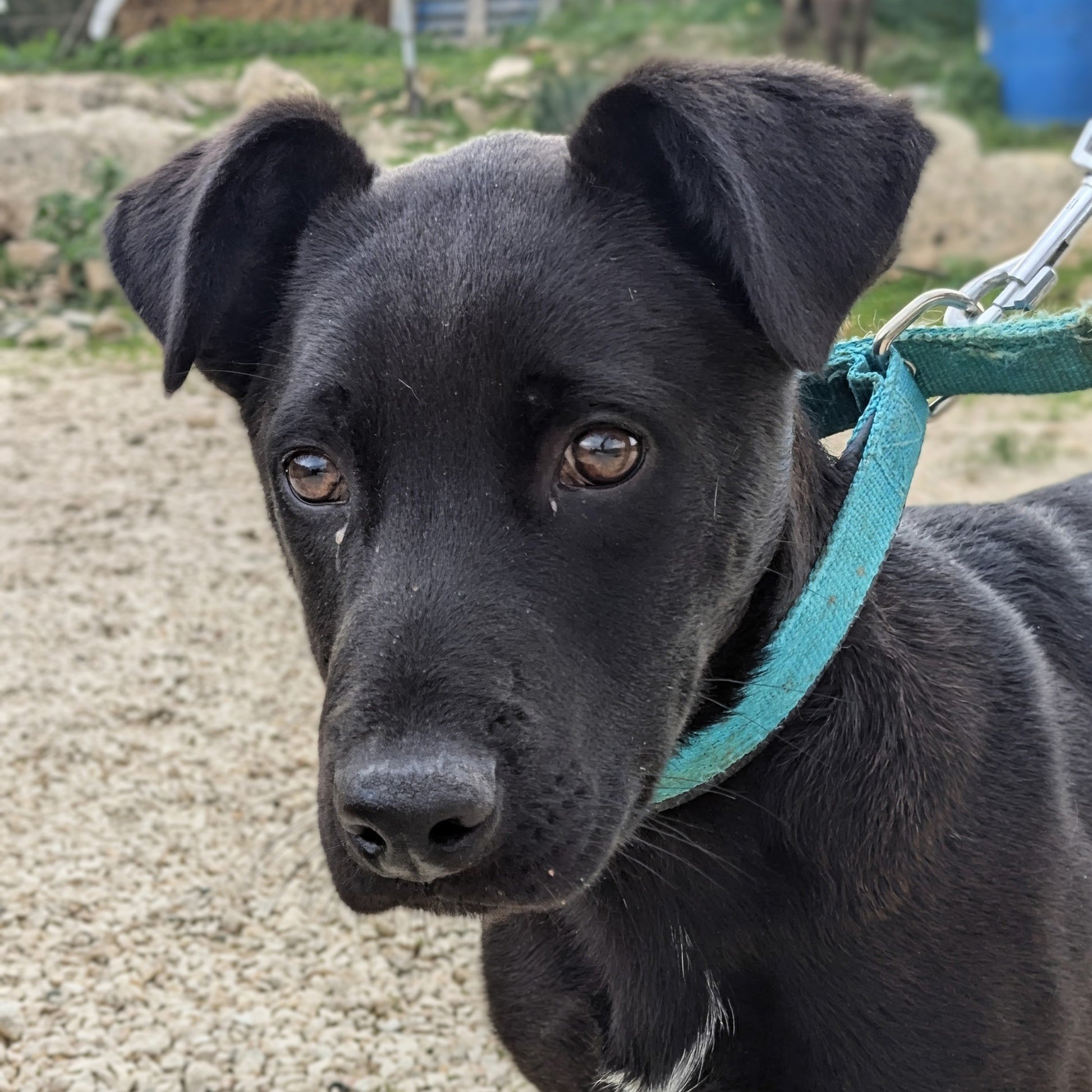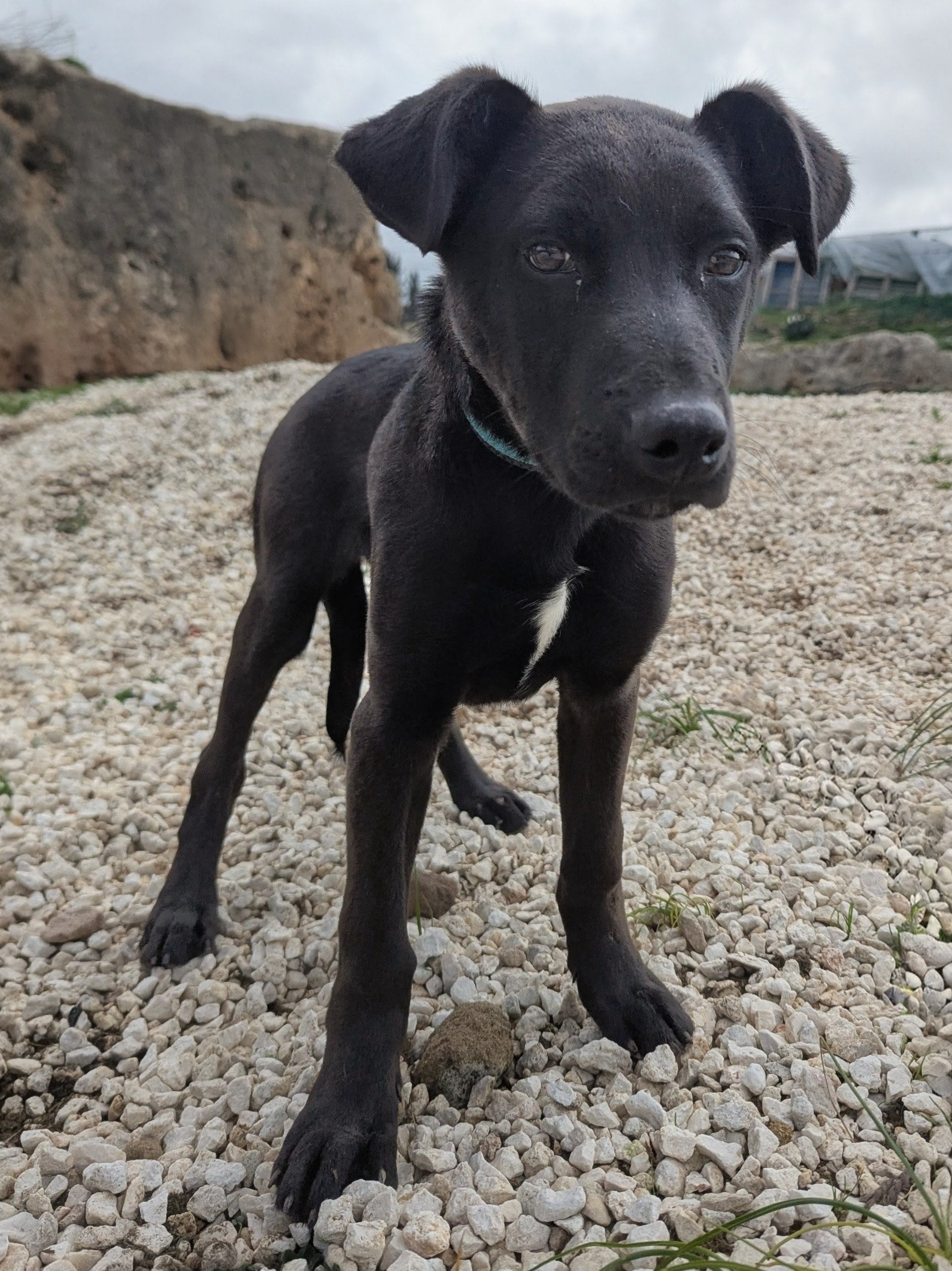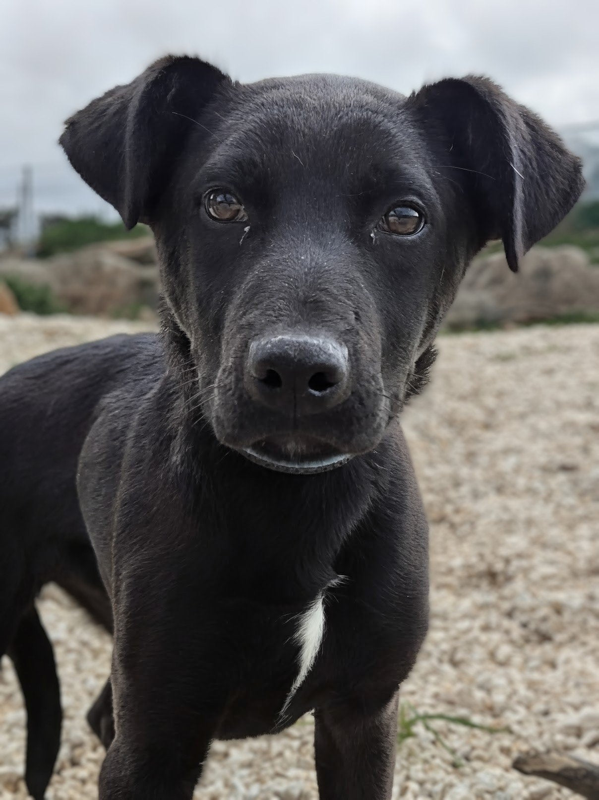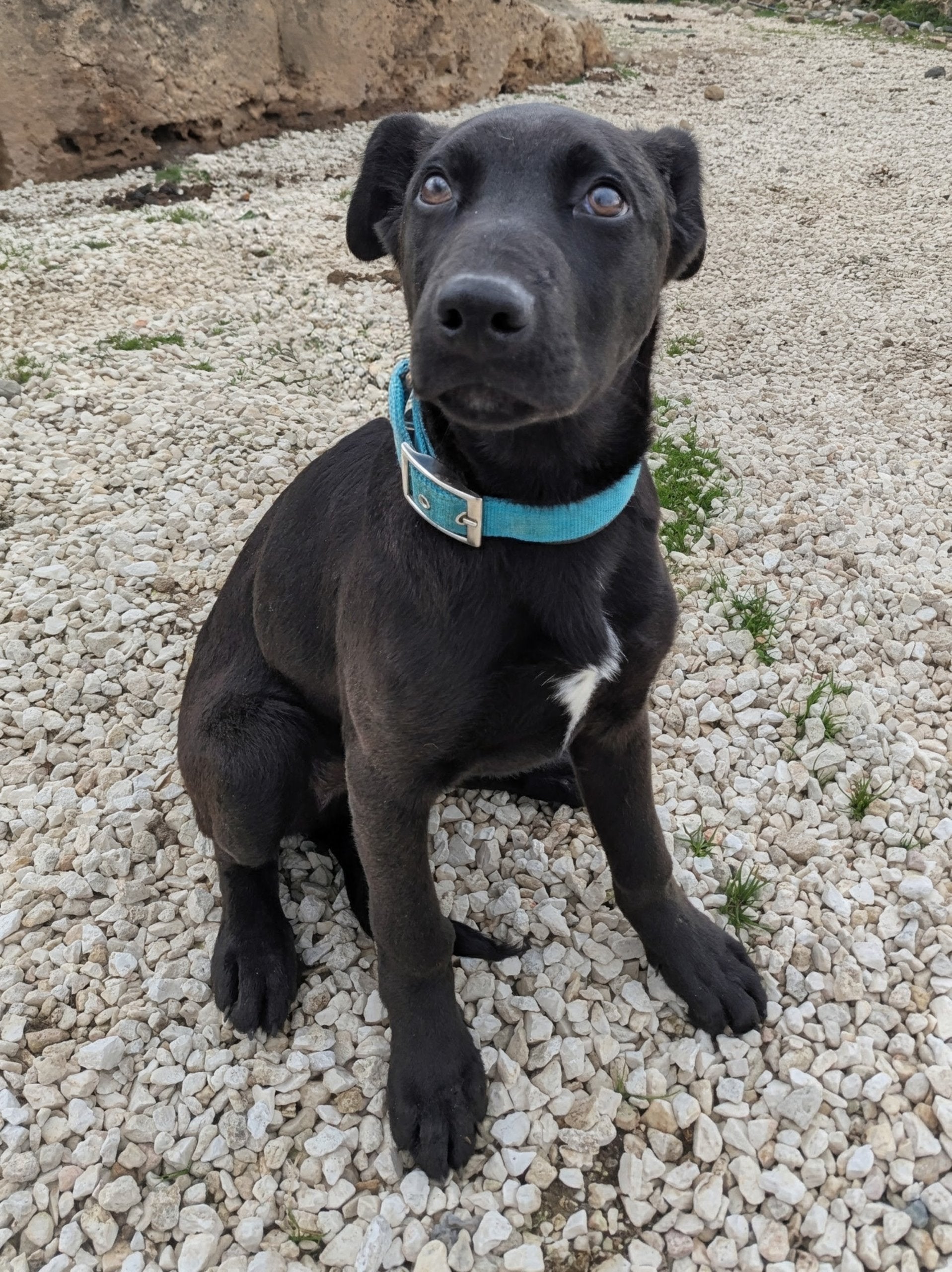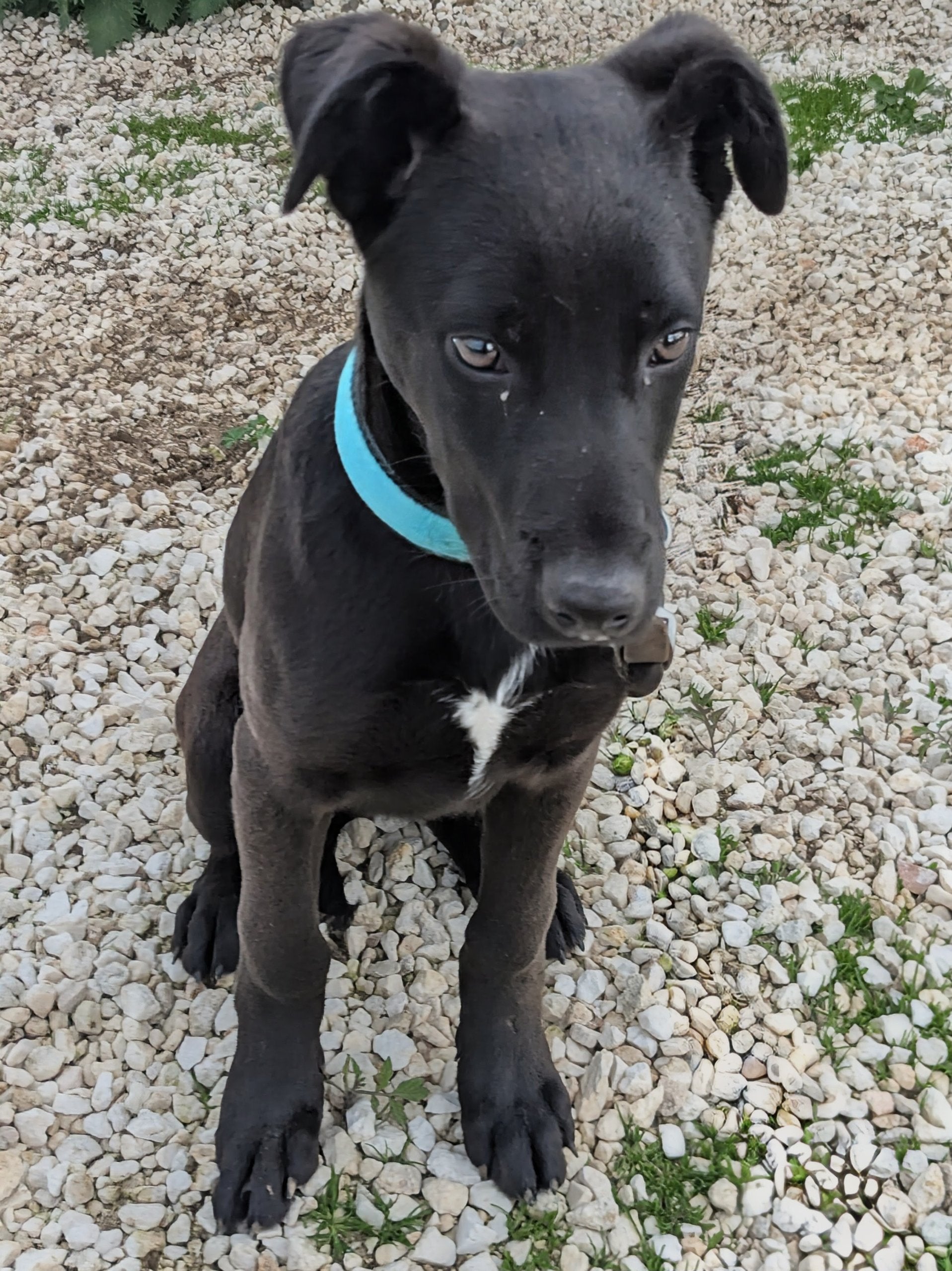 Medium-sized mixed breed male puppy, black with a little white spot on his chest