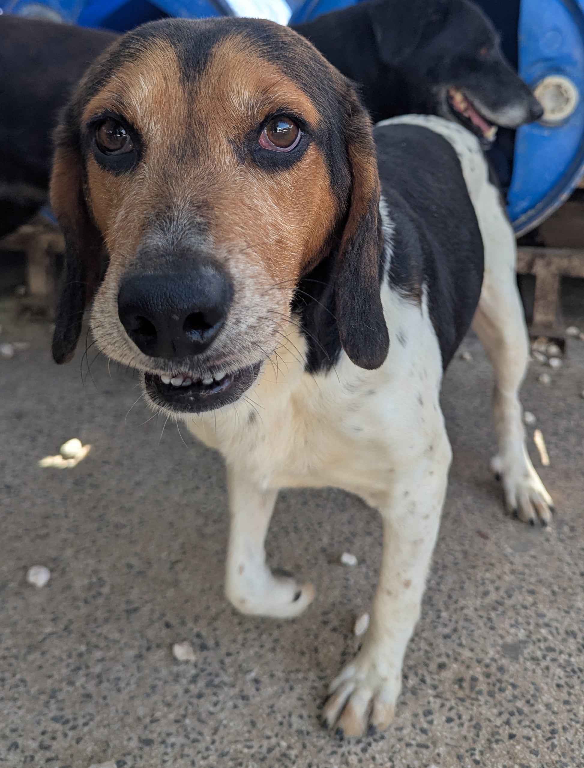 Среднего размера мальчик охотничей породы. Окрас белый с чёрным и рыжим