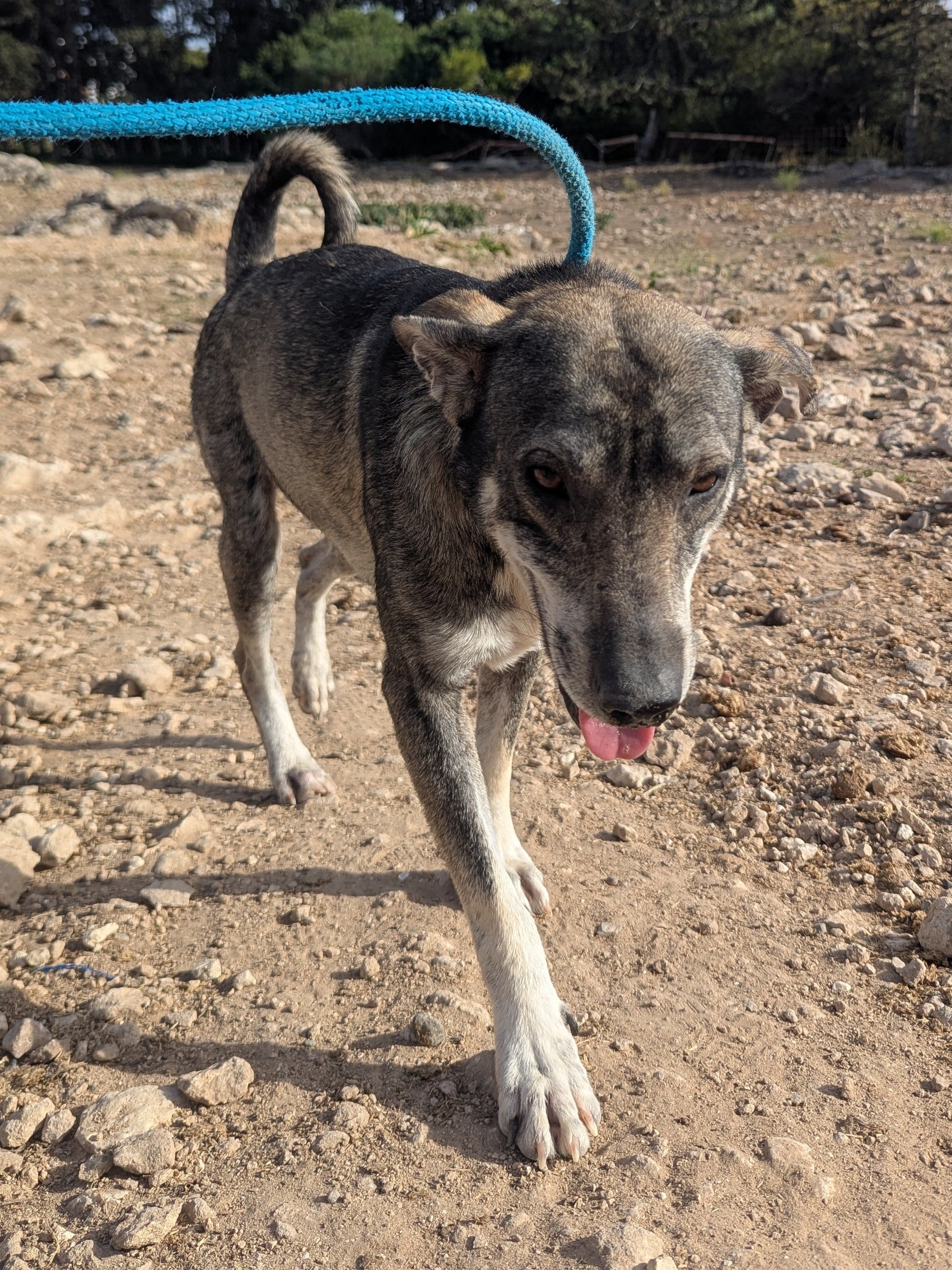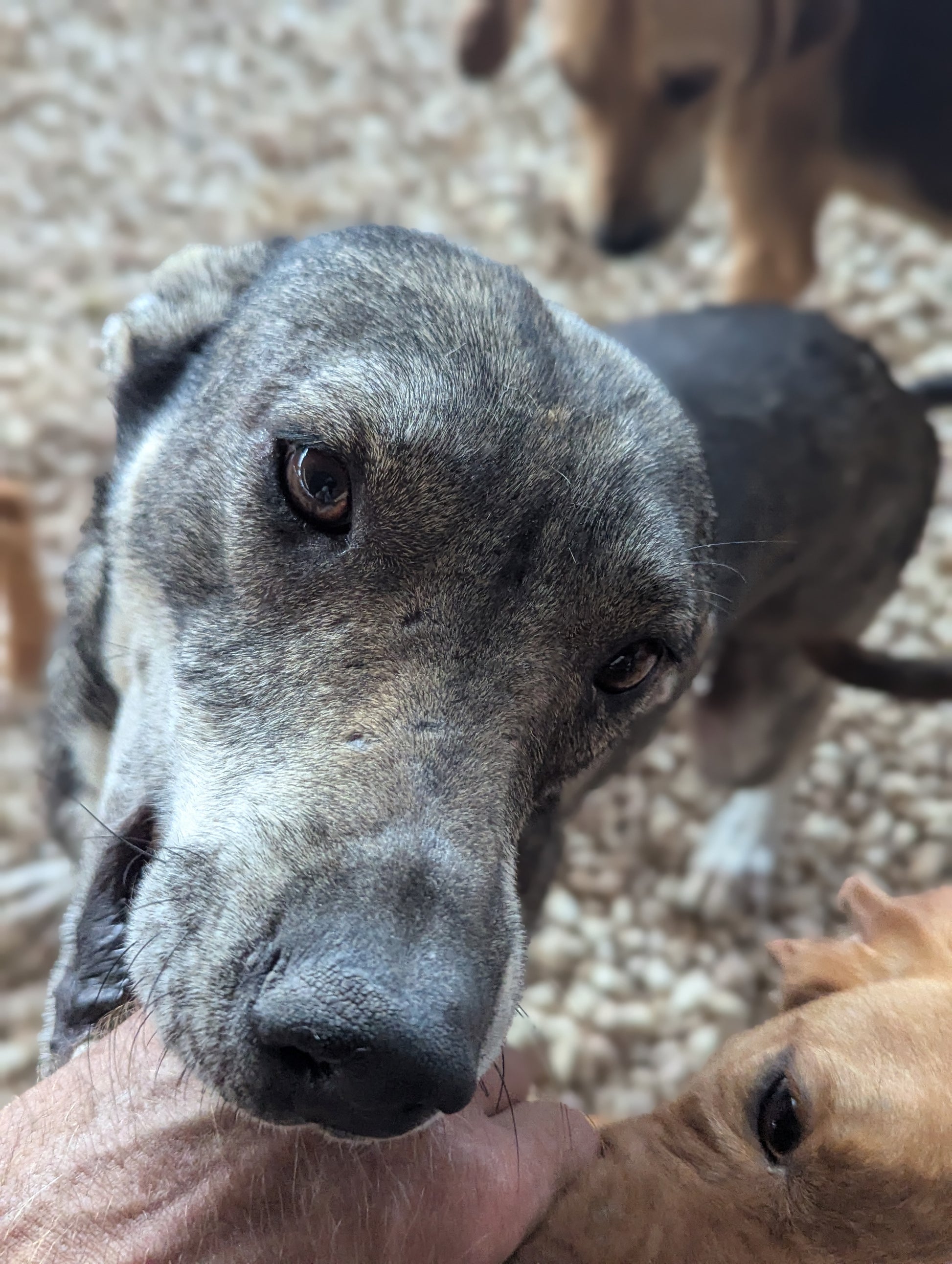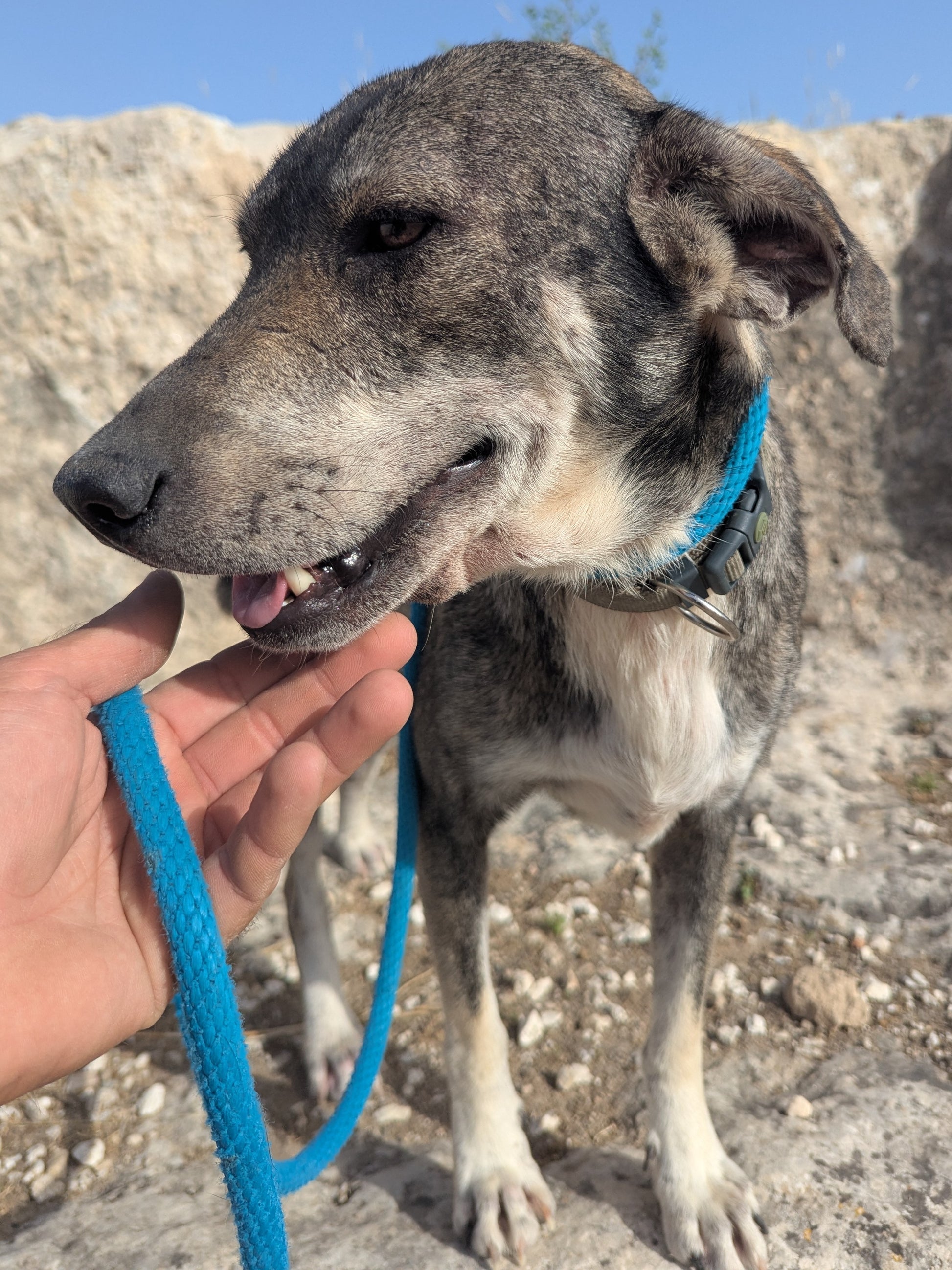 Среднего размера пёс, смешанных пород. Красивый серый окрас. Отсюда имя Хром (Chrome). Спокойный, кроткий. Очень ненавязчиво ищет внимания человека