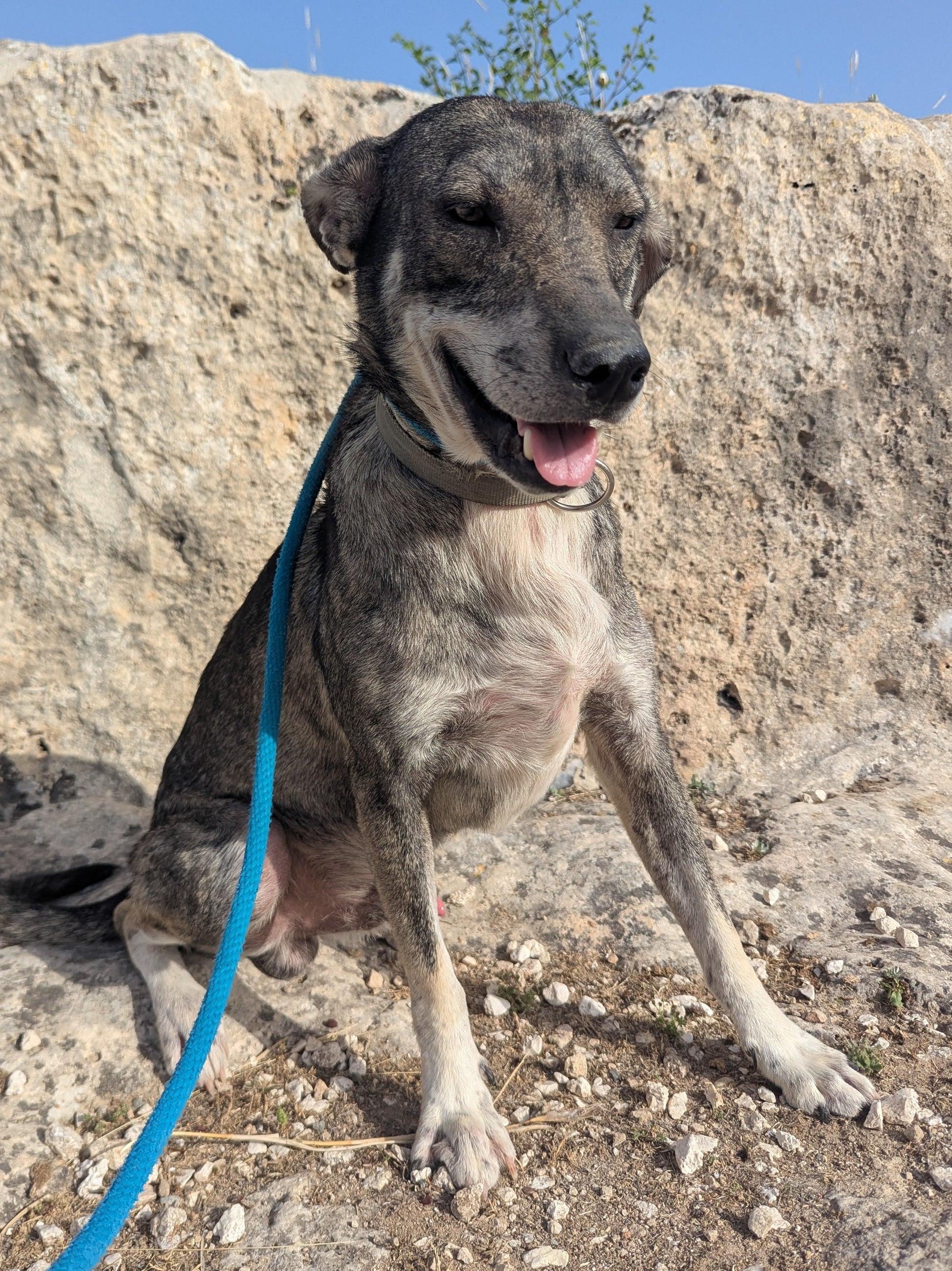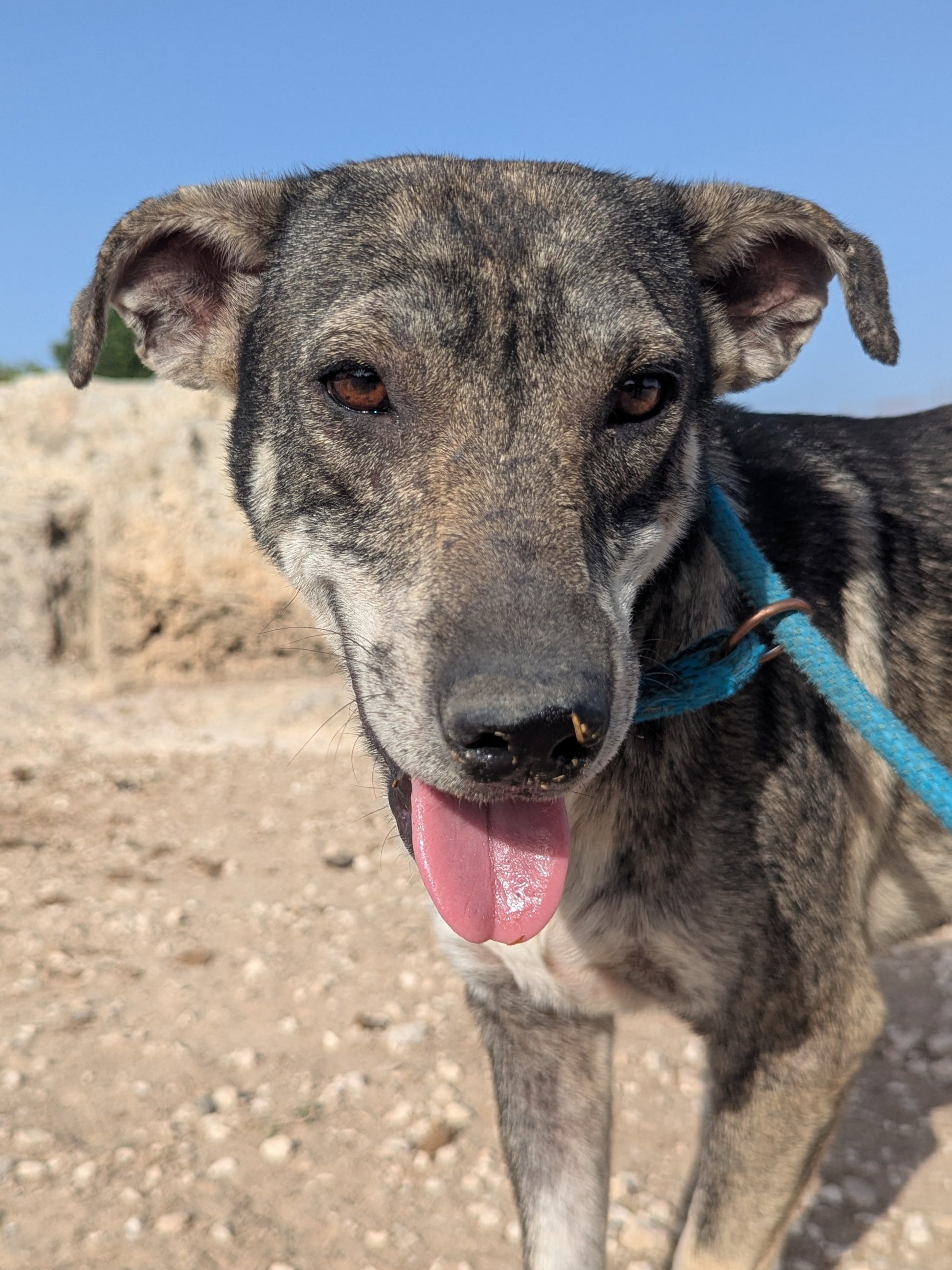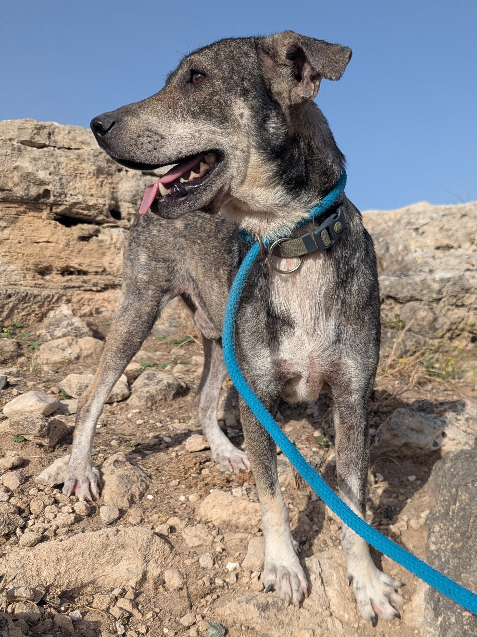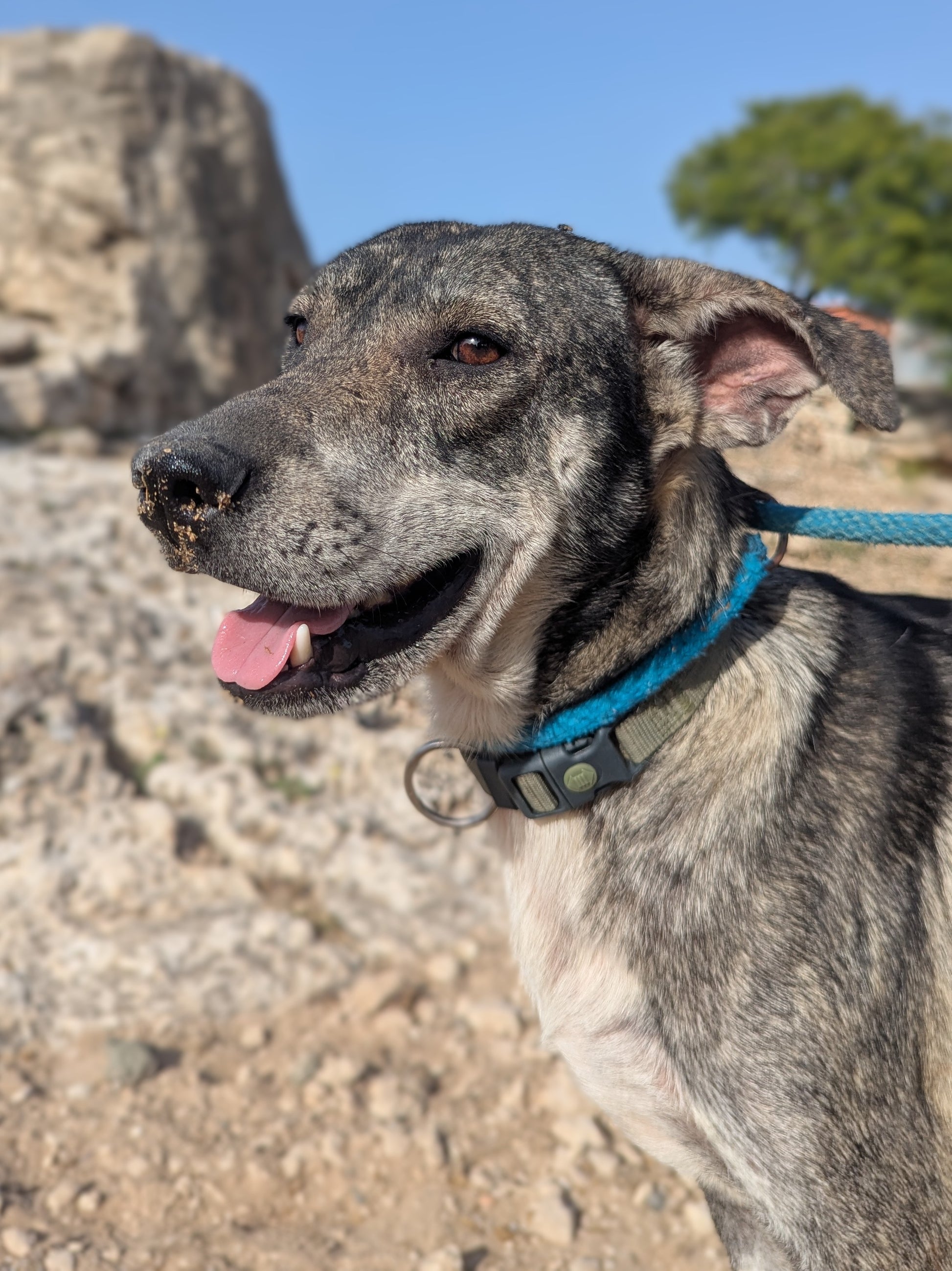 Среднего размера пёс, смешанных пород. Красивый серый окрас. Отсюда имя Хром (Chrome). Спокойный, кроткий. Очень ненавязчиво ищет внимания человека