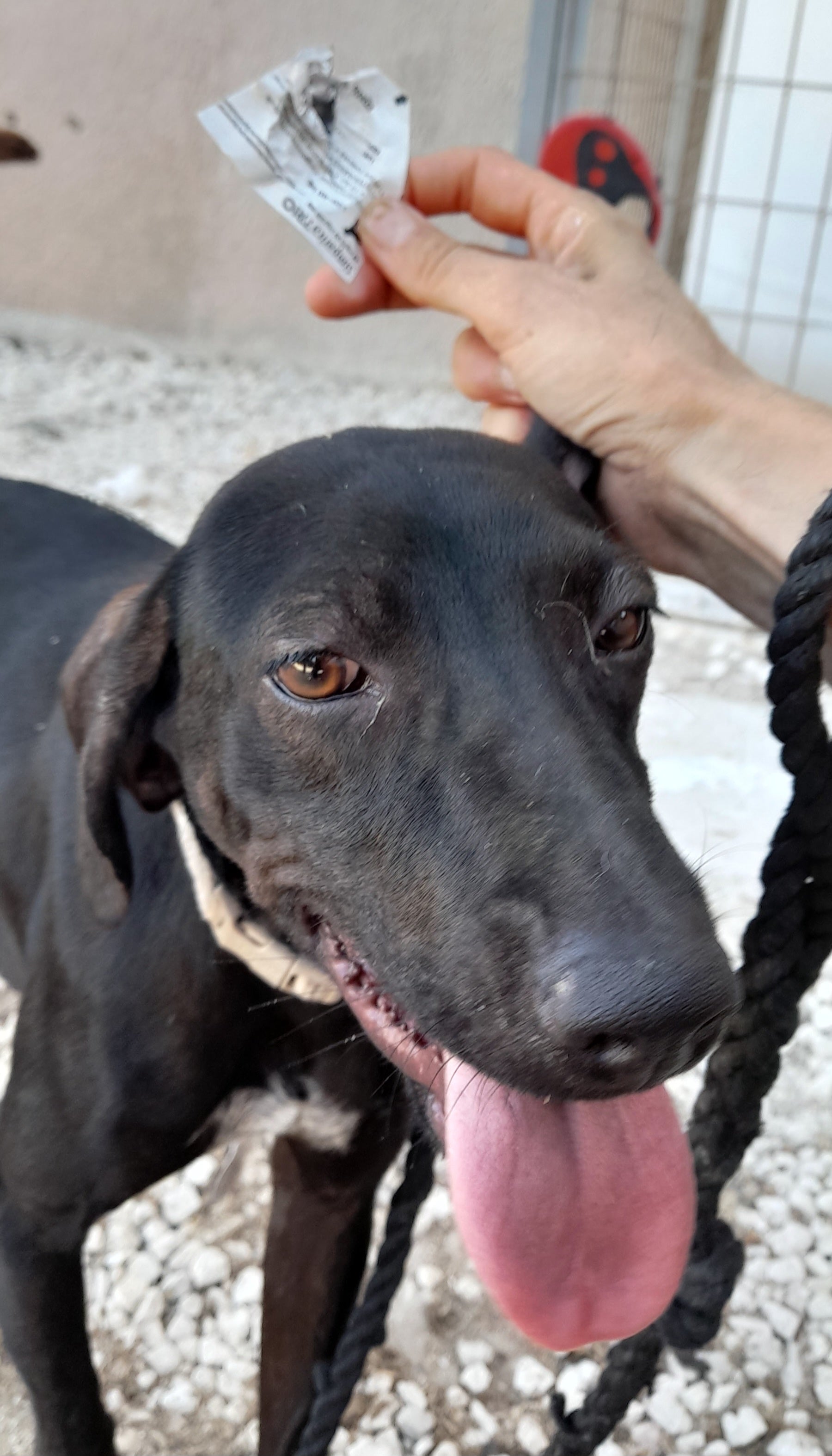 Black short-haired girl with white chest. Looks like Marilena but is smaller. Beige collar