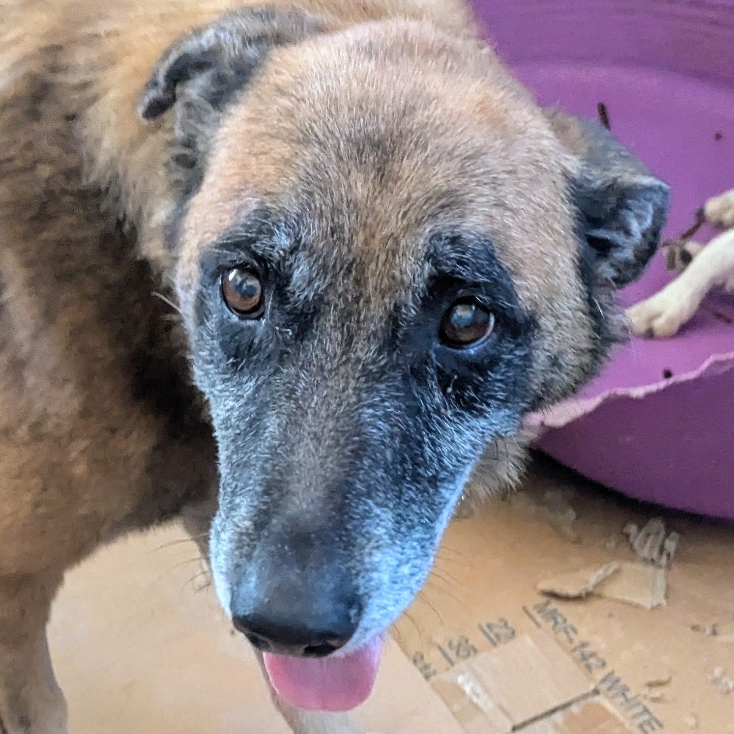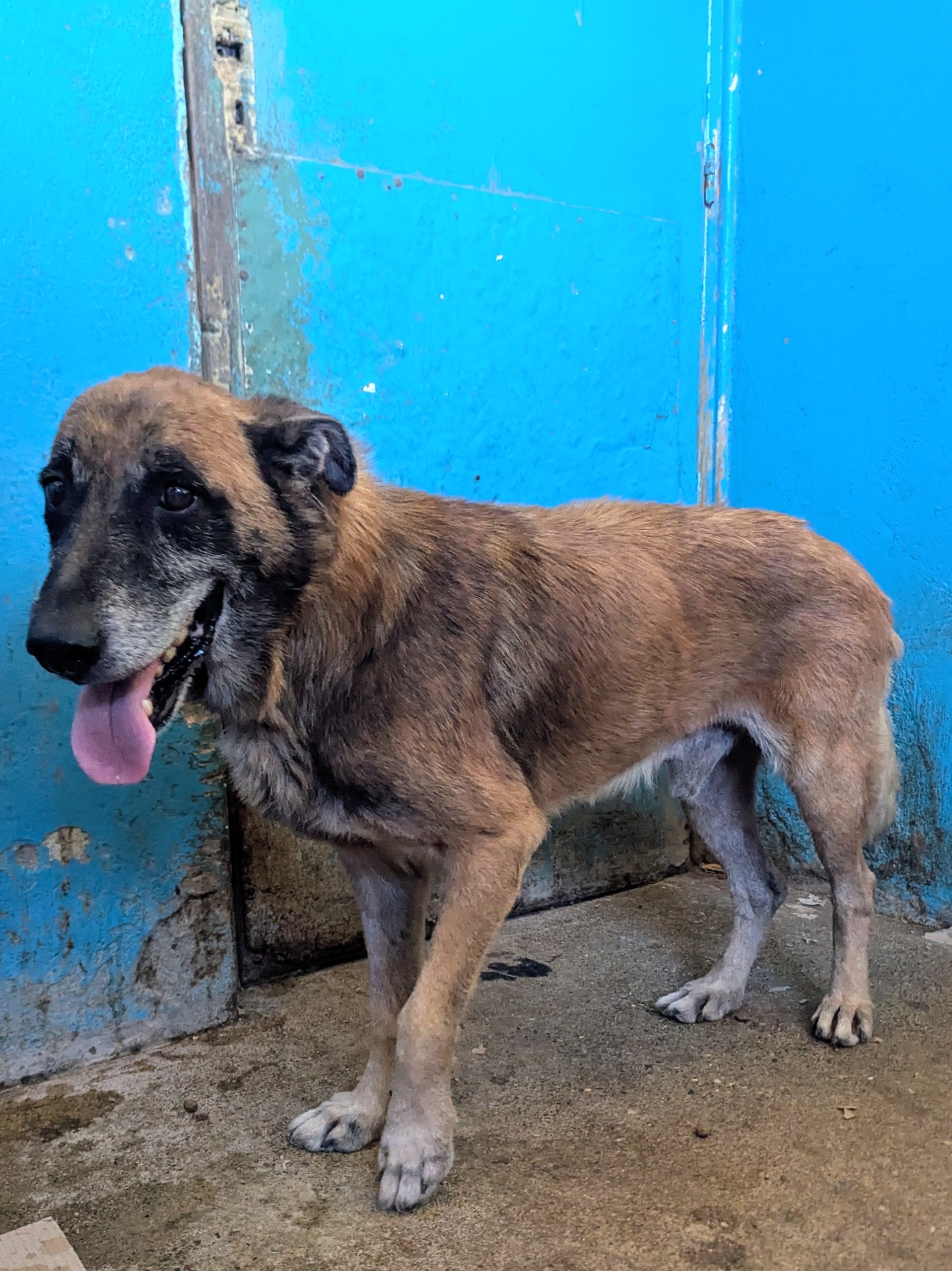 Big-sized old shepherd cross male, brown with black. Calm and friendly
