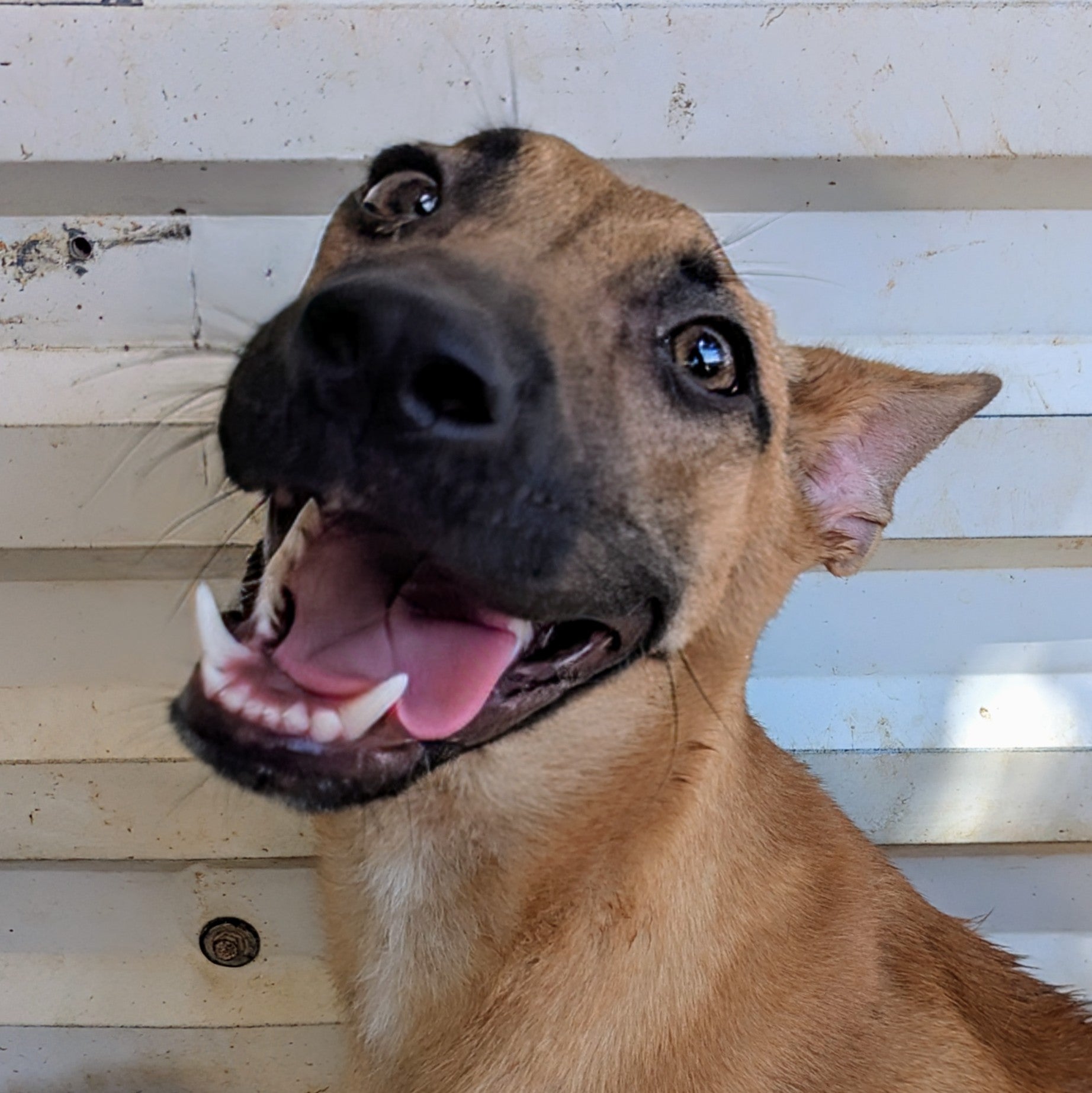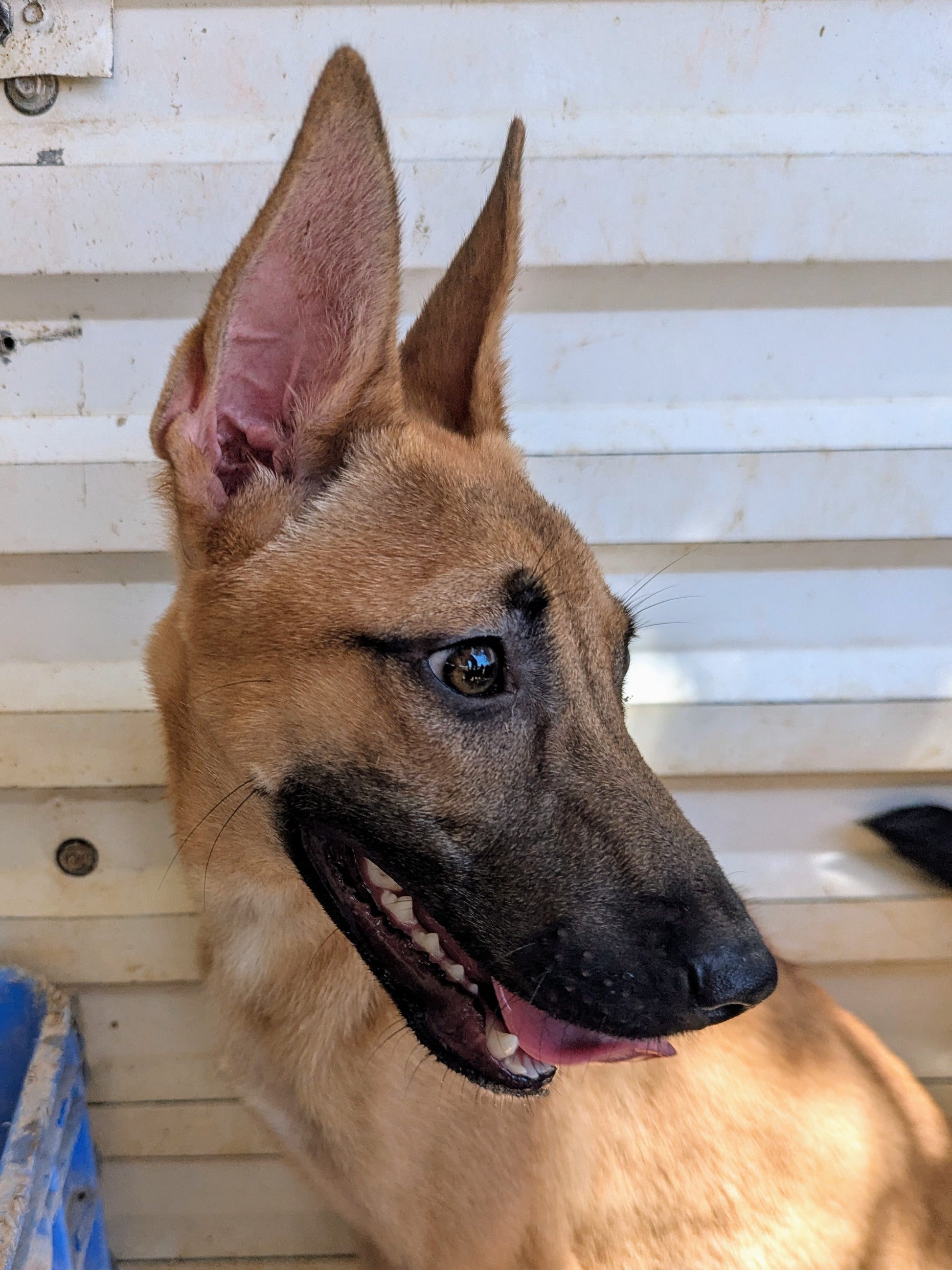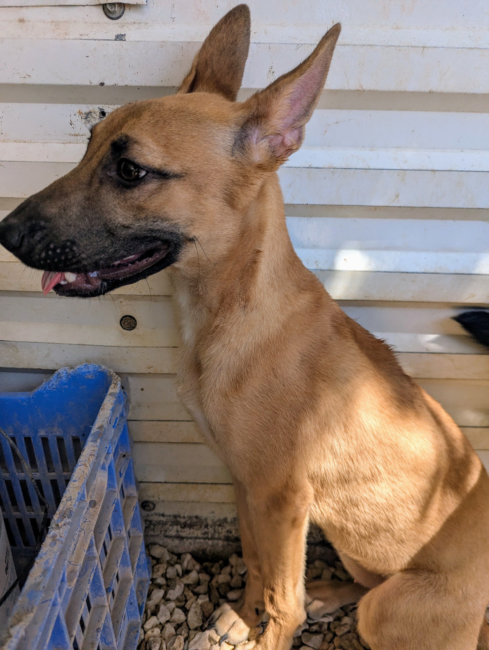 Небольшого размера молодая девочка, недавно переведенная из щенячьего вольера. Ровный золотистый окрас, черная маска. Овчарка или метис. Ласковая