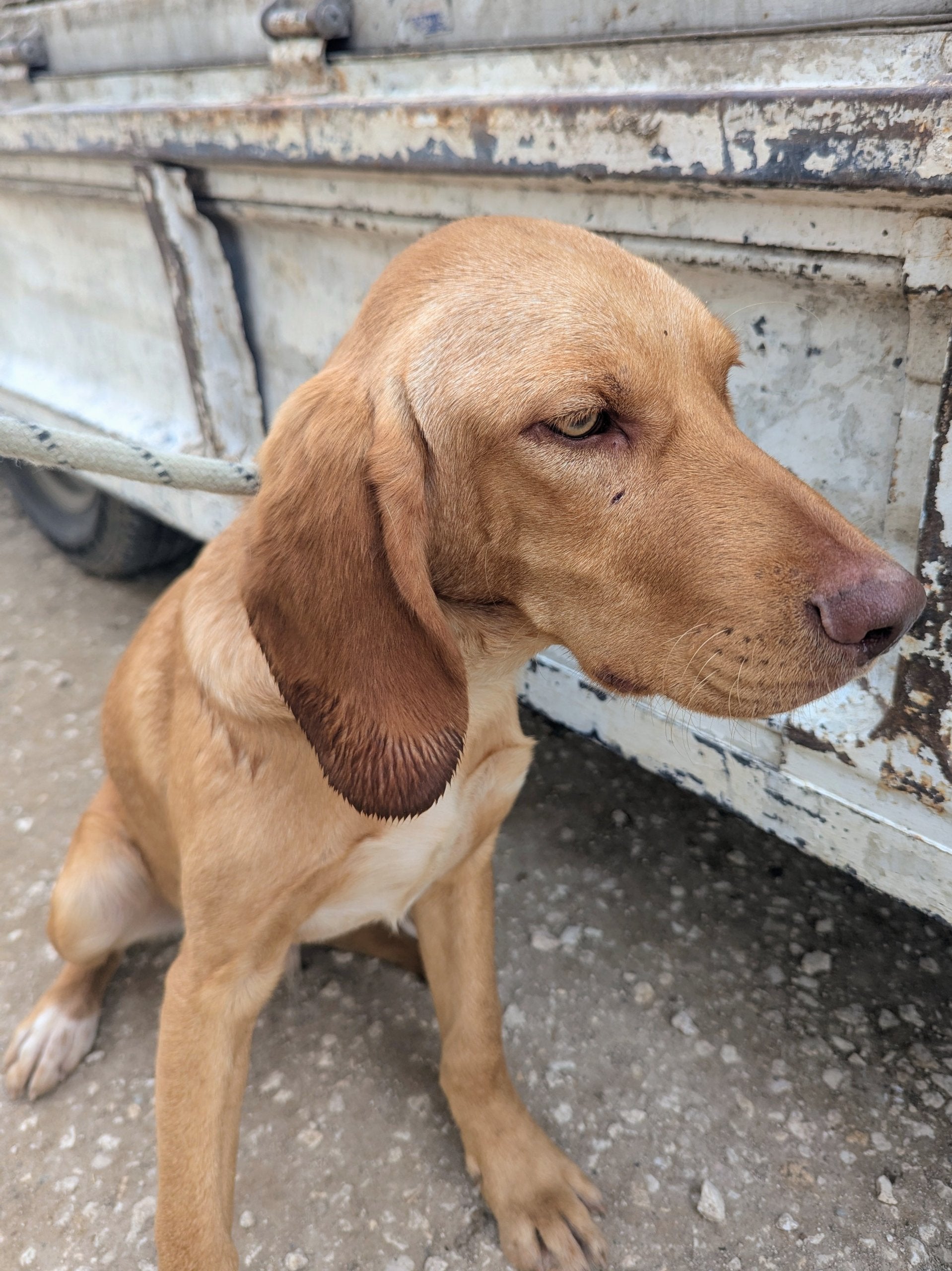 Medium-sized young hunter cross male. Golden coat with little white on his chest