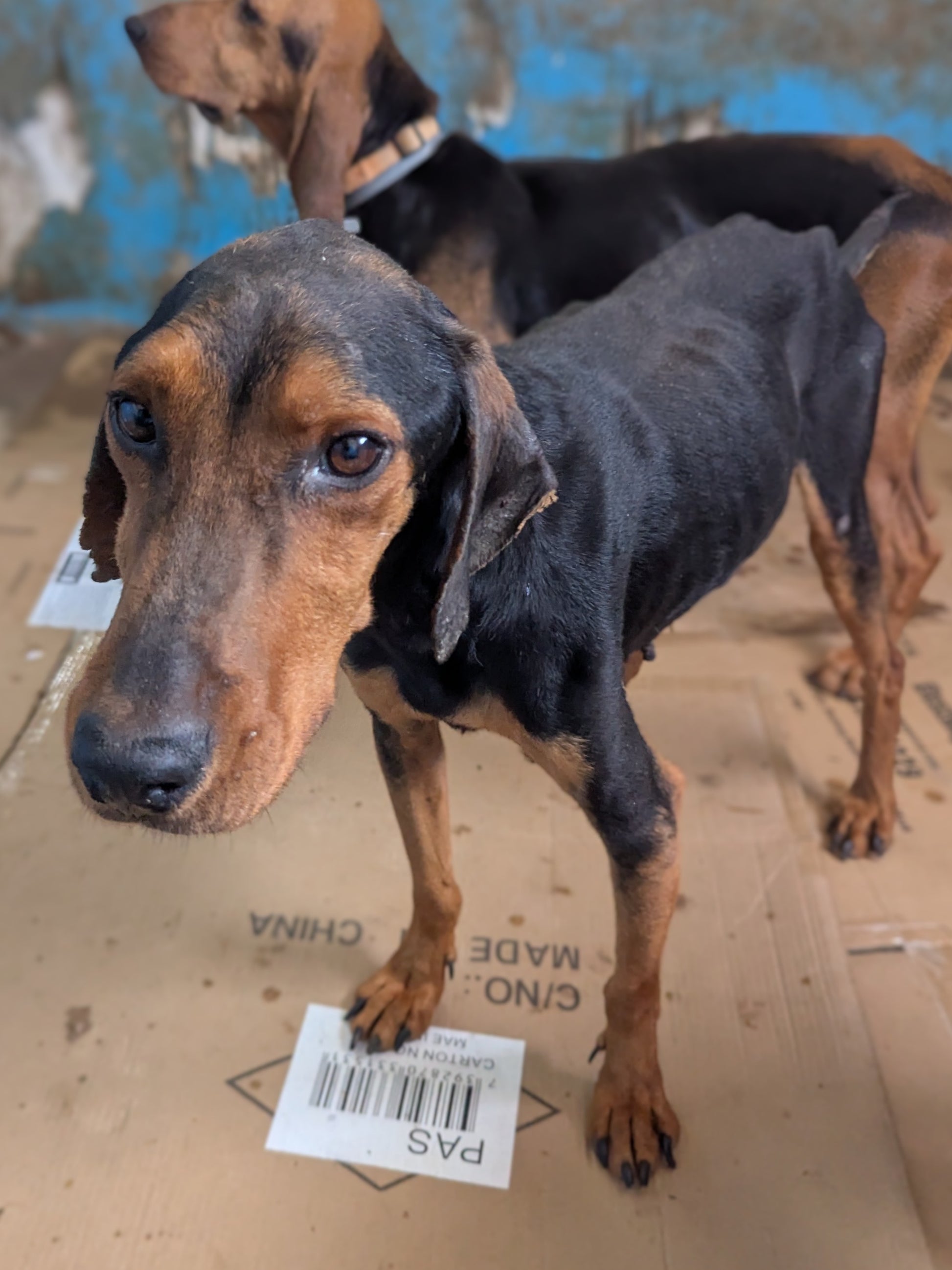 Среднего размера мальчик метис охотничей породы чёрного с рыжим окраса. Худощавый, с крупной головой. Дружелюбный, застенчивый, но любит внимание человека