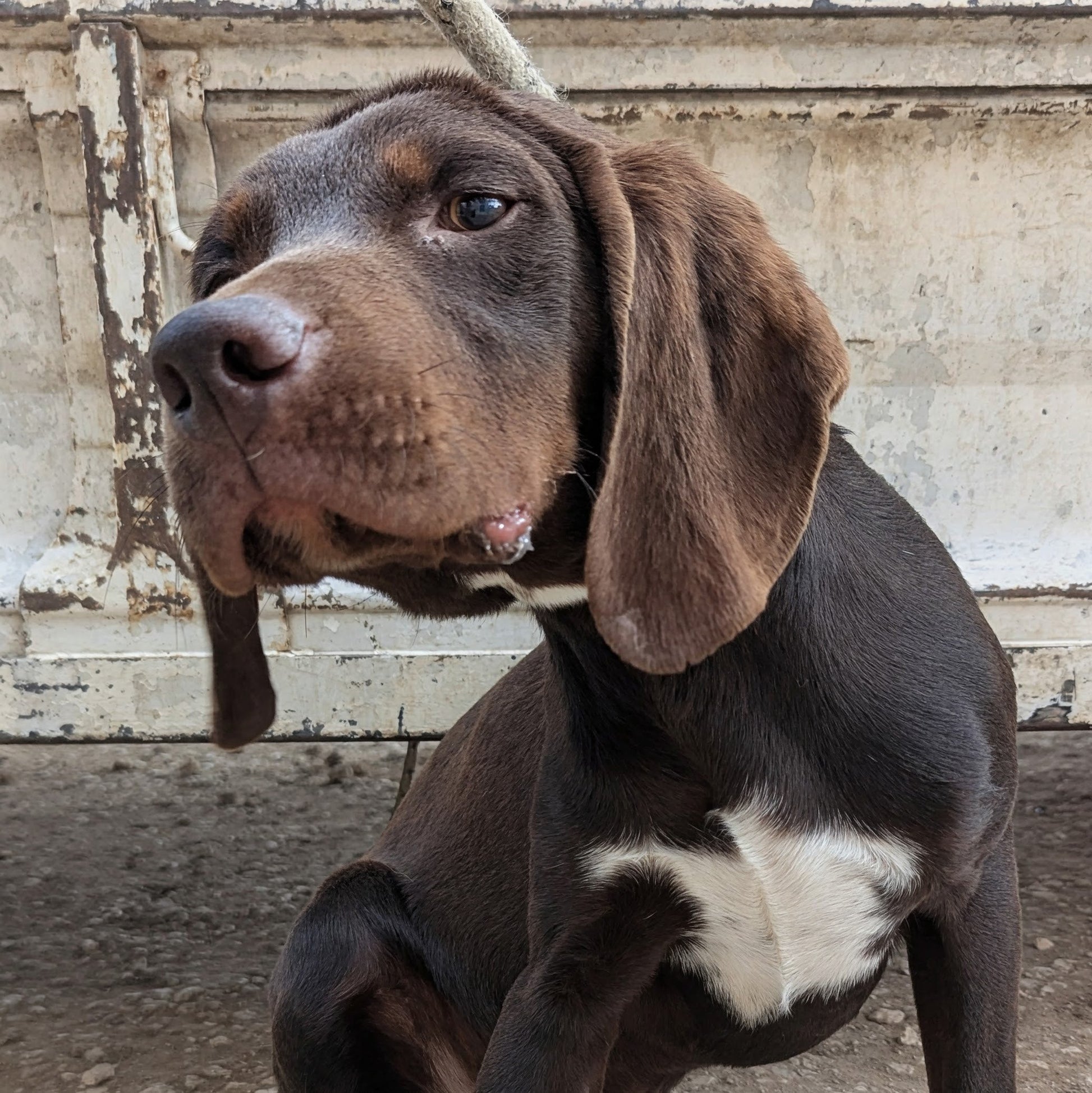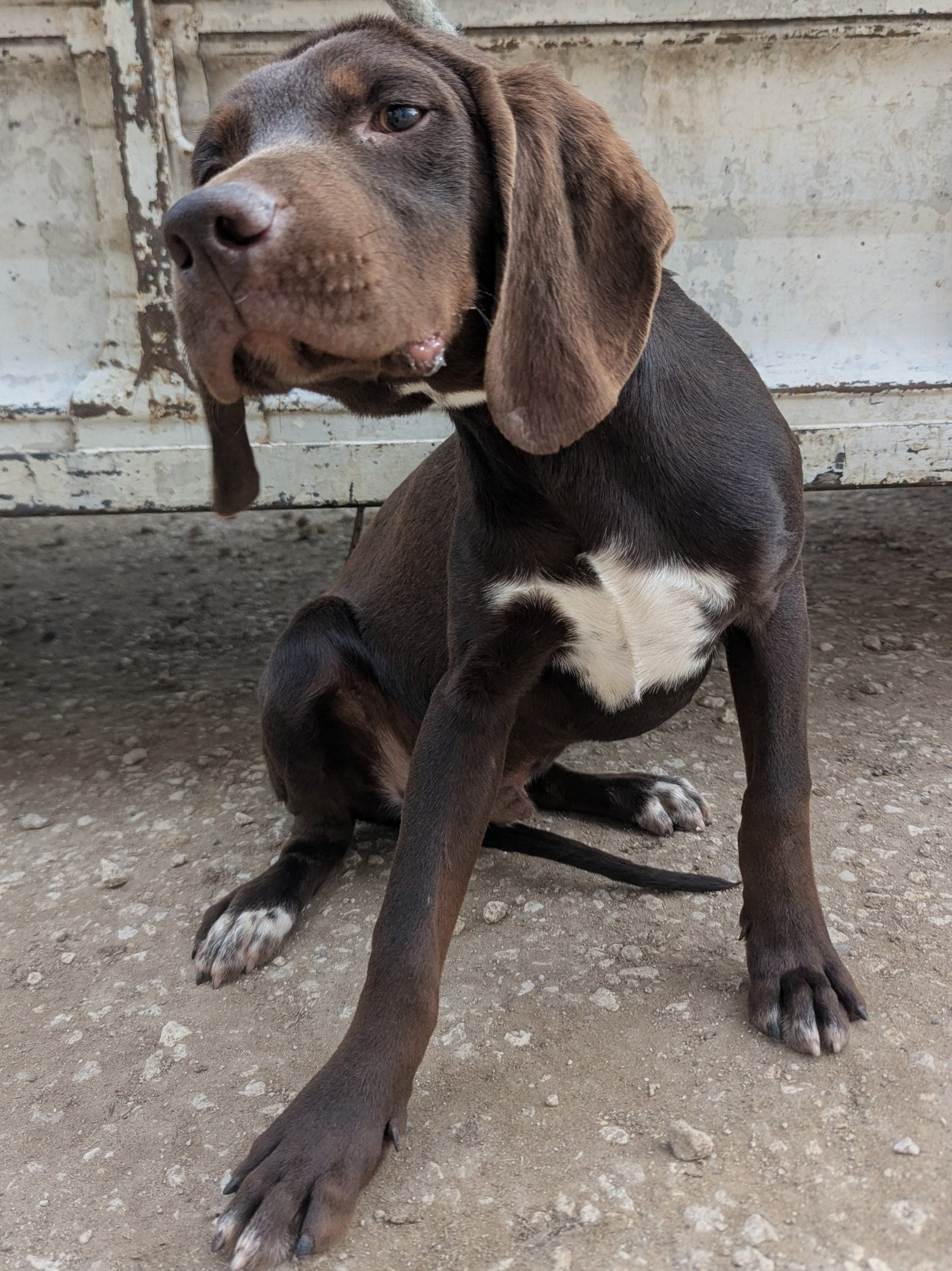 Medium-sized young hunter cross male. Dark brown coat with white patch on his chest