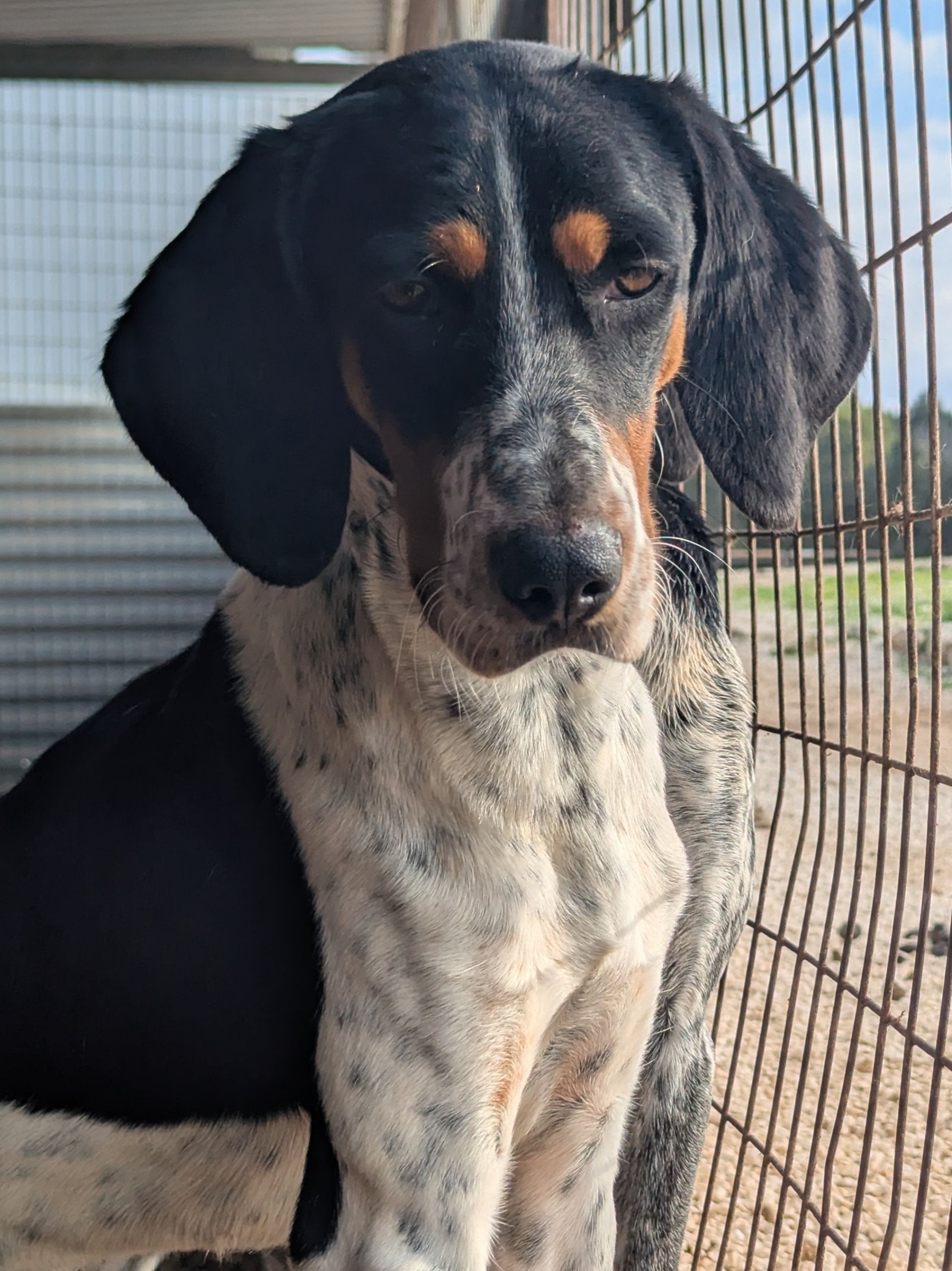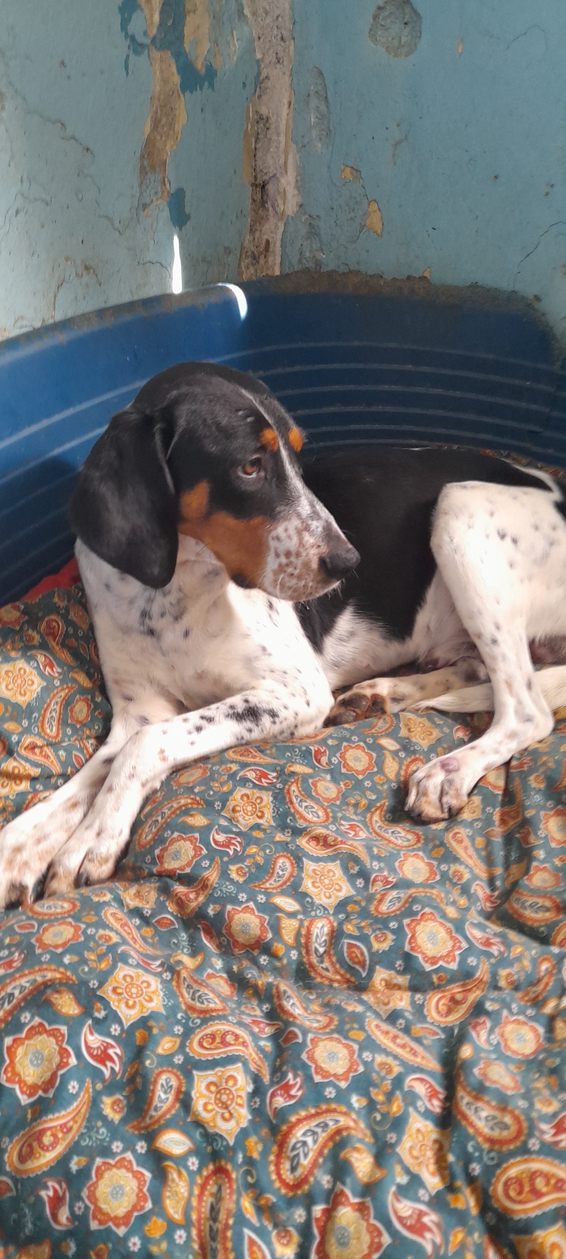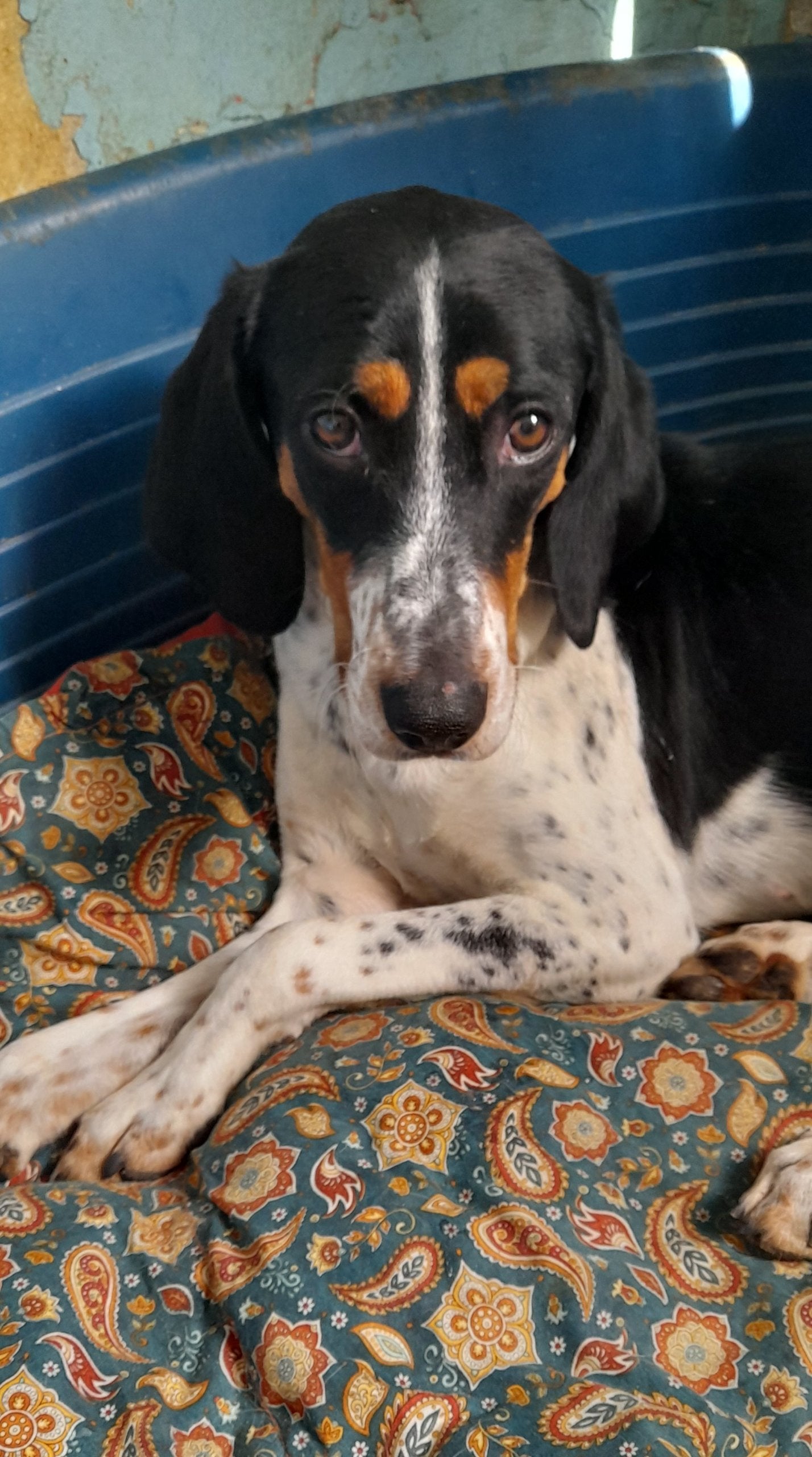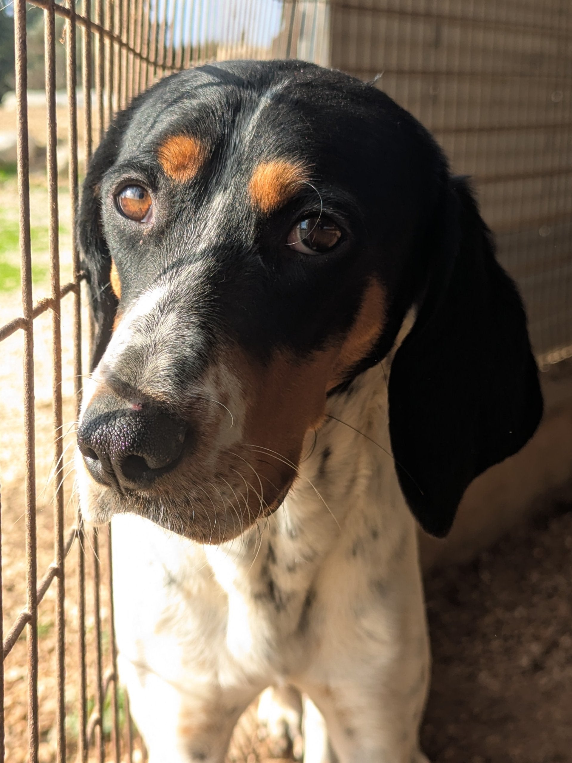 Exceptionally handsome tri-coloured Hound. Still timid with people and other dogs.