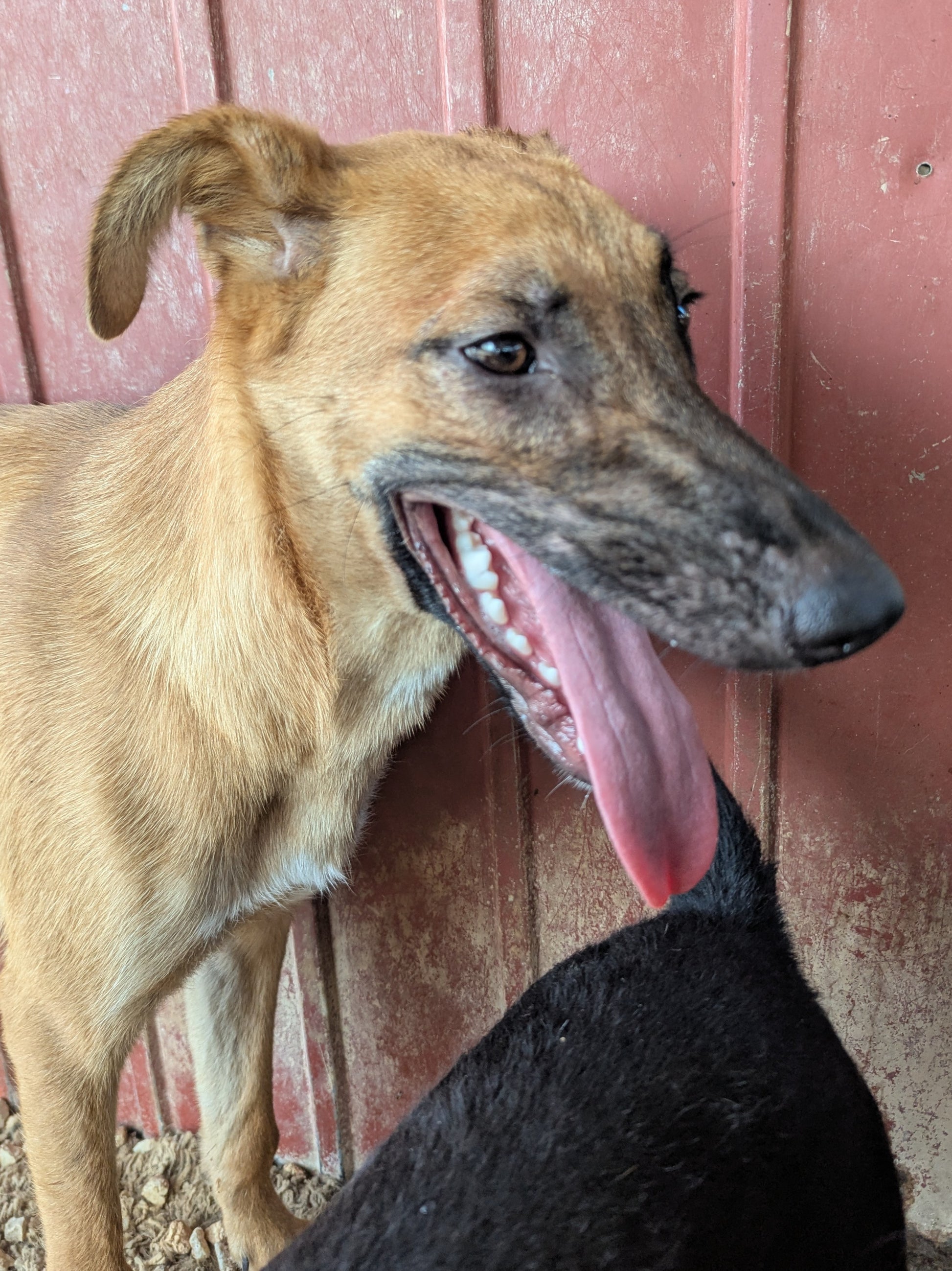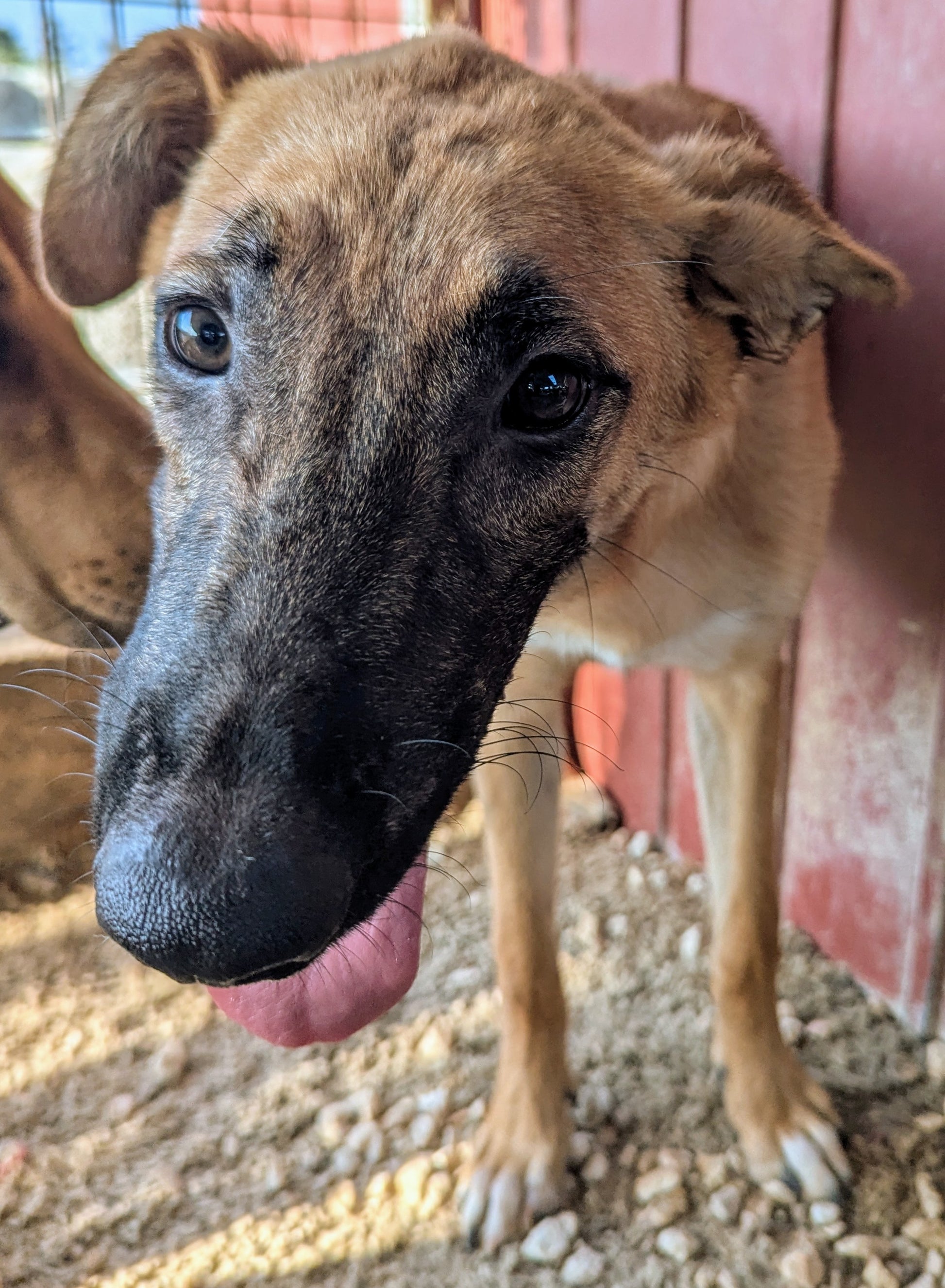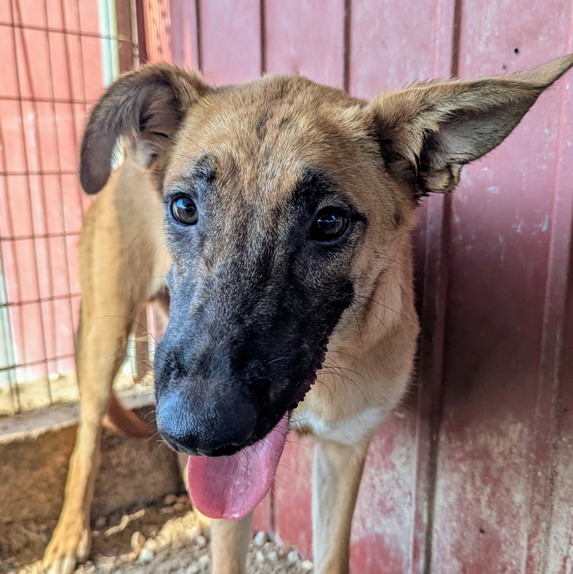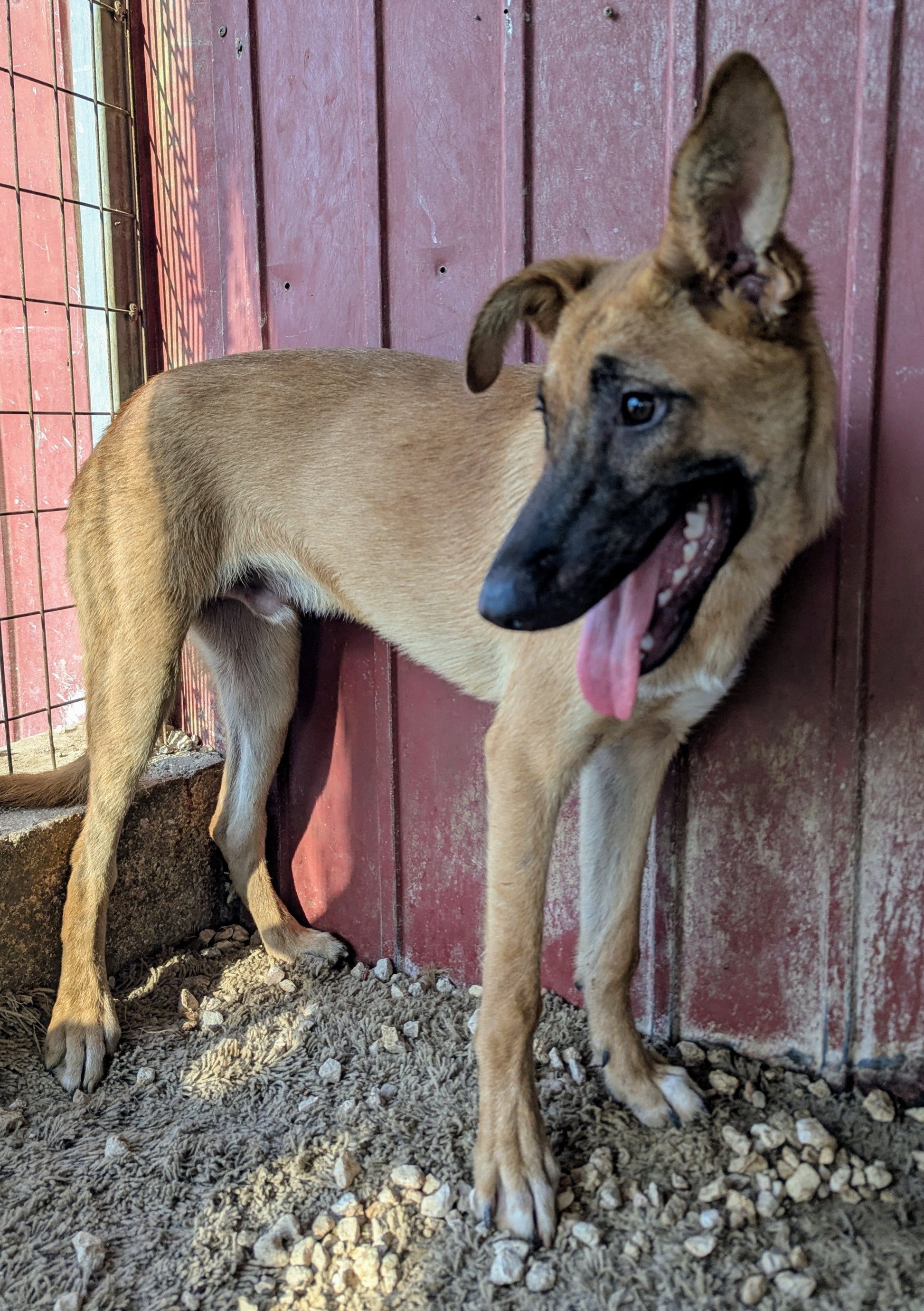 Высокий худощавый молодой мальчик, метис овчарки, золотистого окраса с черной маской. Большие смешные уши. Одно висит, другое торчит. Игривый, дружелюбный