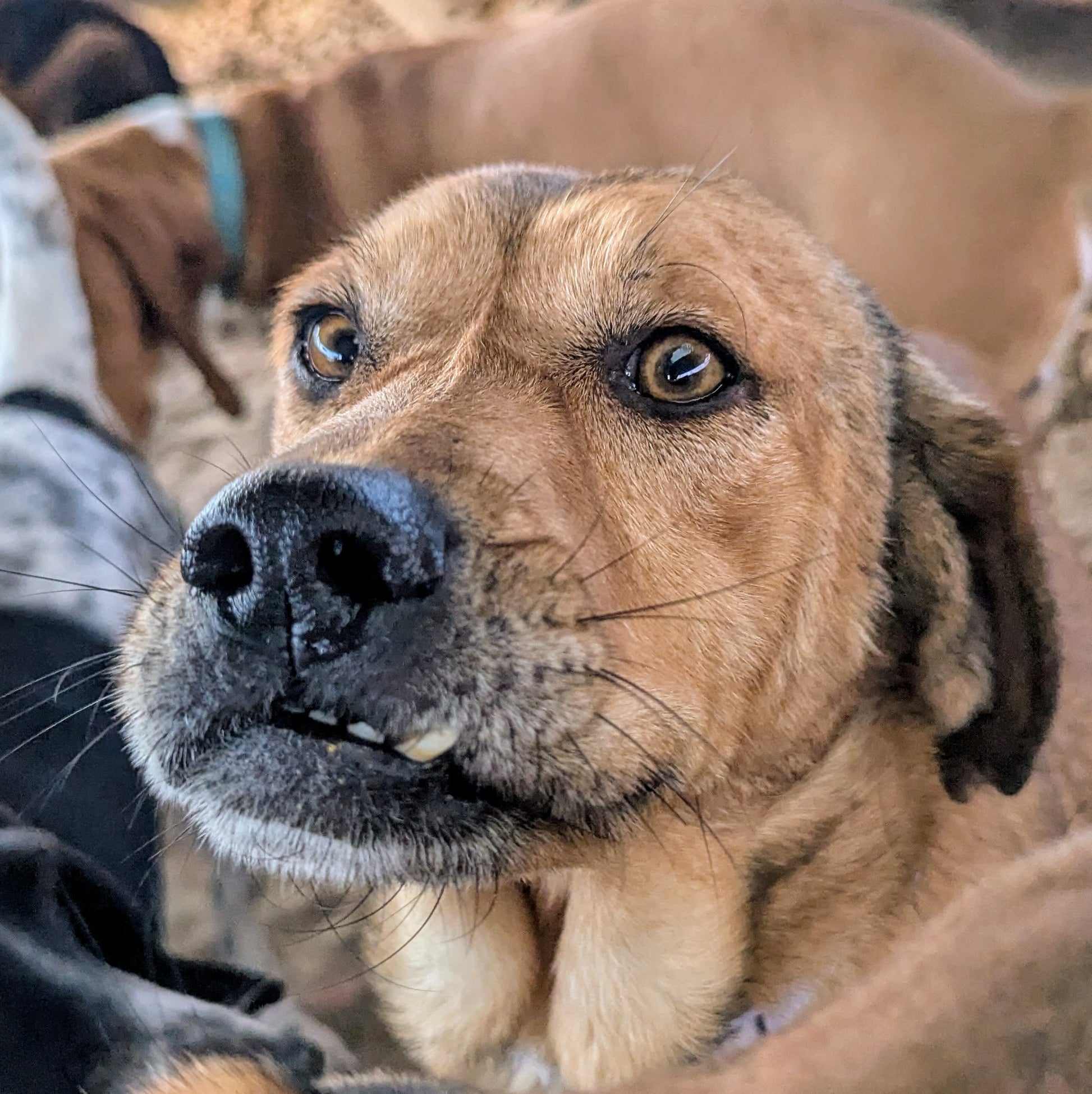 Очаровательная девочка с неправильным прикусом, с одной стороны торчат зубы. Доминантная по отношению к другим собакам