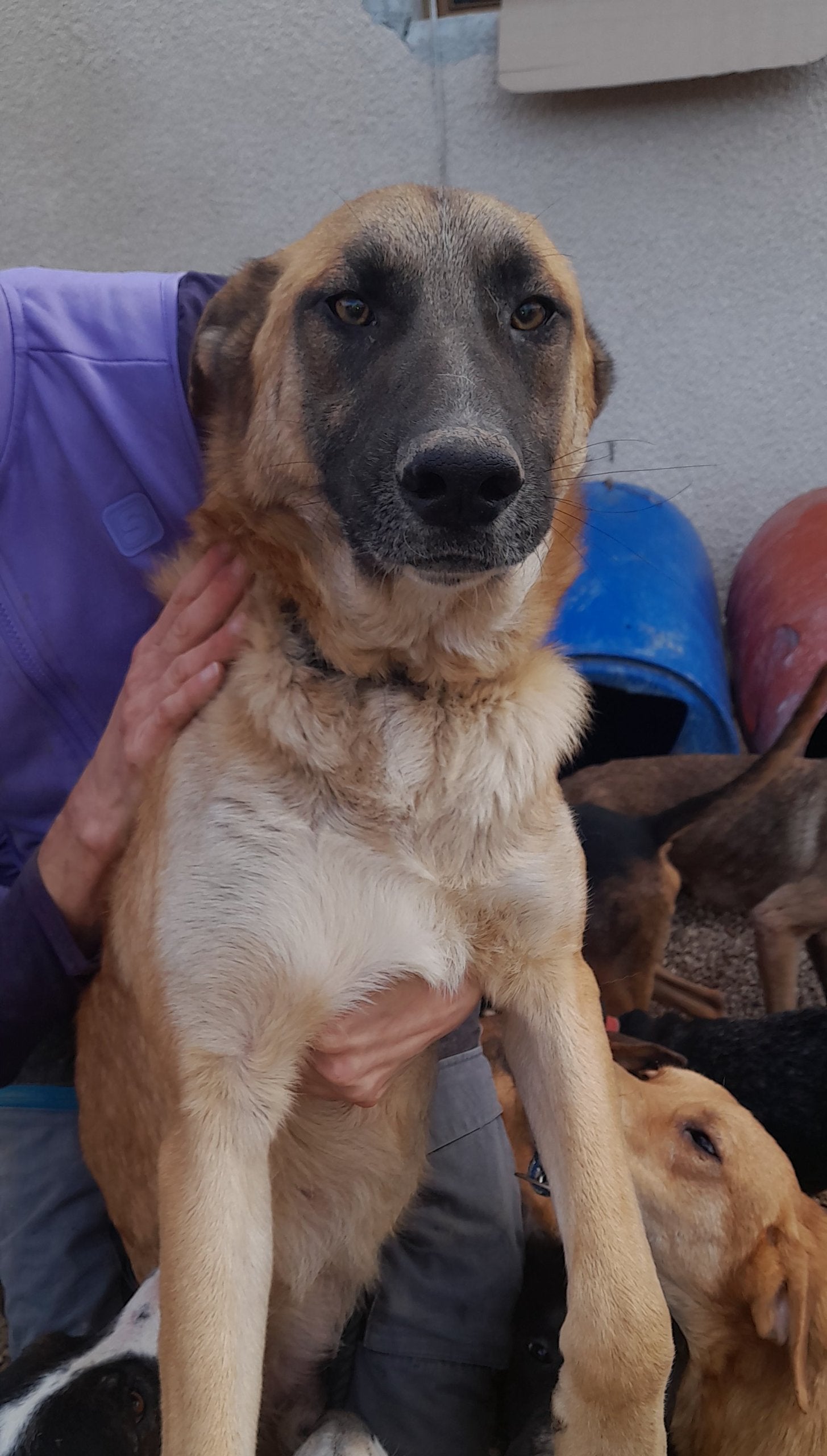 Friendly, tall blonde Shepherd Malinois cross, black face. Very good with people, just a bit shy to come out from the yard. Good boy