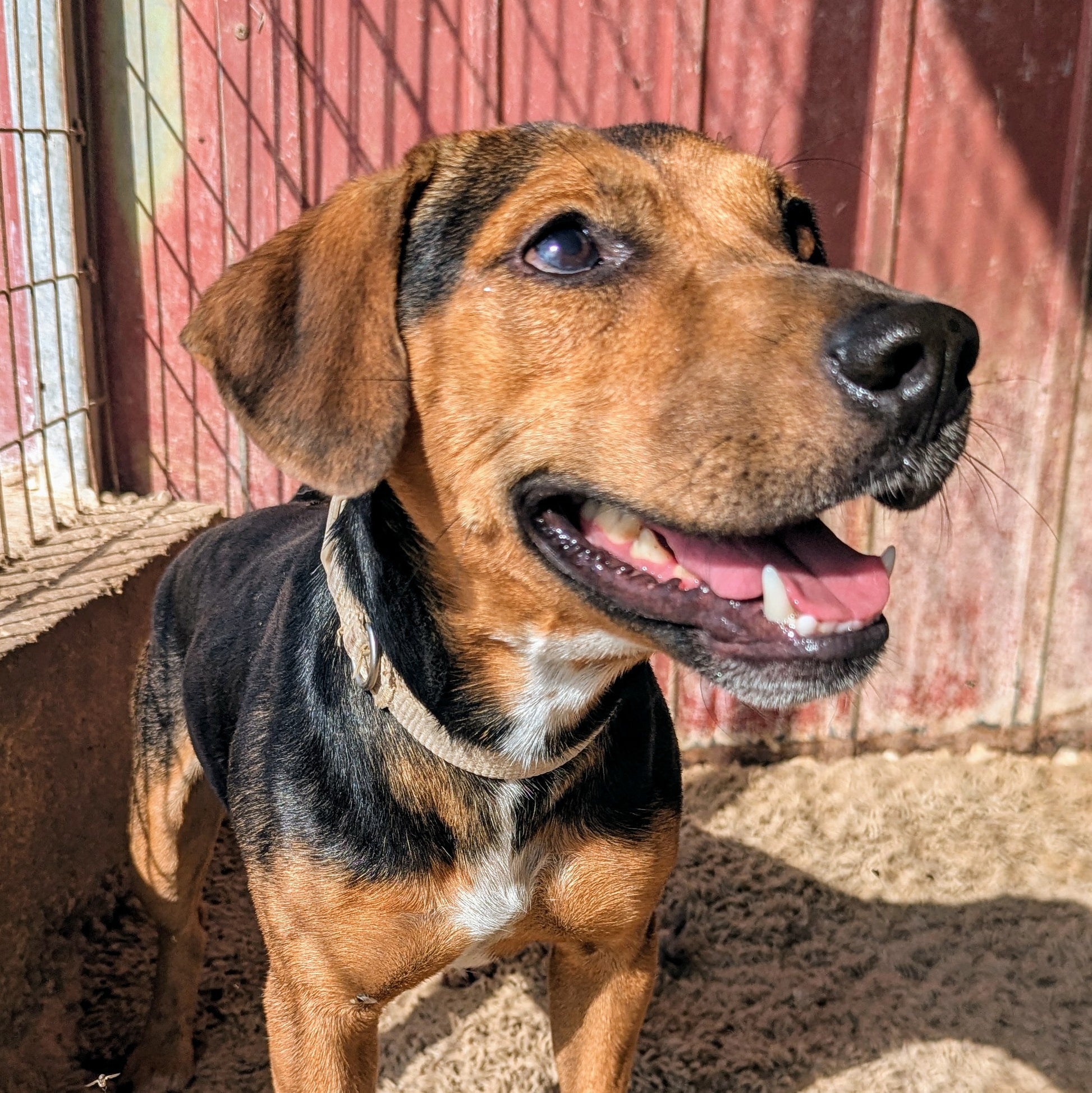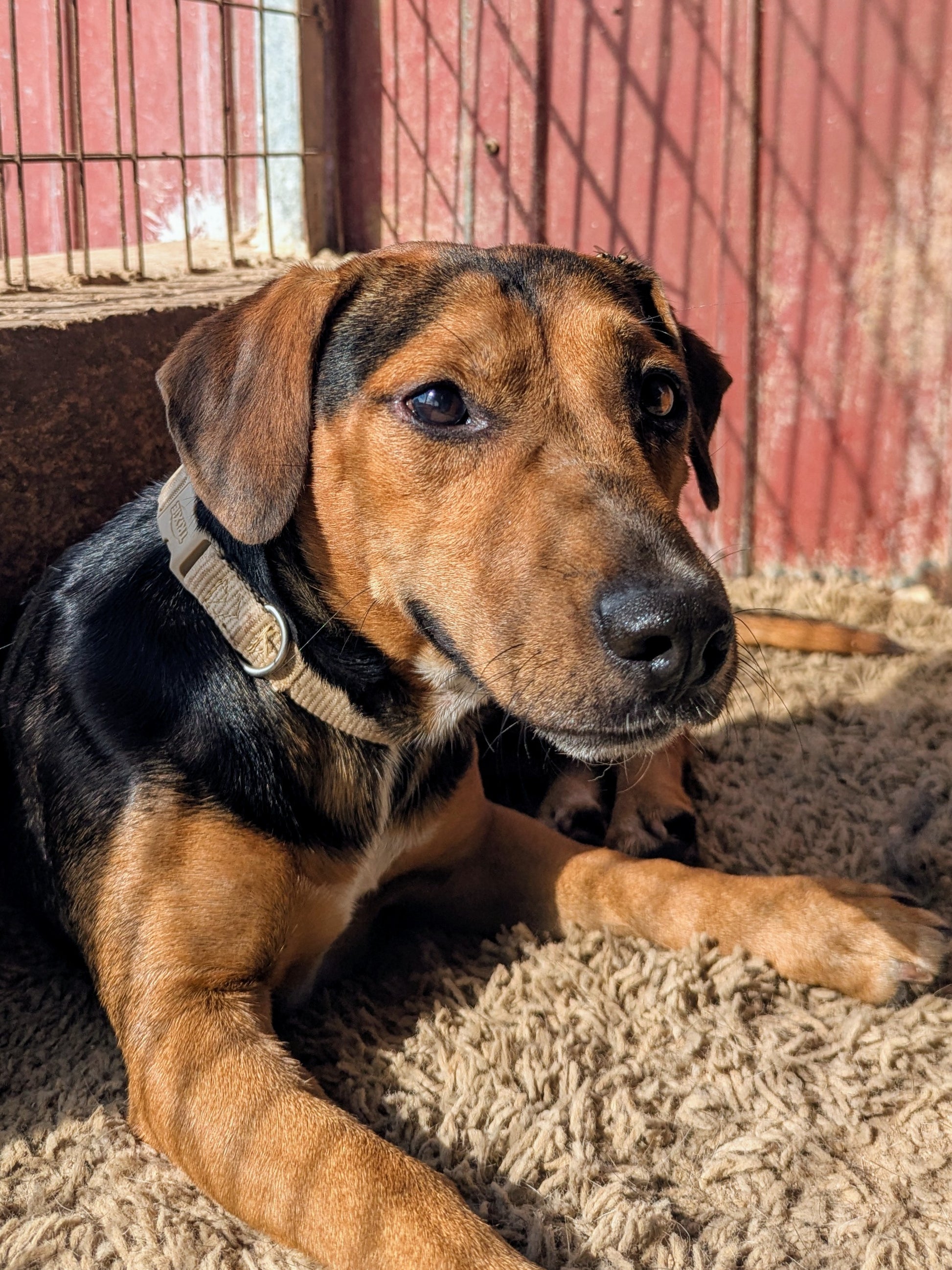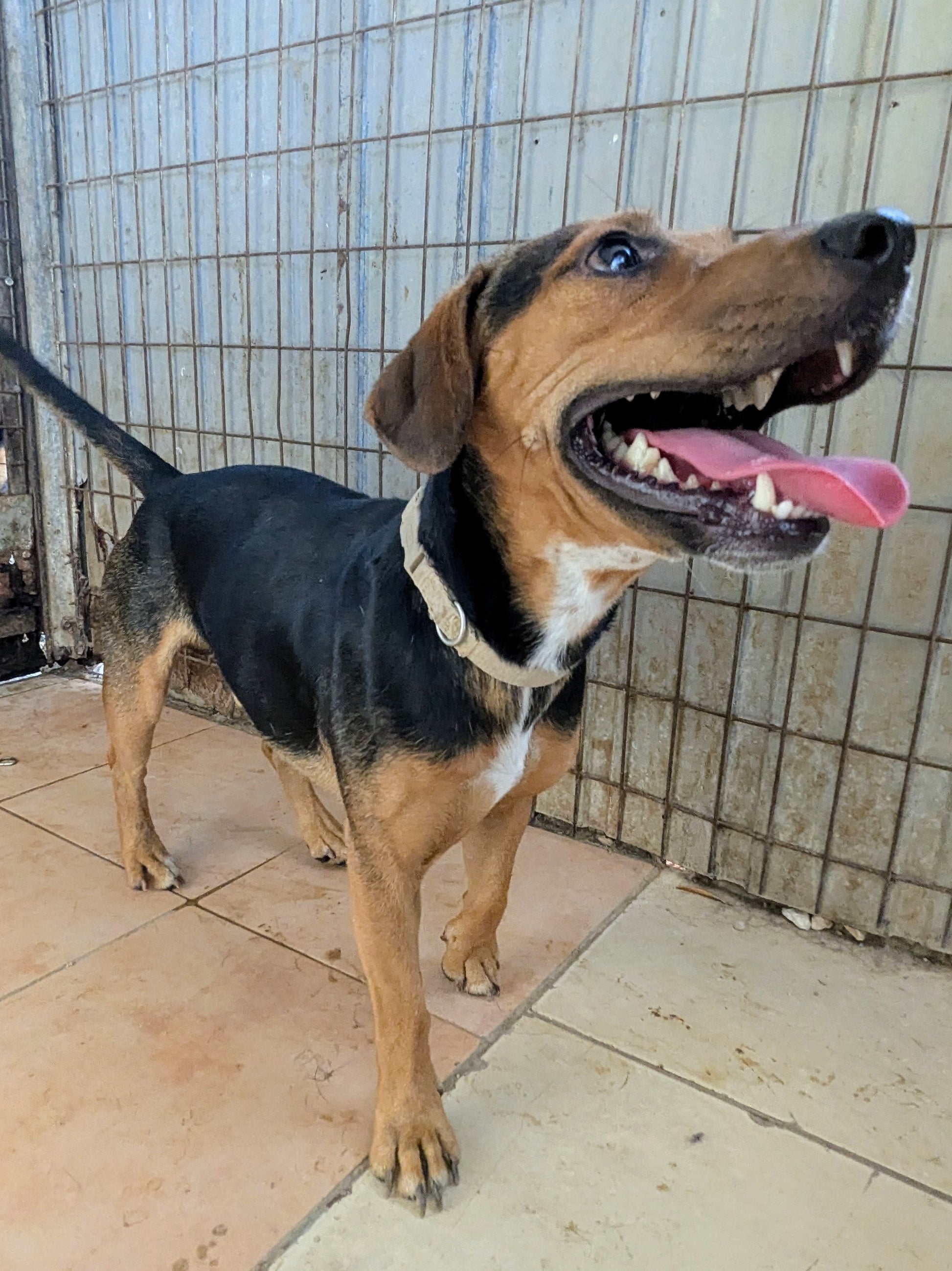 Small short-legged young boy, black and tan with white stripe on his chest. Dominant with other, even bigger, dogs. Good on lead