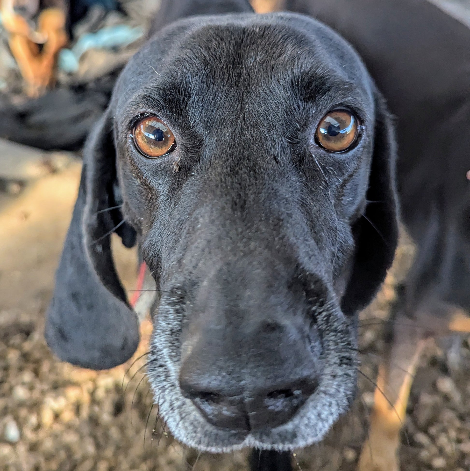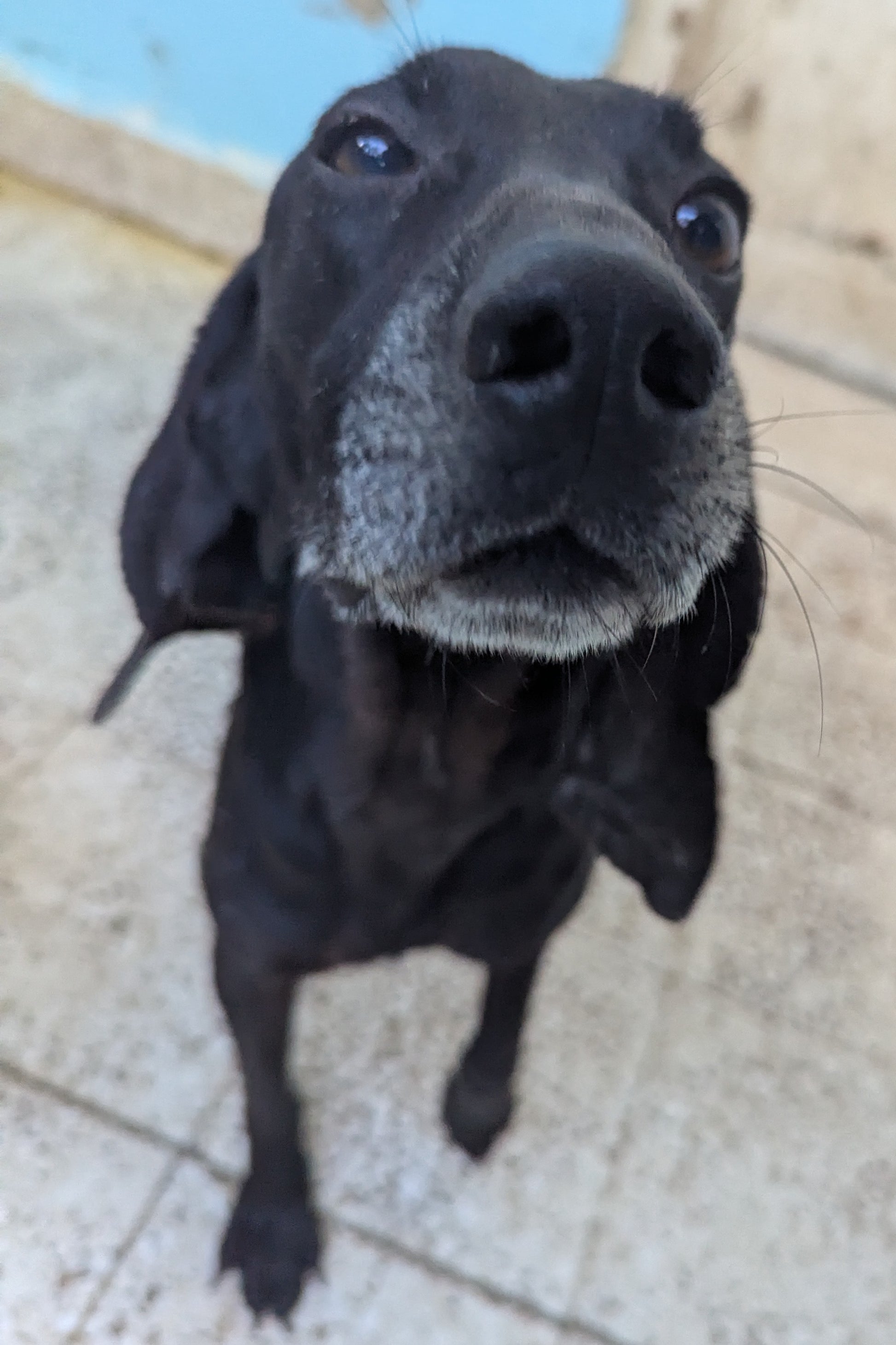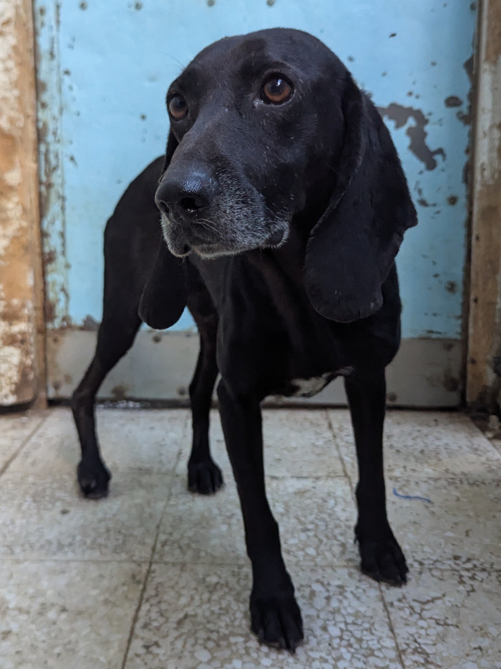 Небольшого к среднему размеру мальчик, черного окраса с проседью на морде. Длинные уши с загнутыми внутрь кончиками. Спокойный, нейтральный