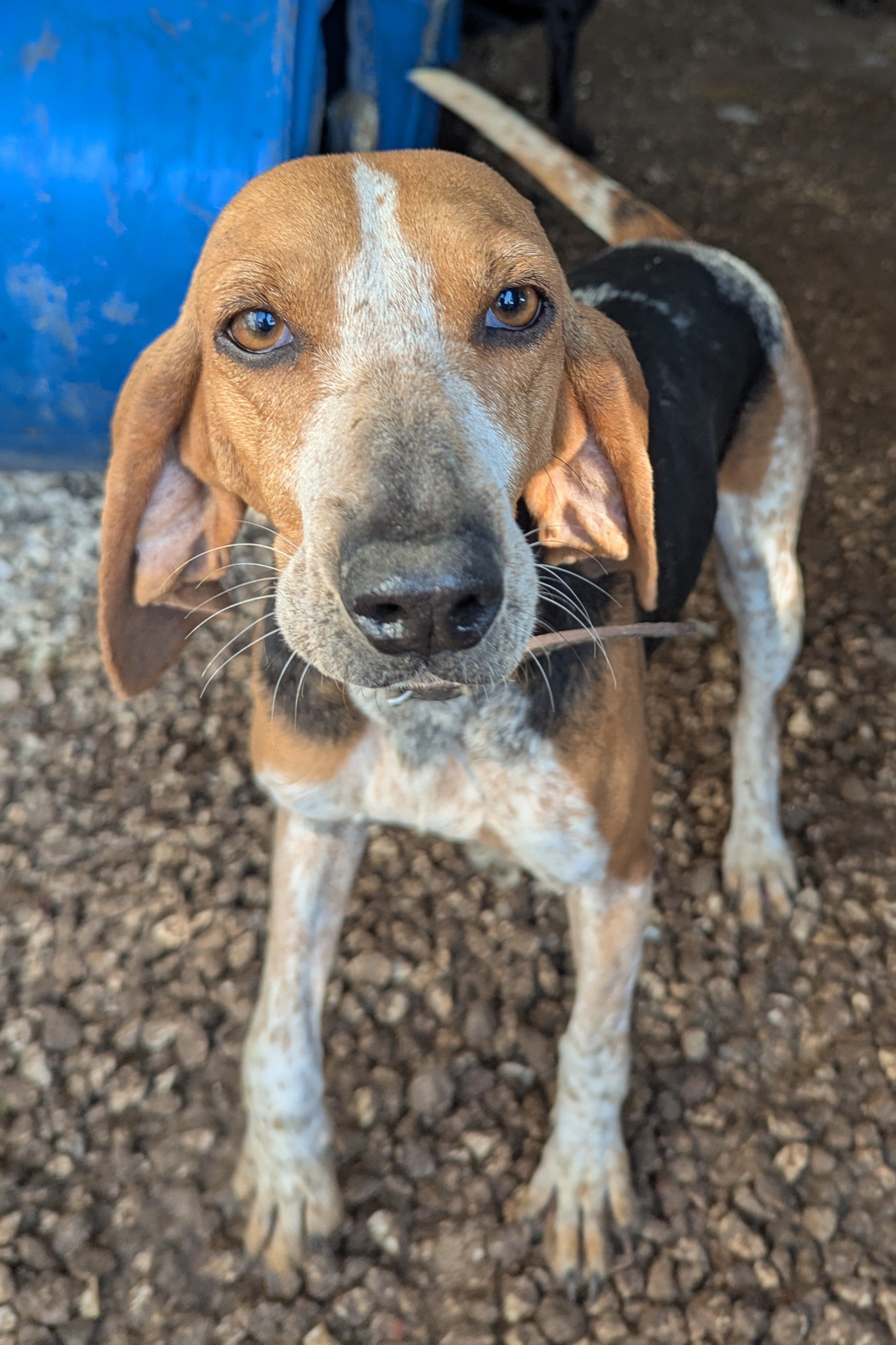 Небольшого размера девочка охотничей породы, трёхцветная: белый, черный, рыжий