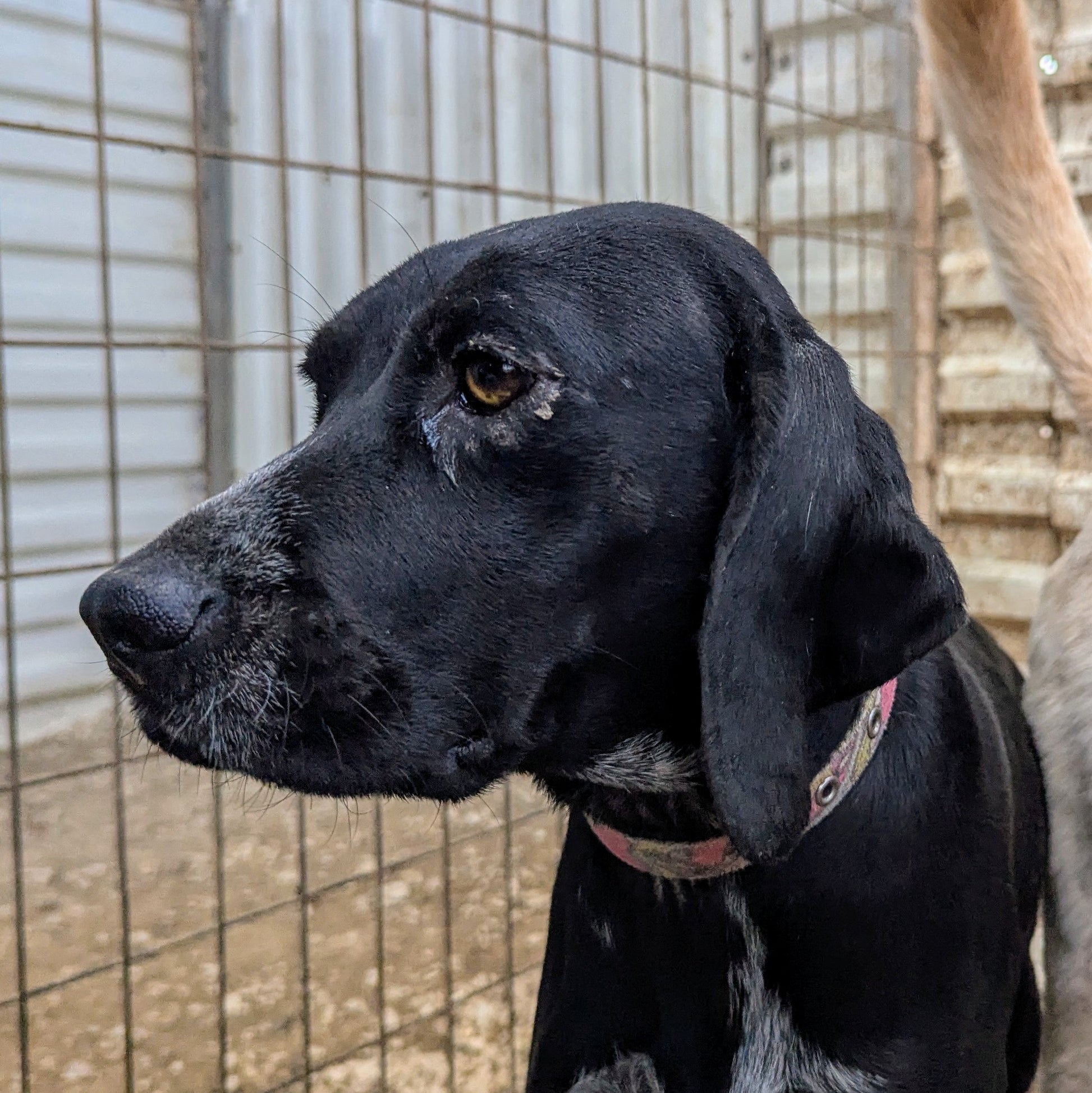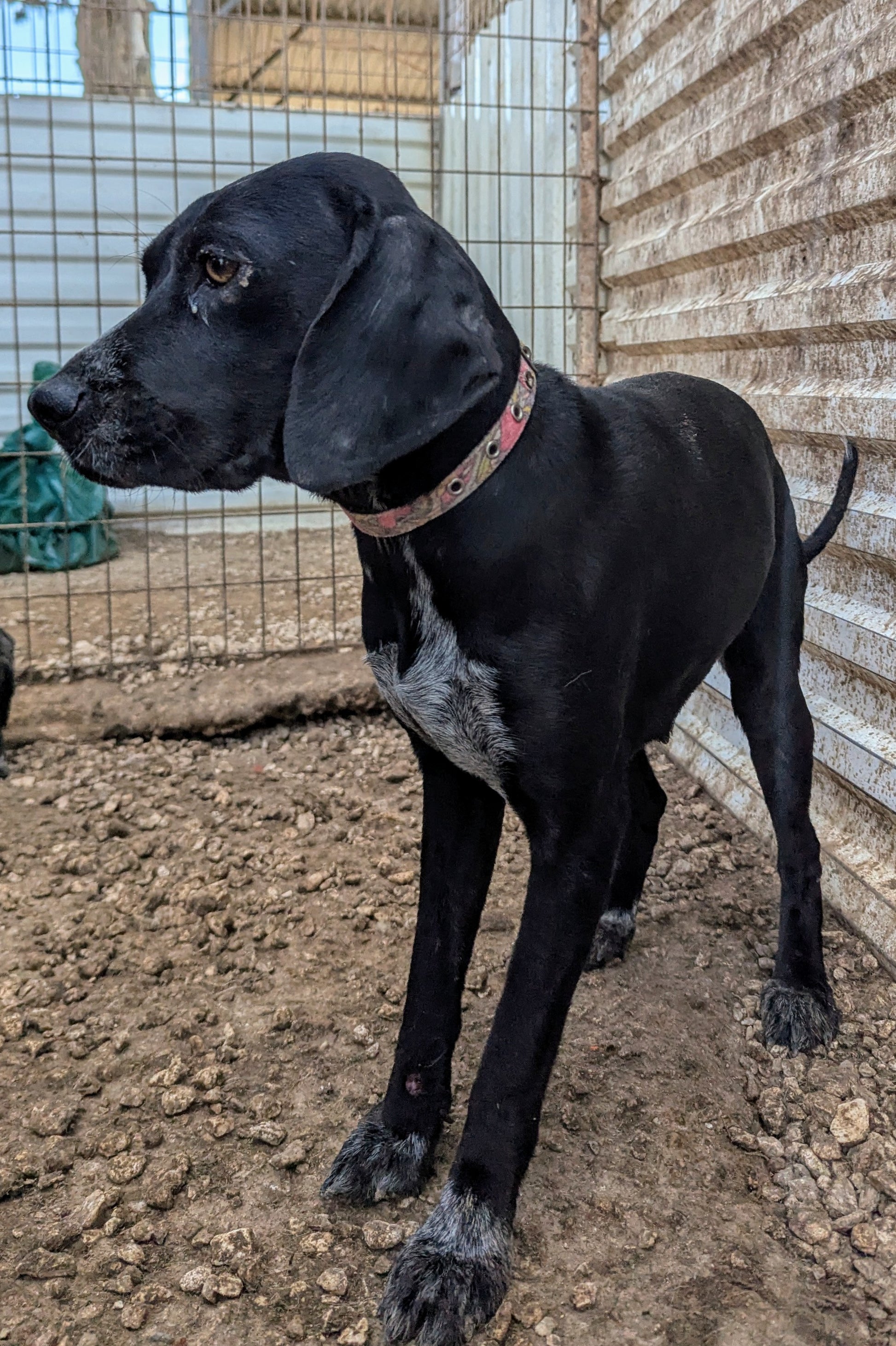 Маленькая собака черного окраса с проседью на груди и кончиках лап. Ошейник с растительным узором