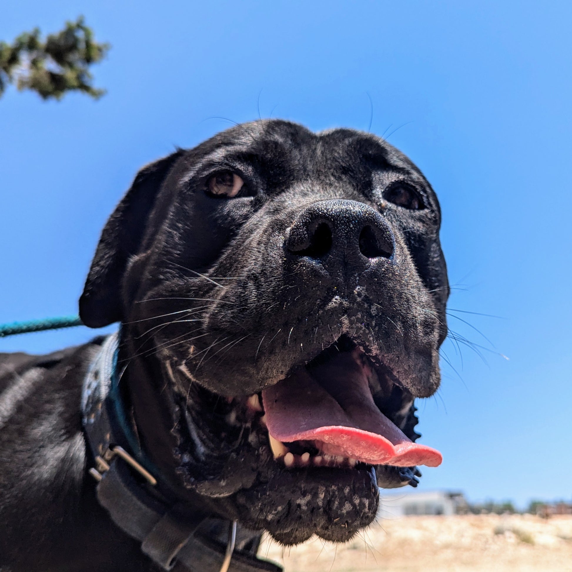 Американский бандог, окрас черный, около 3 лет. К людям дружелюбен. К собакам насторожен. Кошек гоняет. К поводку приучен, тянет. Активный. Послушный