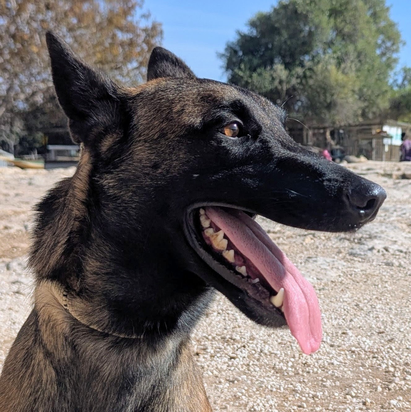 Medium-sized young Malinois cross male. Brown with black coat. Very affectionate with people. Good on lead