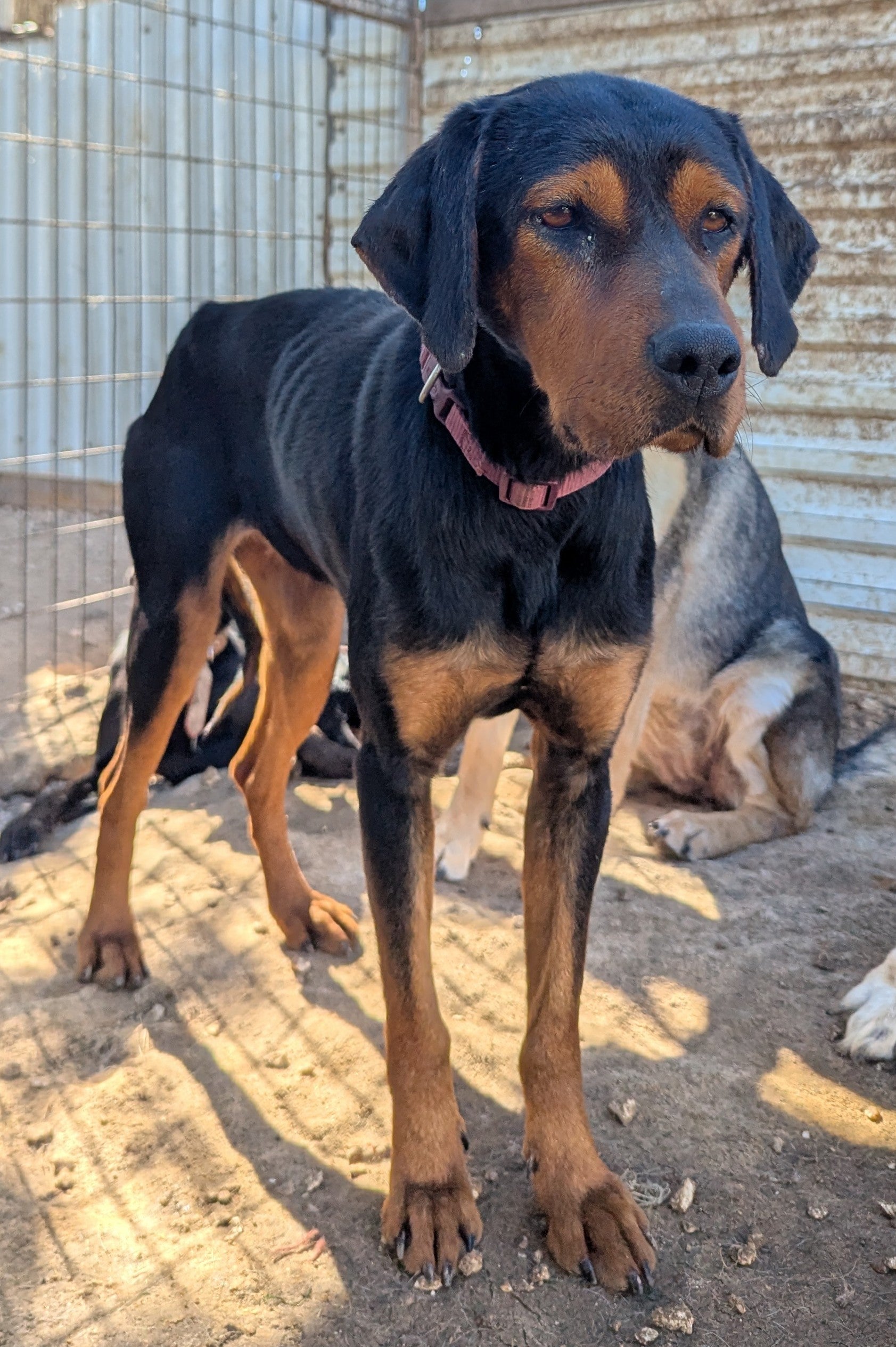 Среднего размера девочка охотничей породы, черного с коричневым окраса. Любит внимание человека