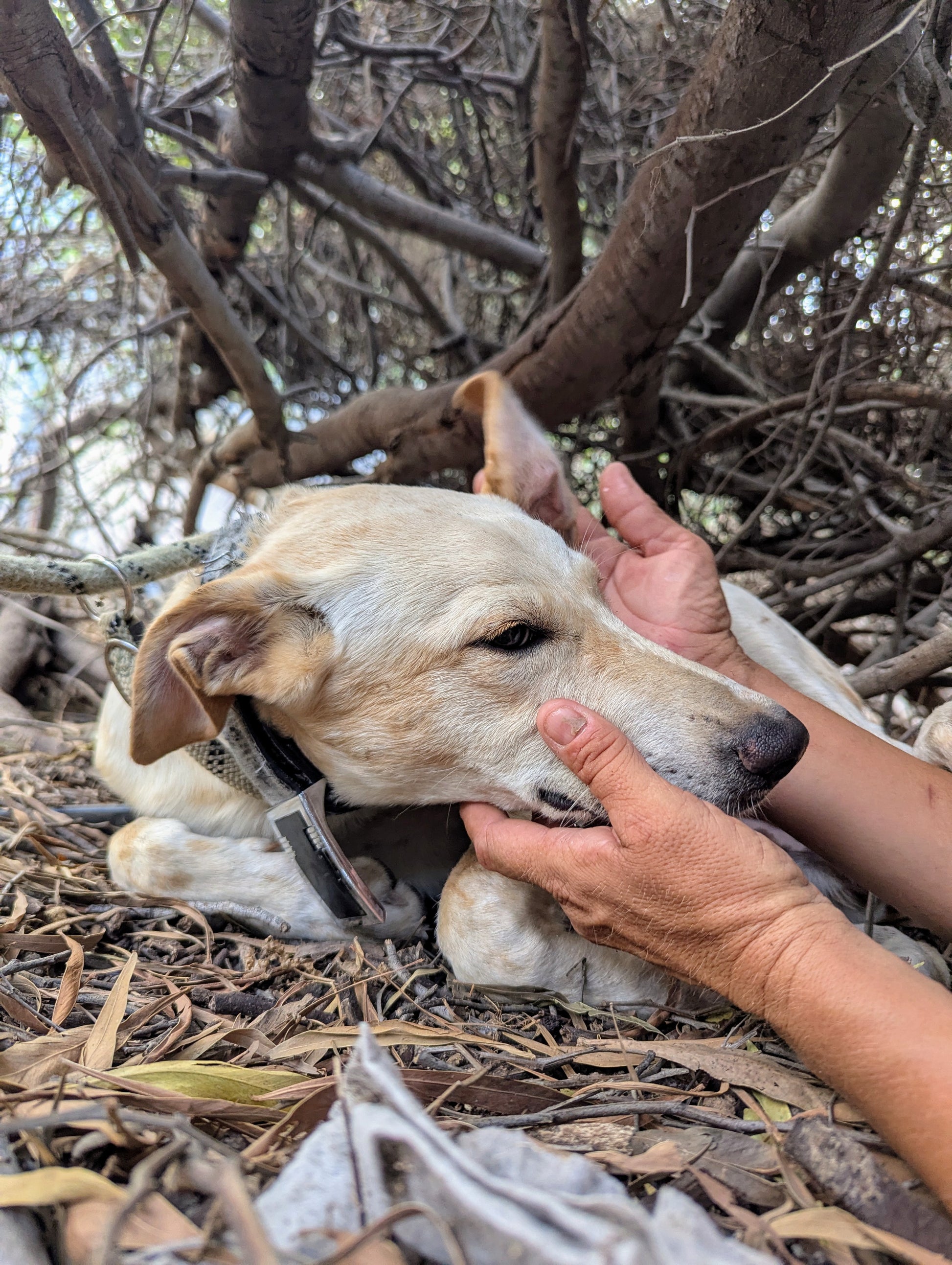 Medium-sized young Labrador cross female, pale coat. Friendly and affectionate. She's still scared by being surrounded by other dogs