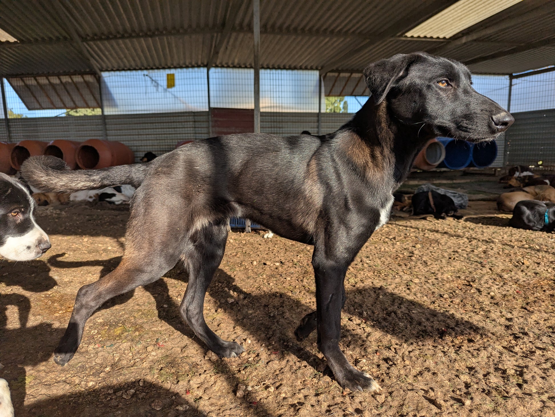 Молодой мальчик среднего размера, черный с белым пятном на груди и серым подпалом на боках, шее и задних лапах. Брат Red'а. Дружелюбен к людям, иногда задирист. Simparica 21.4.25 Margarete