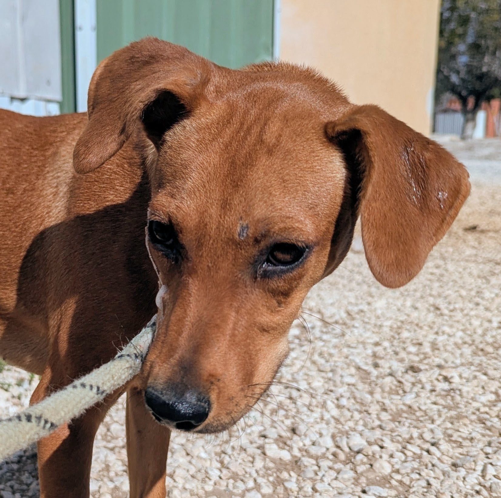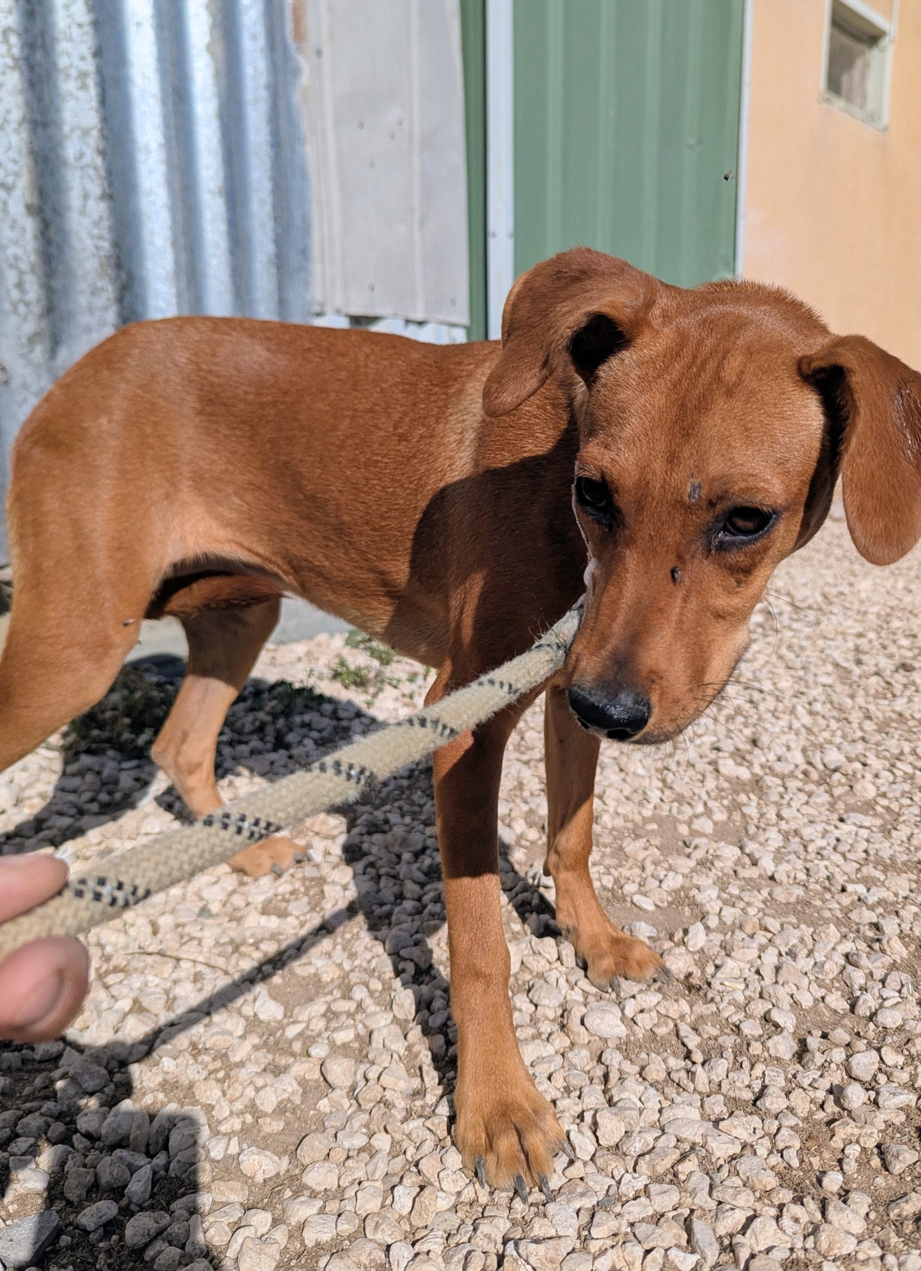 Small to medium-sized young mixed breed female, smooth tan coat. Very timid