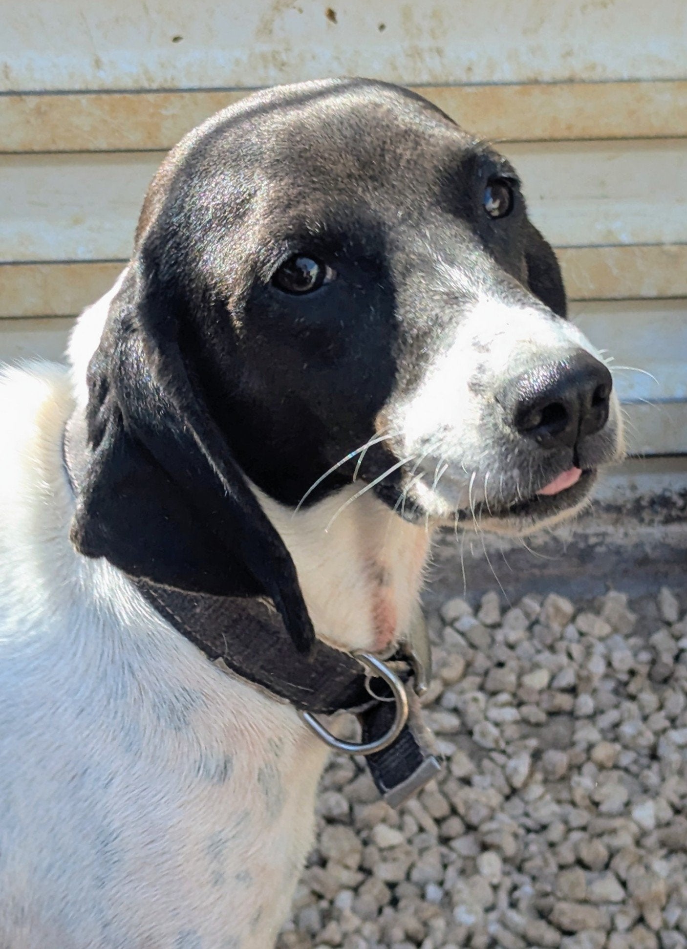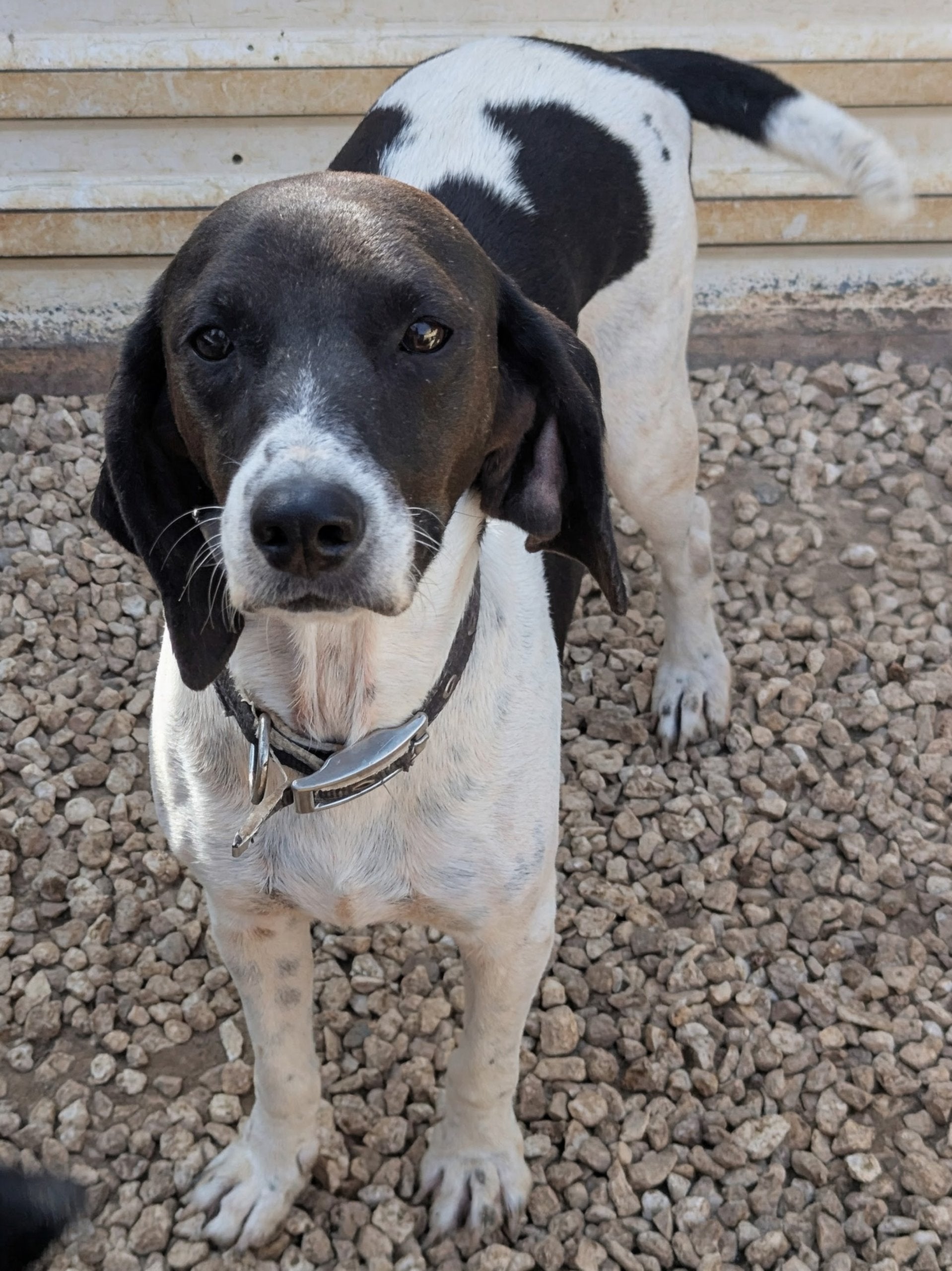 Small-sized hunter cross female, white with black patches. Calm, friendly, affectionate