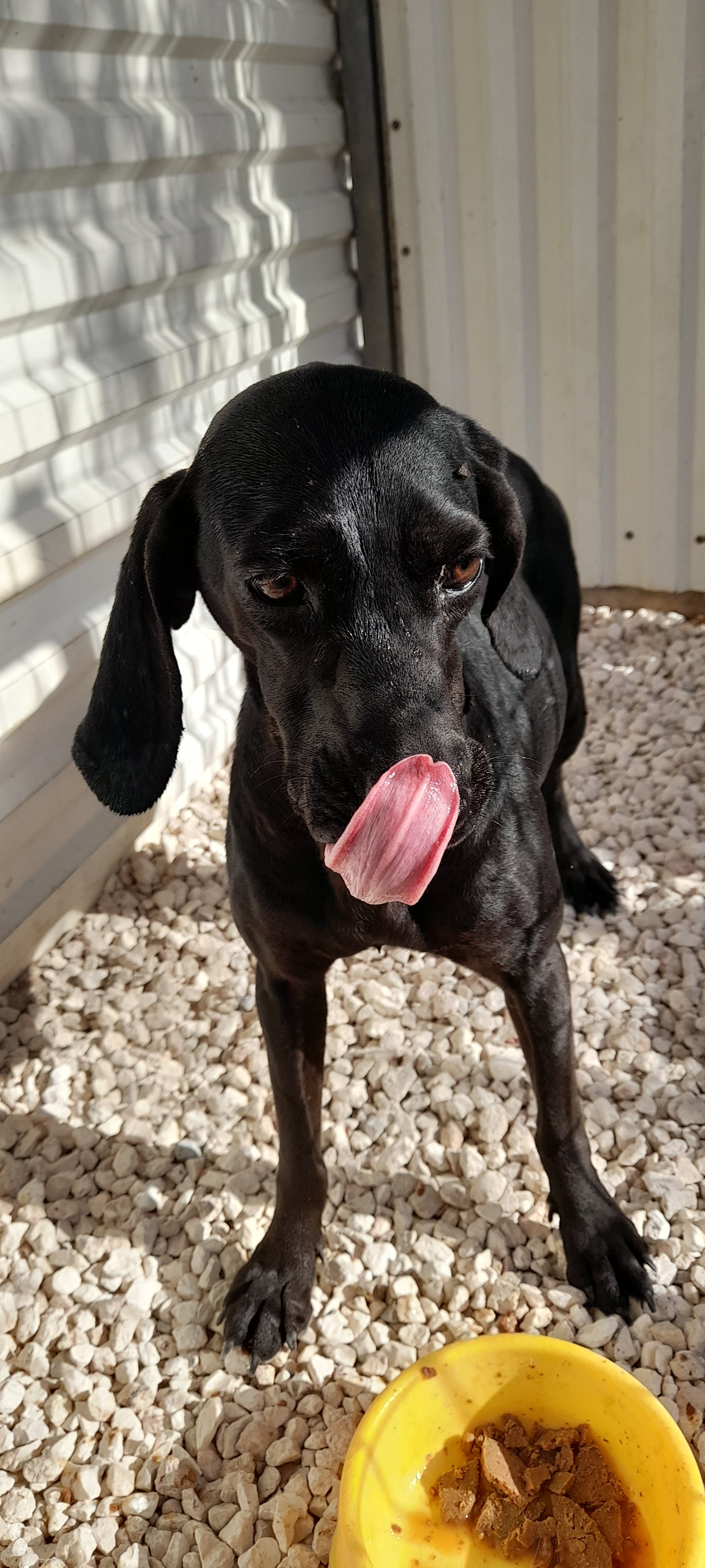 Black short-haired shiny fur, very friendly. Bit skinny..Gets often attacked by others in big pen. Was pregnant and got operated in April 2025.