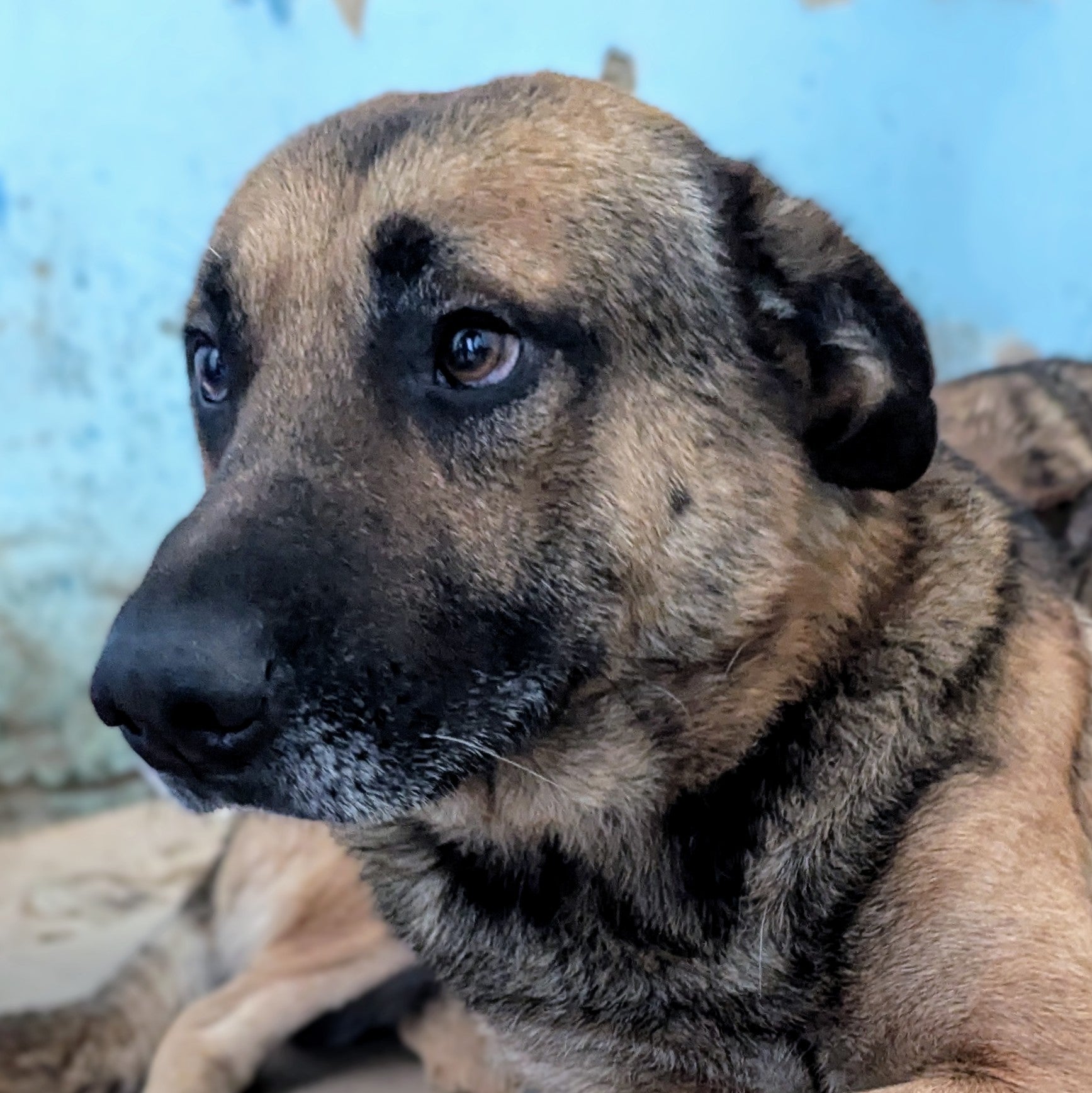 Крупный метис немецкой овчарки. Окрас коричневый с черным и сединой на морде