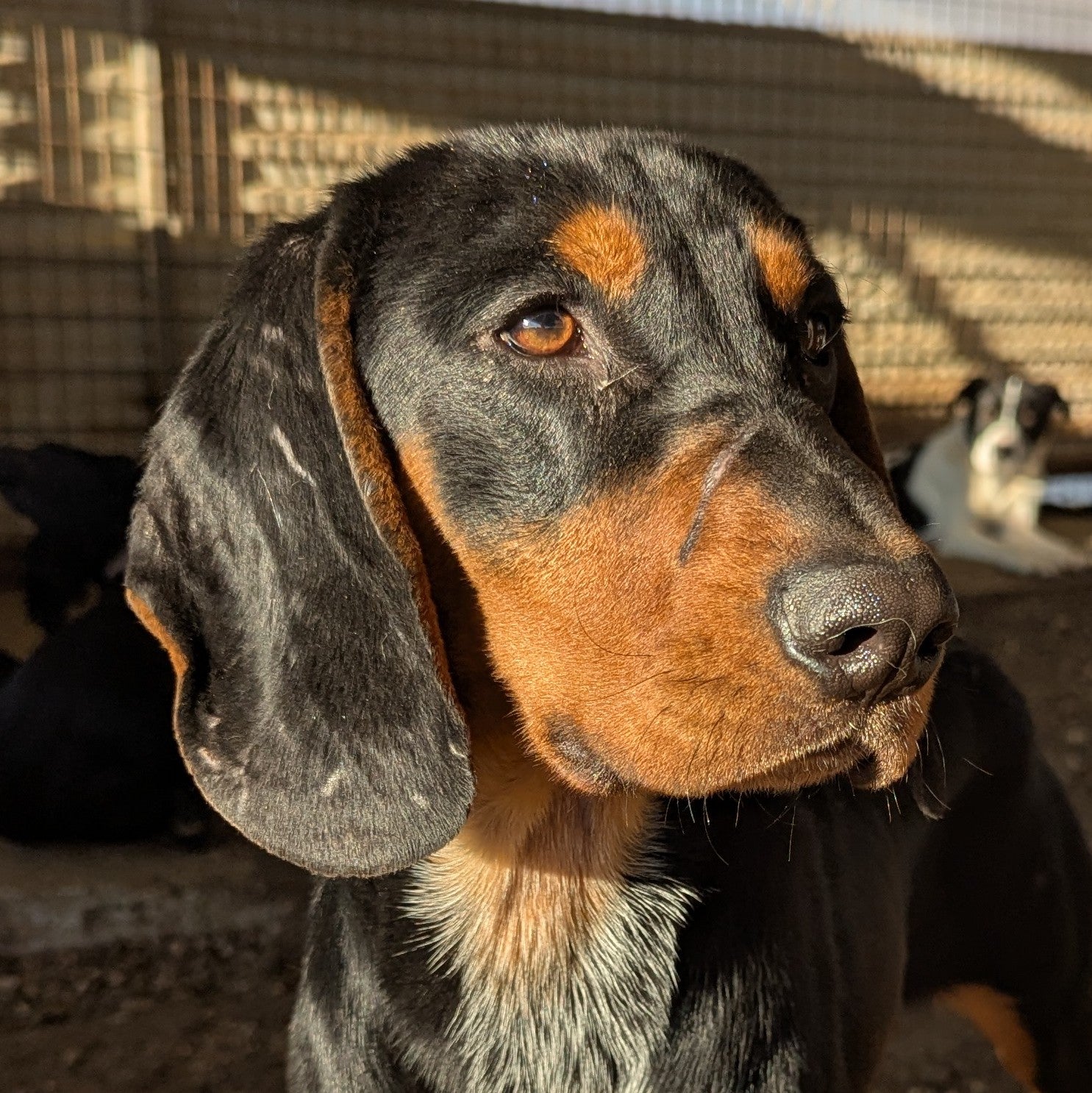 Небольшой пёс охотник, черный с подпалом и серым пятном на груди. Бывает задирист с другими собаками. Любит внимание человека