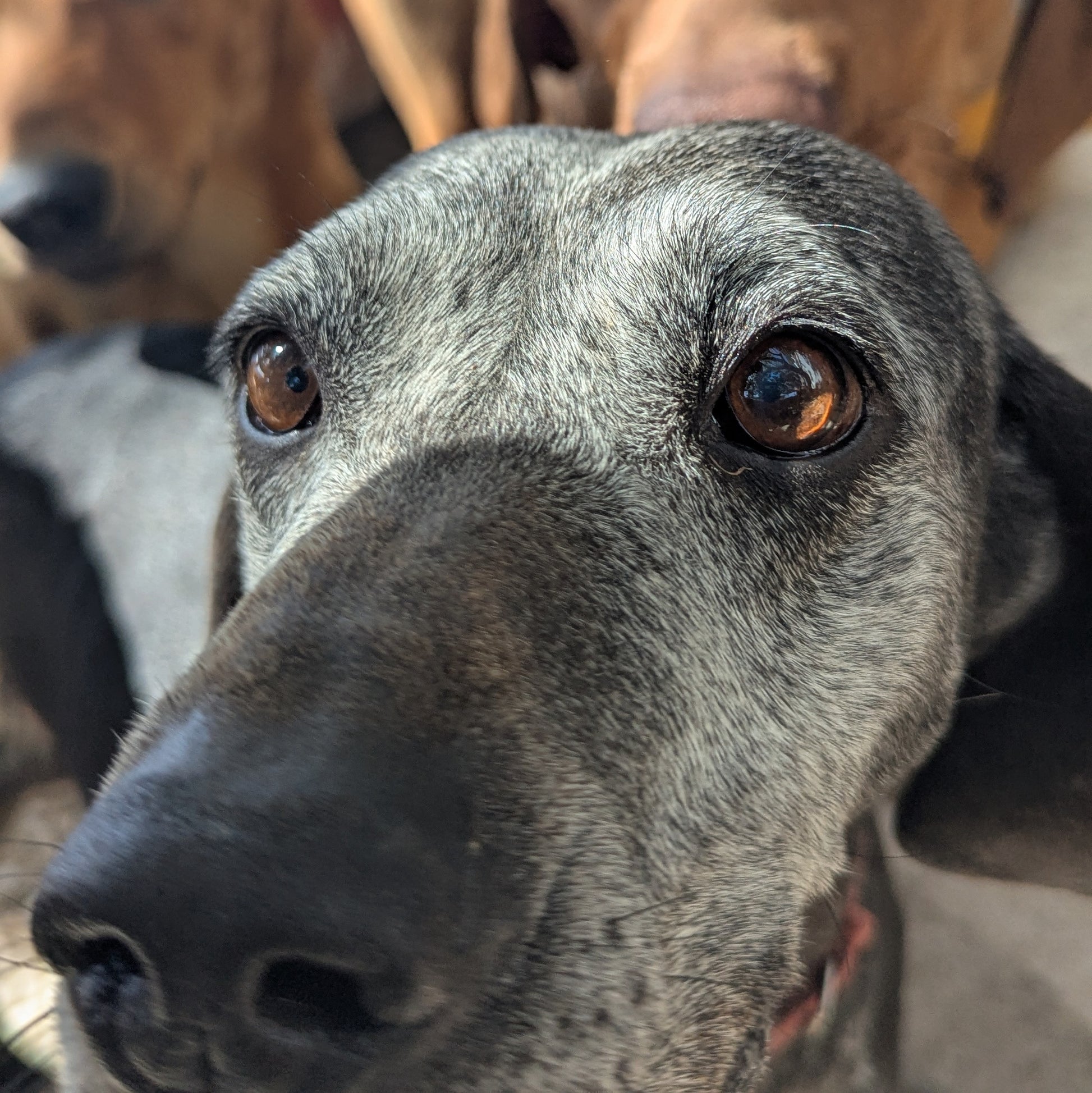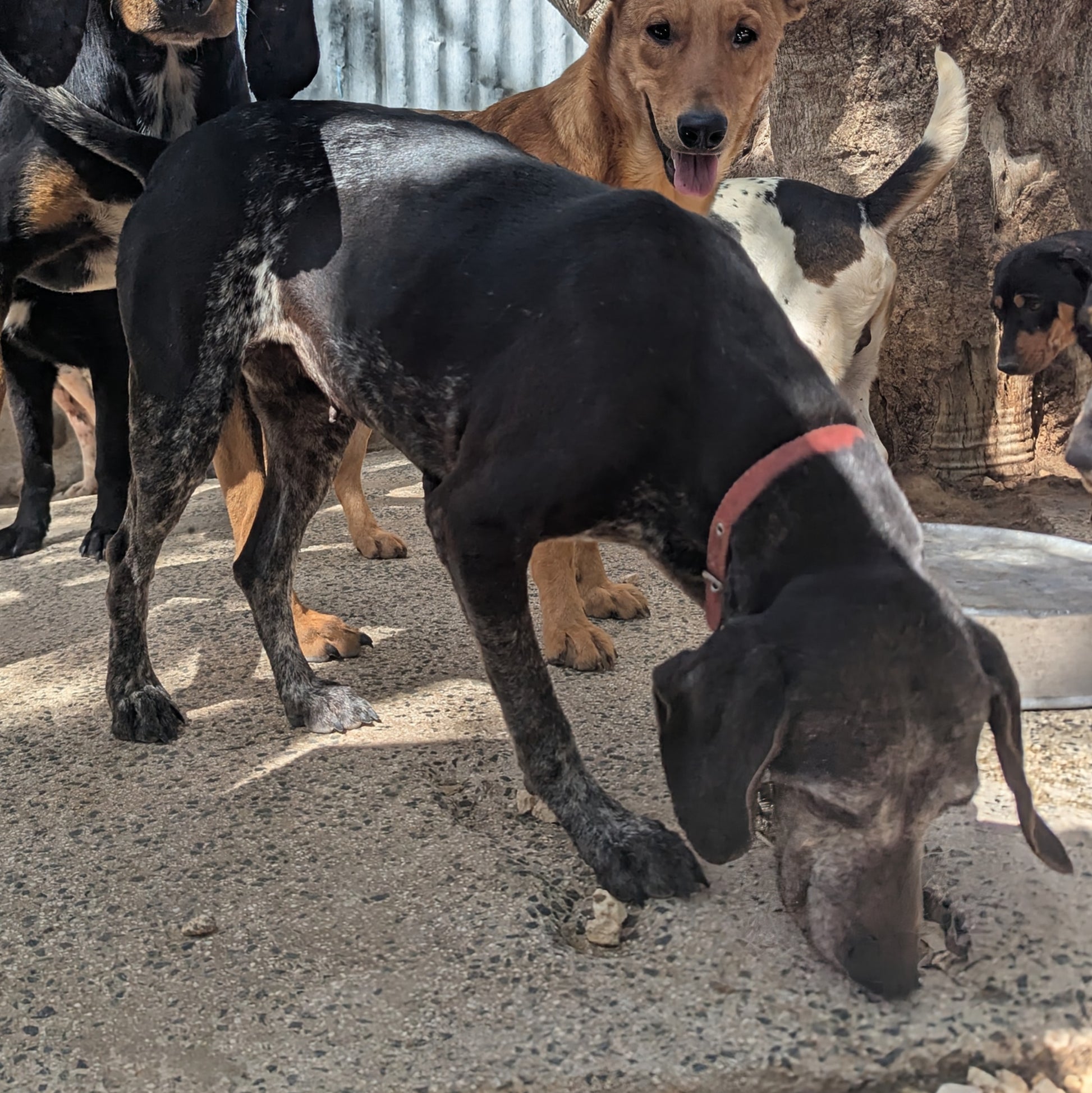 Среднего размера девочка, средних дет, черного окраса с проседью на морде, боках, животе. Человекоориентированная, боится африканцев. Куратор Светлана
