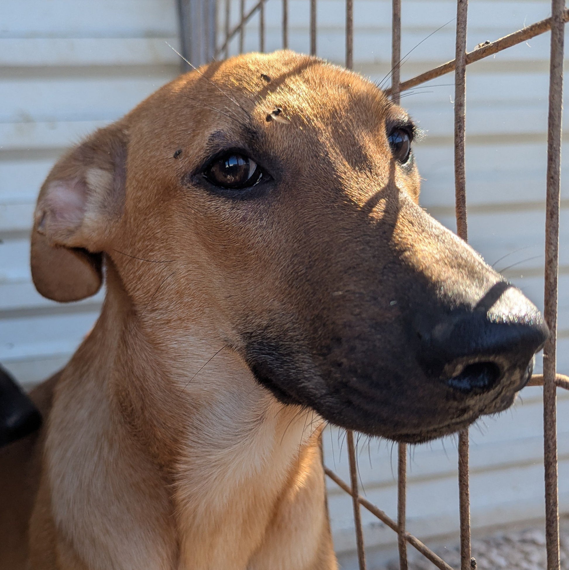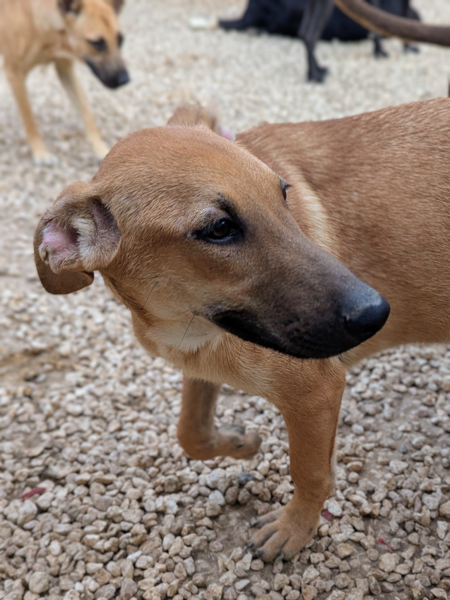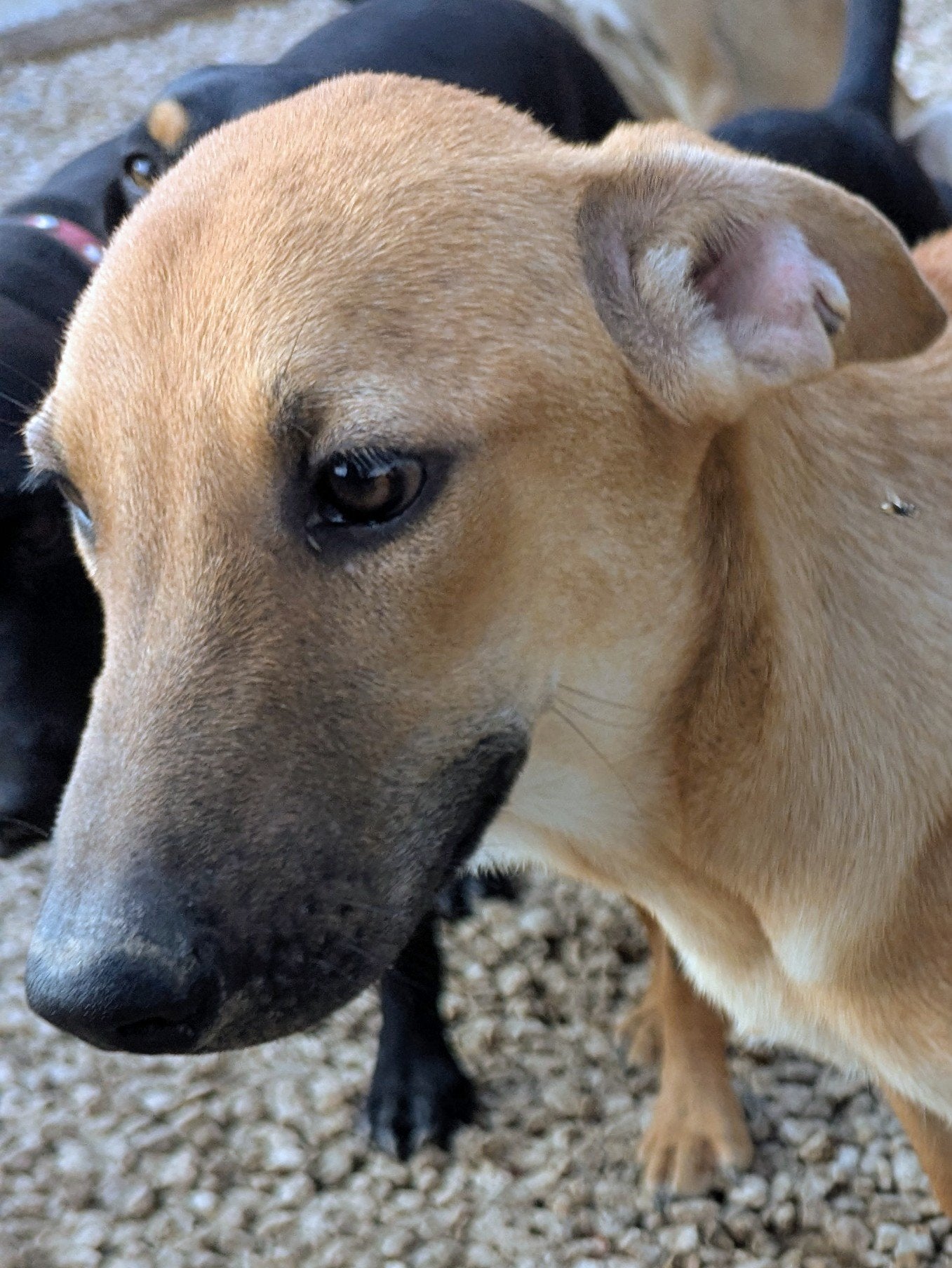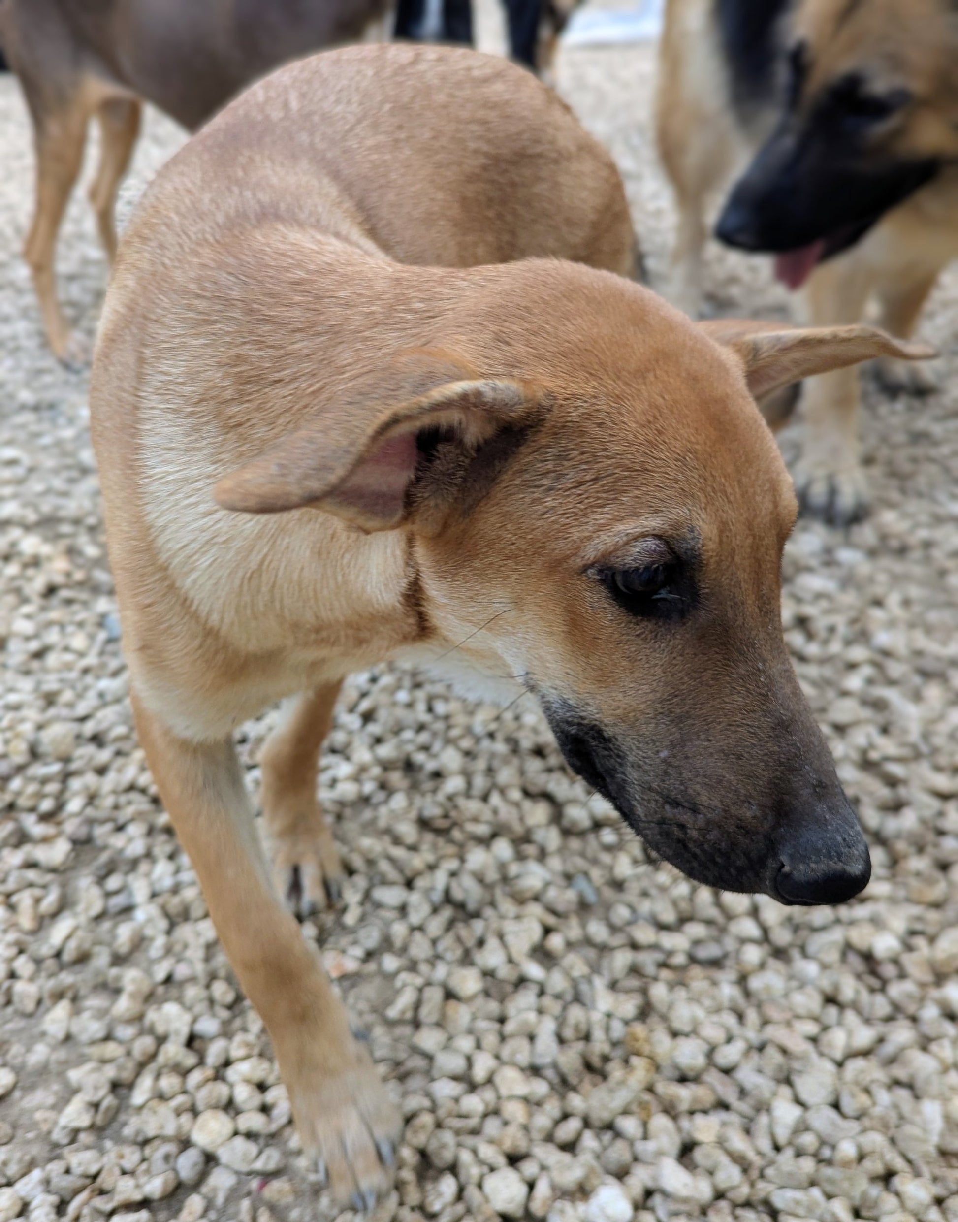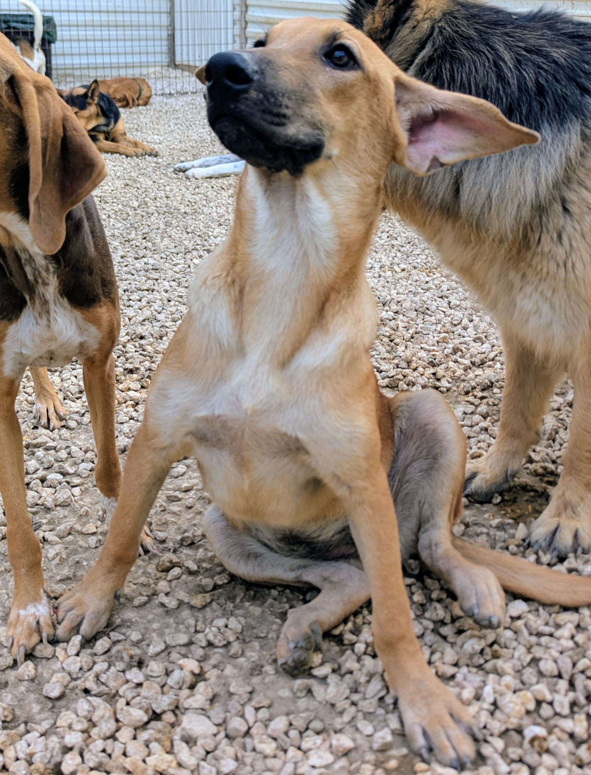 Medium-sized young female. Mixed breed, smooth tan coat with little beige and dark face. Friendly and affectionate