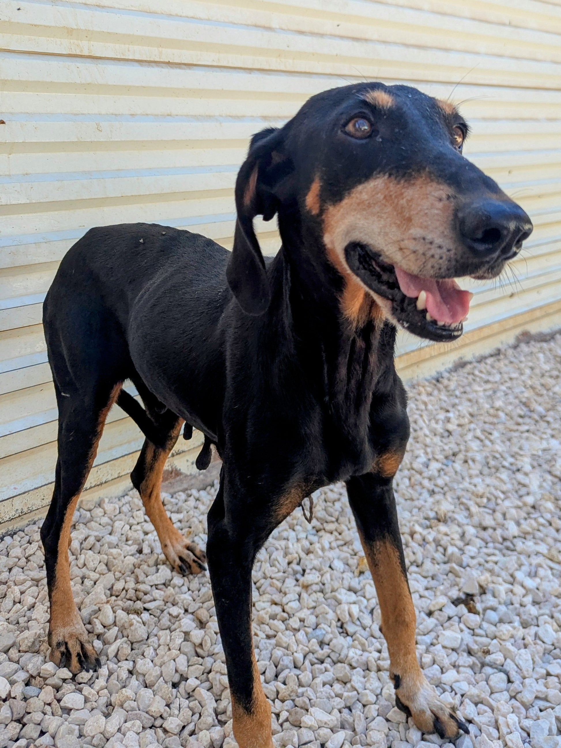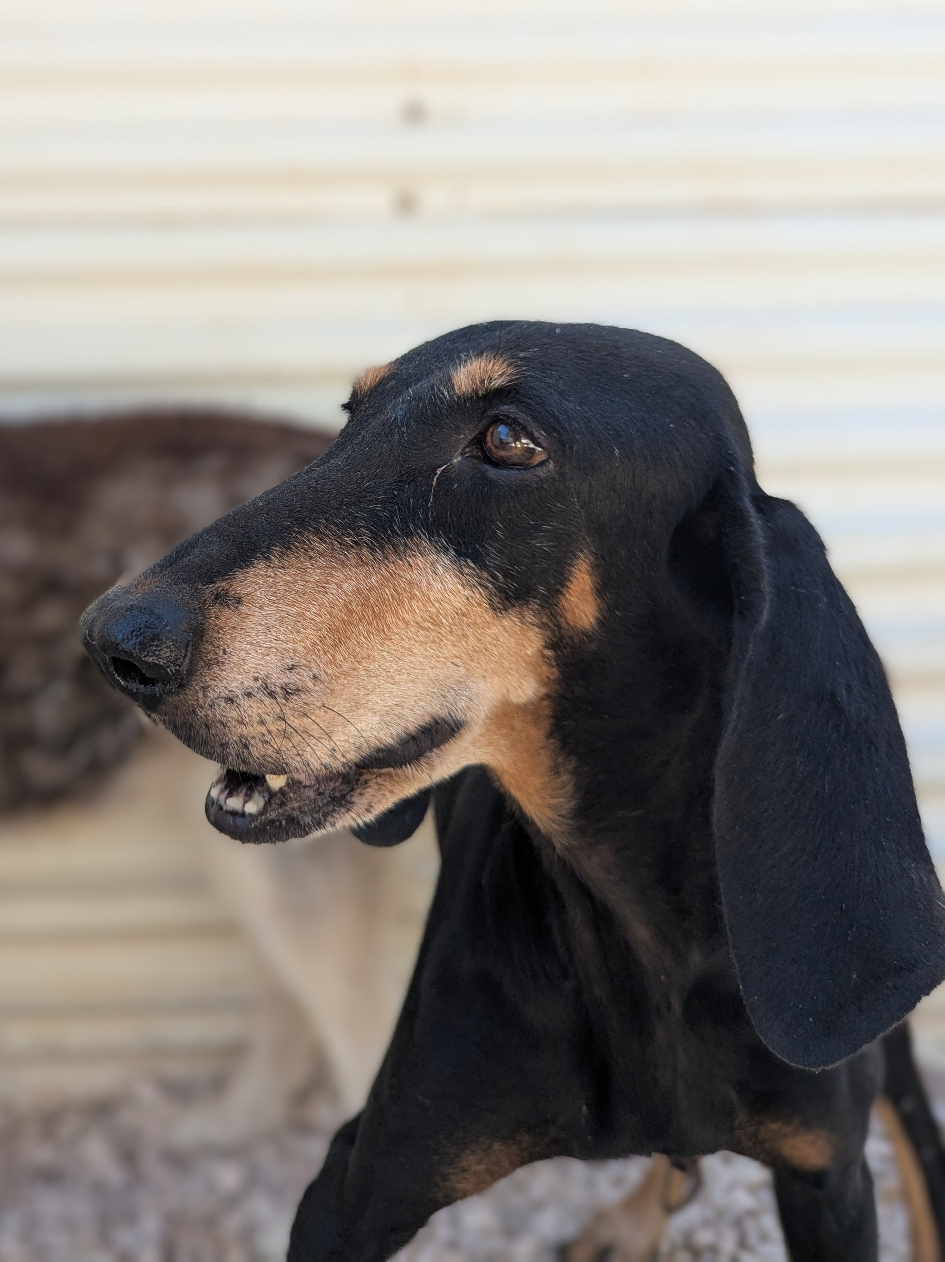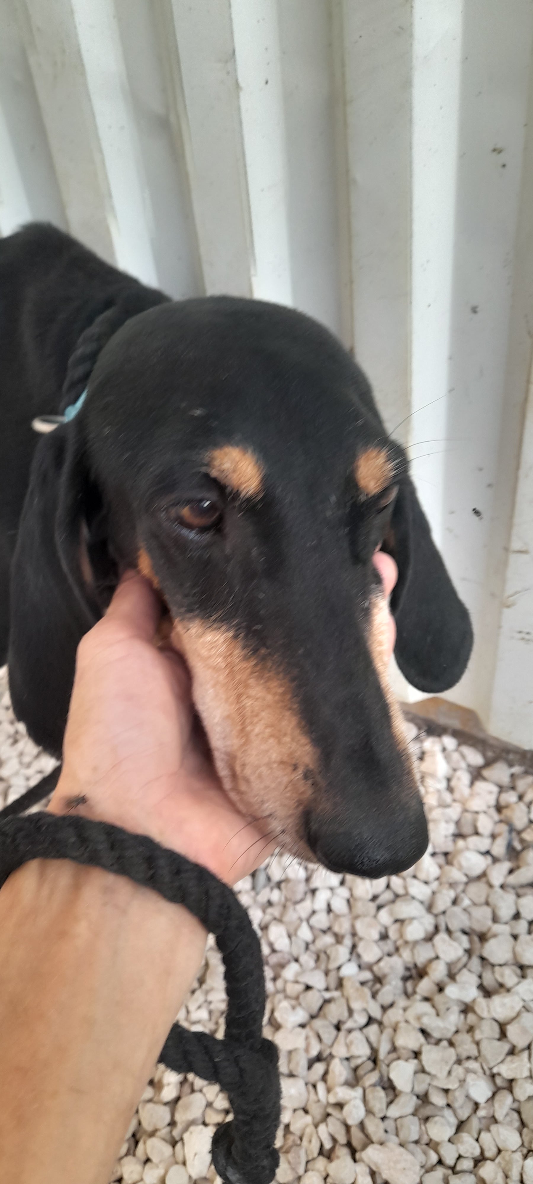 Older hound, looks like abused for breeding. Lovely nature, beautiful long ears, shy with other dogs.