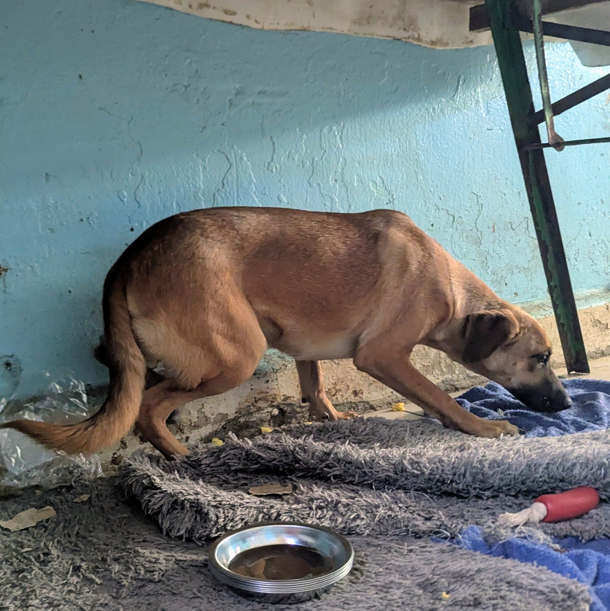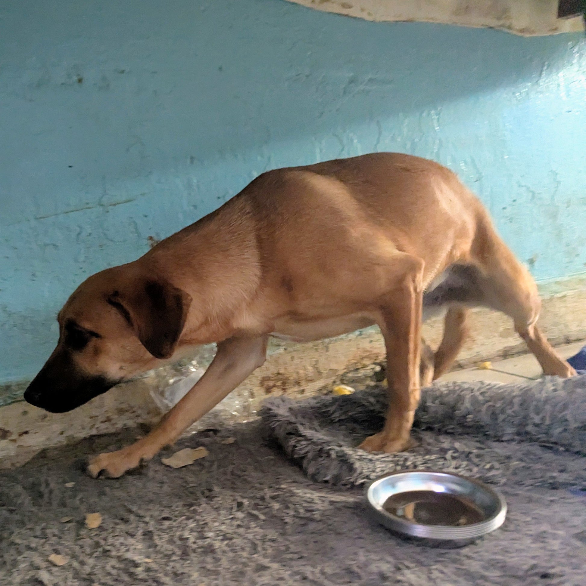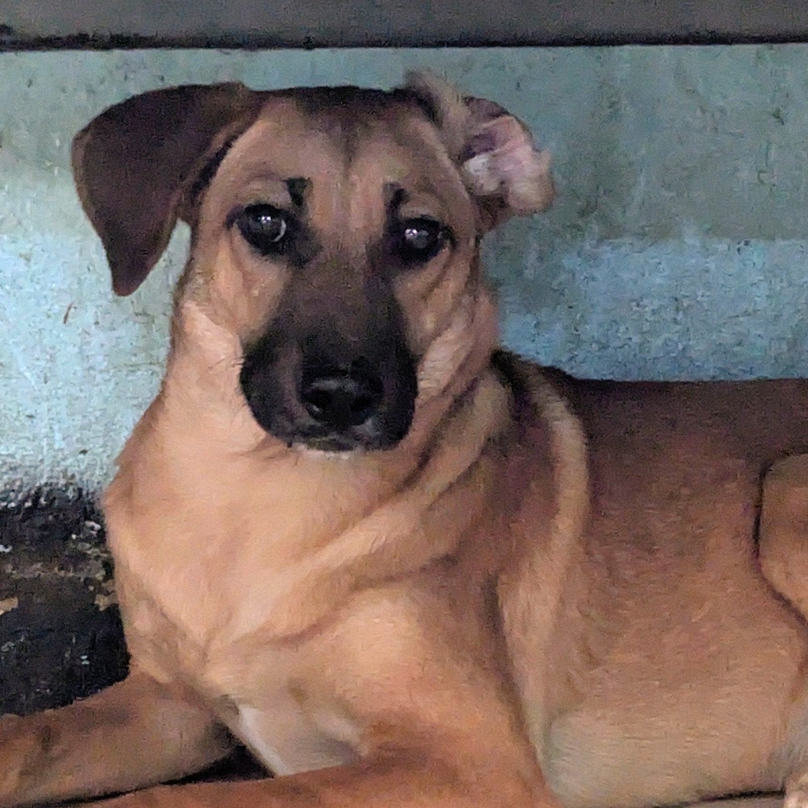 Medium-sized young mixed breed female, tan with little black. Extremely timid