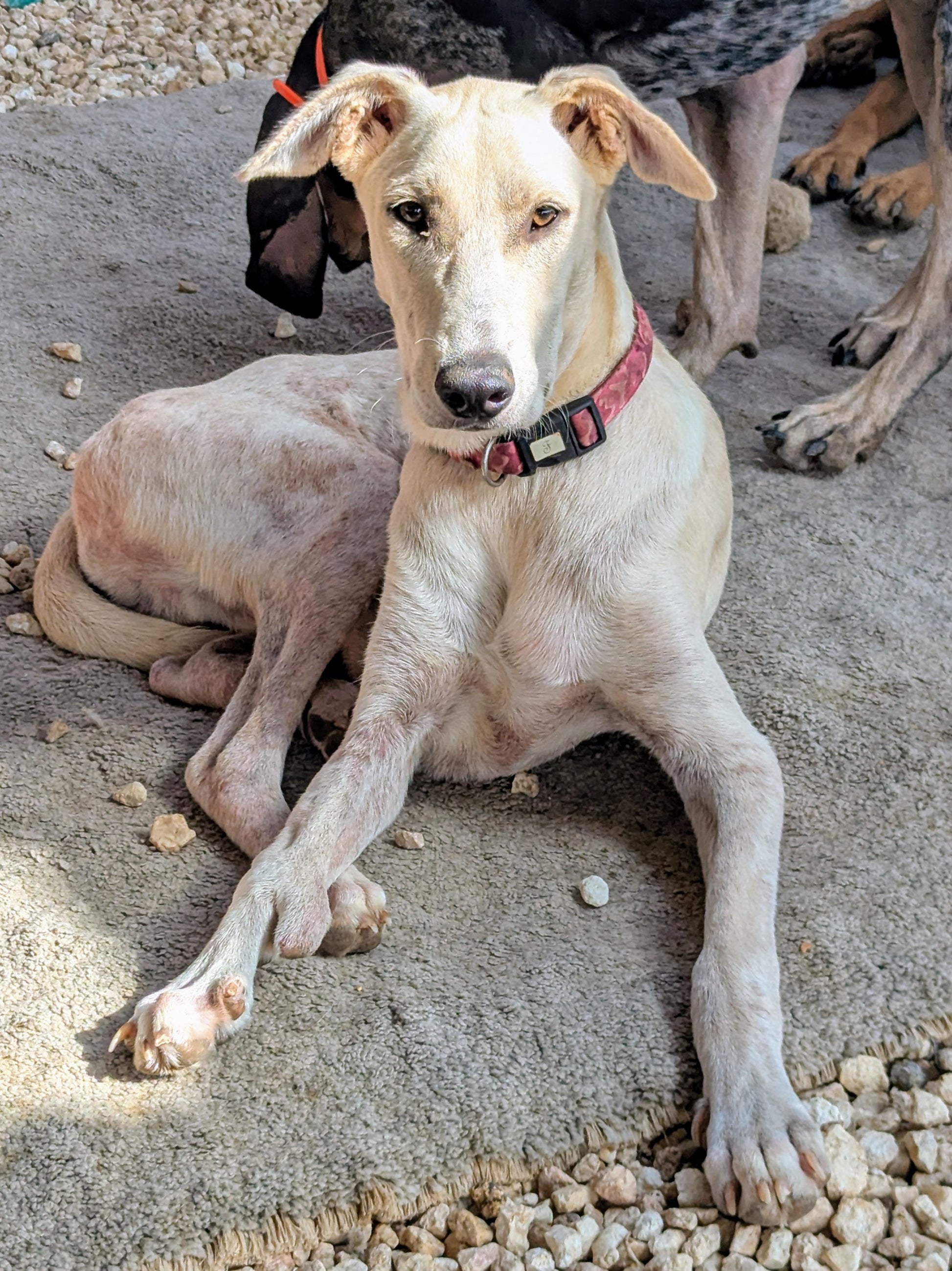 Medium-sized young male with a white coat and his own little twist – his front leg healed in a quirky way after a break. Cute, gentle and friendly